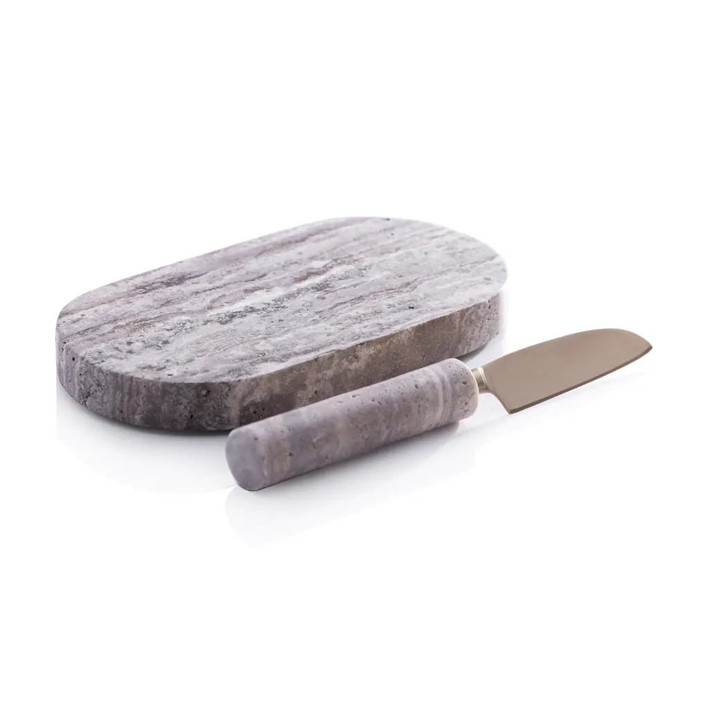 Enhance your kitchen experience with this premium marble cutting board, meticulously crafted from satin-finish marble. Its smooth yet durable surface provides the perfect platform for slicing, dicing, and serving. Paired with a matte finish knife, this set exudes sophistication and functionality. A protective tip at the bottom ensures stability while safeguarding your countertops. Whether used for food prep or as a stylish serving piece, this board brings a timeless touch to your kitchen. Features: Premium satin-finish marble with natural veining Protective tip at the bottom to prevent slippage and surface damage Perfect for entertaining, slicing, and serving Ideal for serving cheeses, charcuterie, or prepping ingredients Tray: 8"x 4" x 1"; Knife: 7.75" long x 1" wide; Assembled: 8" x 4" x 2" Variations in veining and color li>