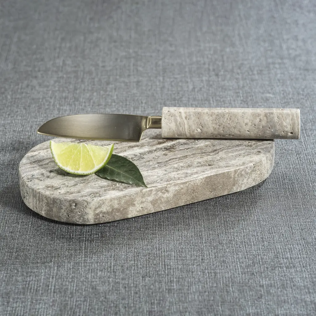 Albora Marble Cutting Board With Knife - Beige Travertine With Gold Knife