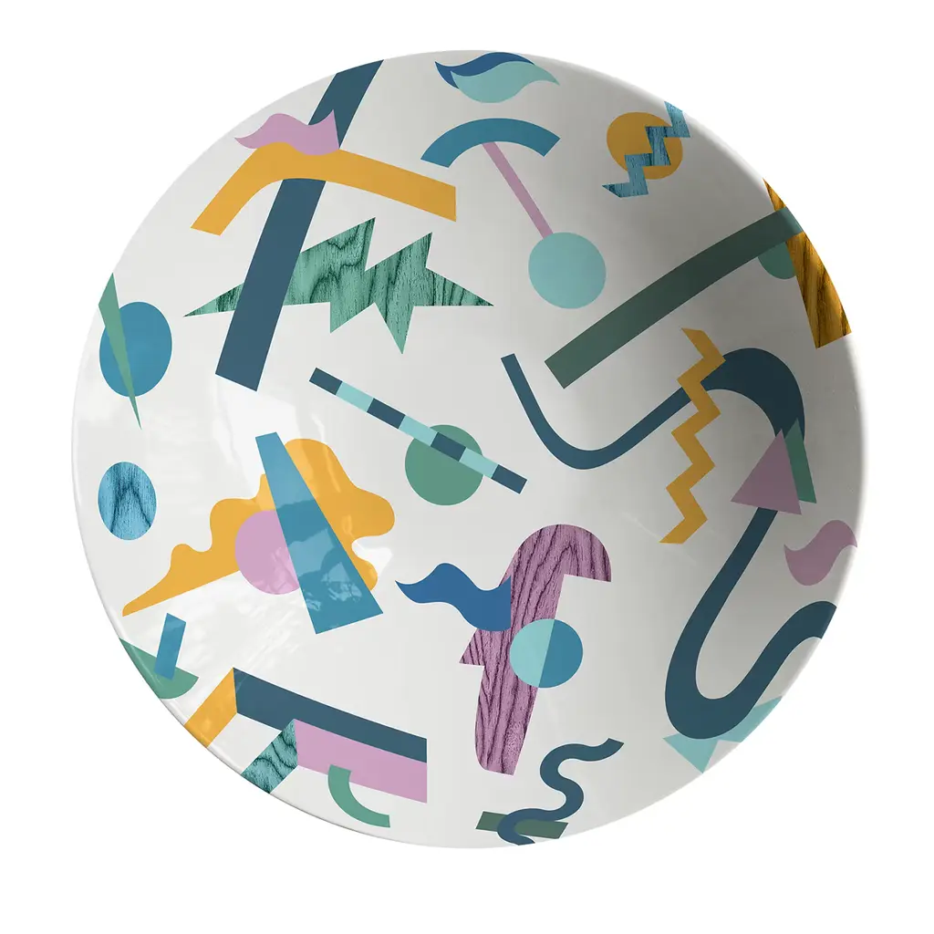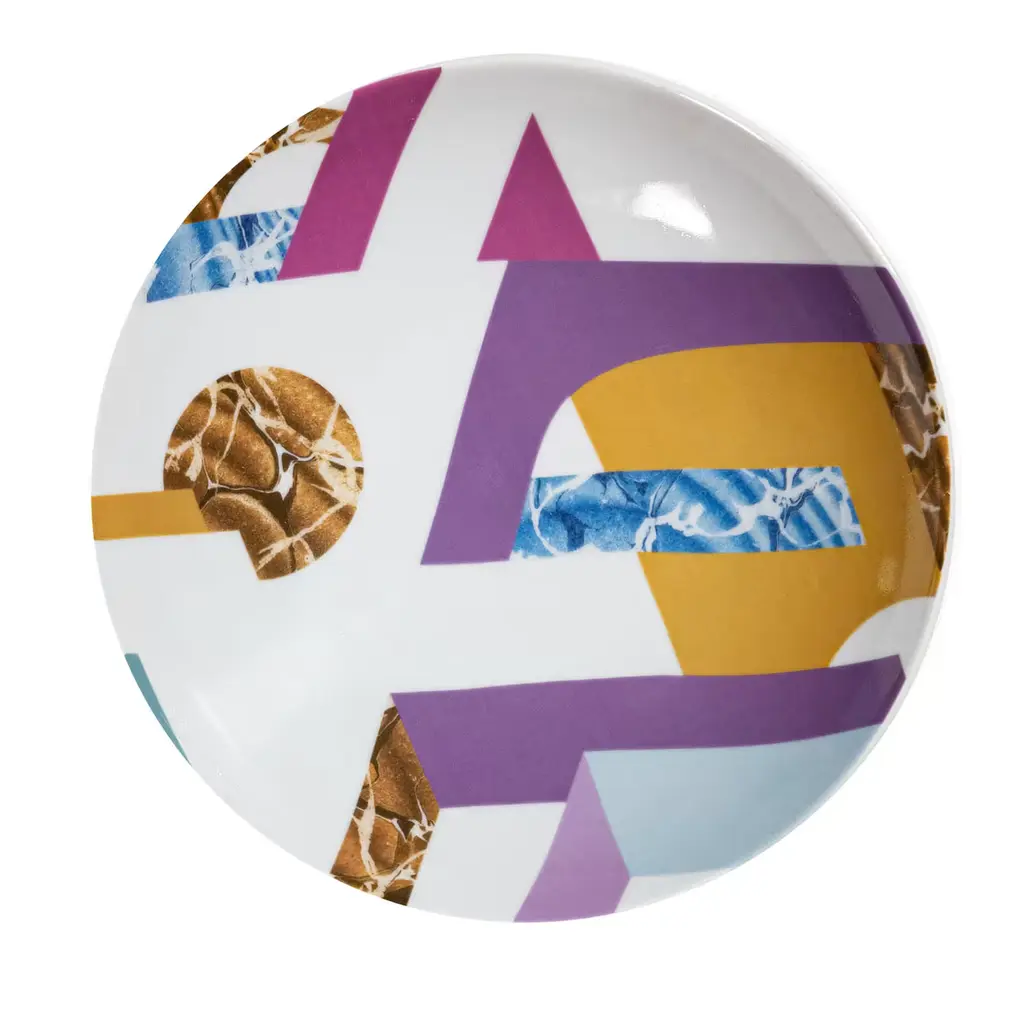 Vito Nesta and Alessandro Guerriero have created the Alchimie collection for the Grand Tour brand. This collection immortalizes many products influenced by the founder of the 1976 Alchimia studio. Vibrant colors, strong contrasts, and geometric and abstract shapes interlock, creating small universes of visual beauty. Different textures enhance the flat-color designs, making them more eye-catching and fun. This serving plate is one of six that make up the collection.