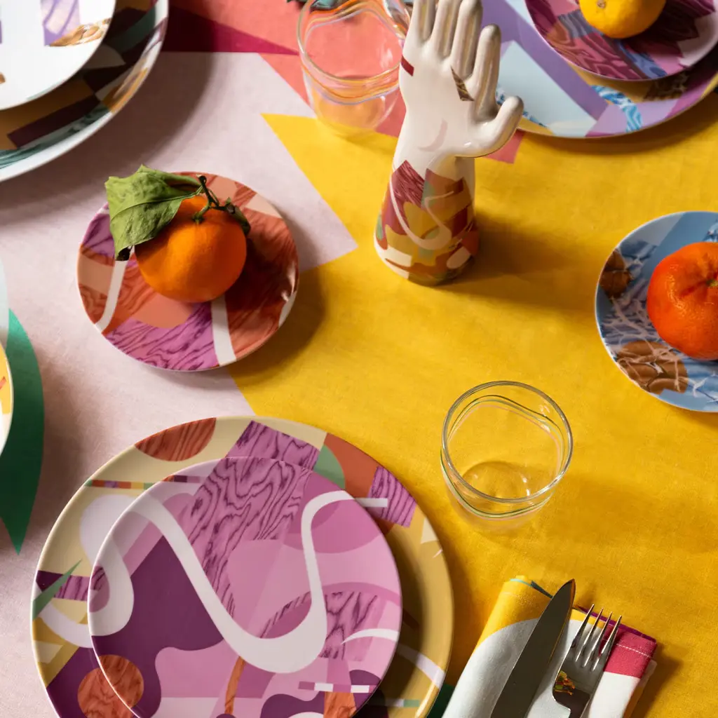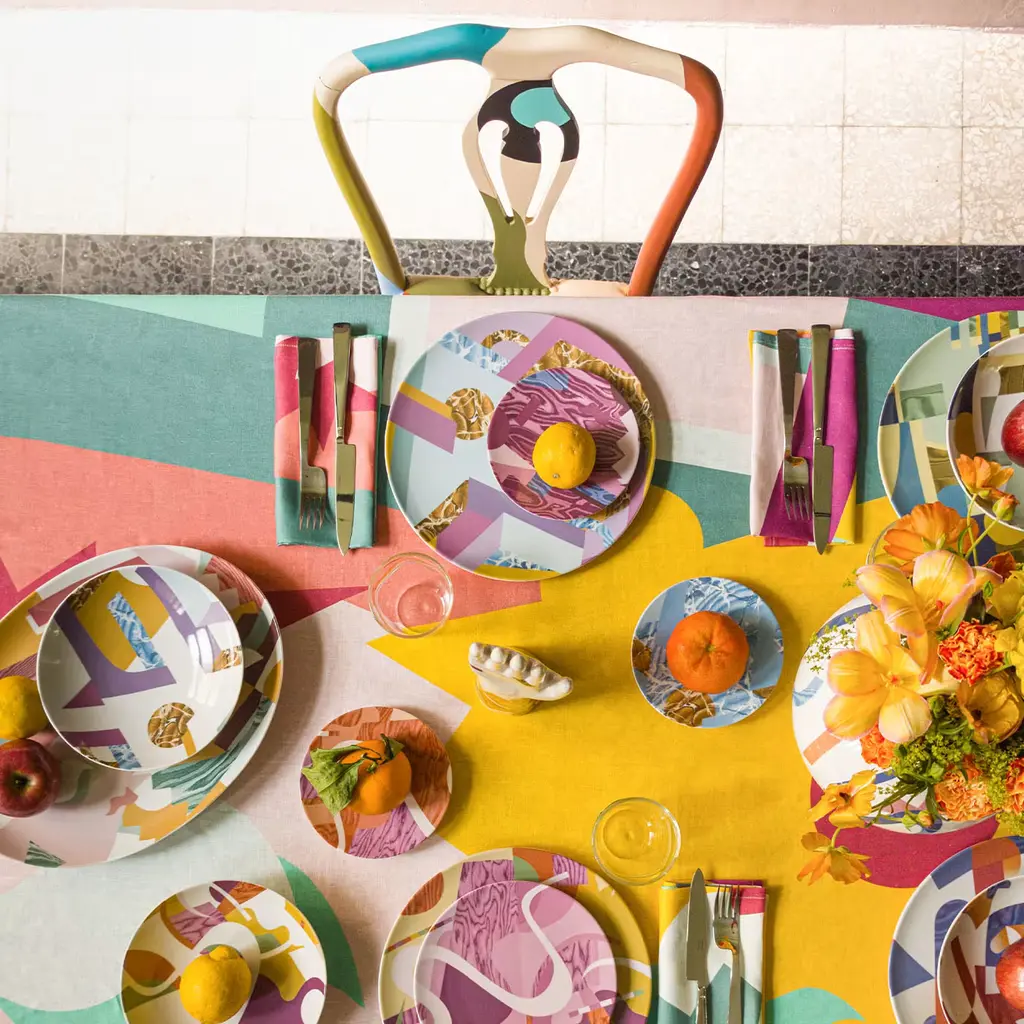 Vito Nesta and Alessandro Guerriero have created the Alchimie collection for the Grand Tour brand. This collection immortalizes many products influenced by the founder of the 1976 Alchimia studio. Vibrant colors, strong contrasts, and geometric and abstract shapes interlock, creating small universes of visual beauty. Different textures enhance the flat-color designs, making them more eye-catching and fun. This bread plate is one of six that make up the collection.