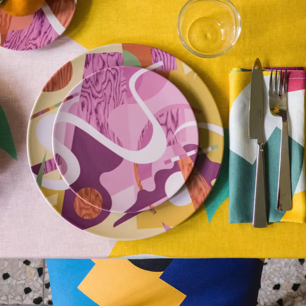 Vito Nesta and Alessandro Guerriero have created the Alchimie collection for the Grand Tour brand. This collection immortalizes many products influenced by the founder of the 1976 Alchimia studio. Vibrant colors, strong contrasts, and geometric and abstract shapes interlock, creating small universes of visual beauty. Different textures enhance the flat-color designs, making them more eye-catching and fun. This dessert plate is one of six that make up the collection.