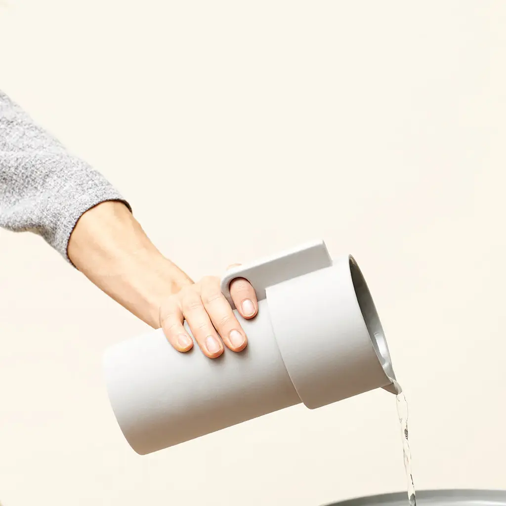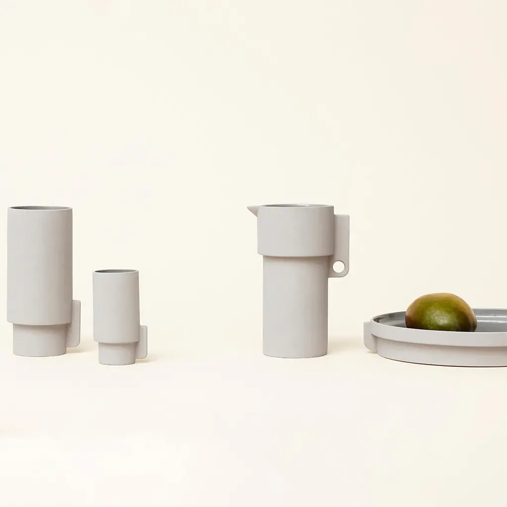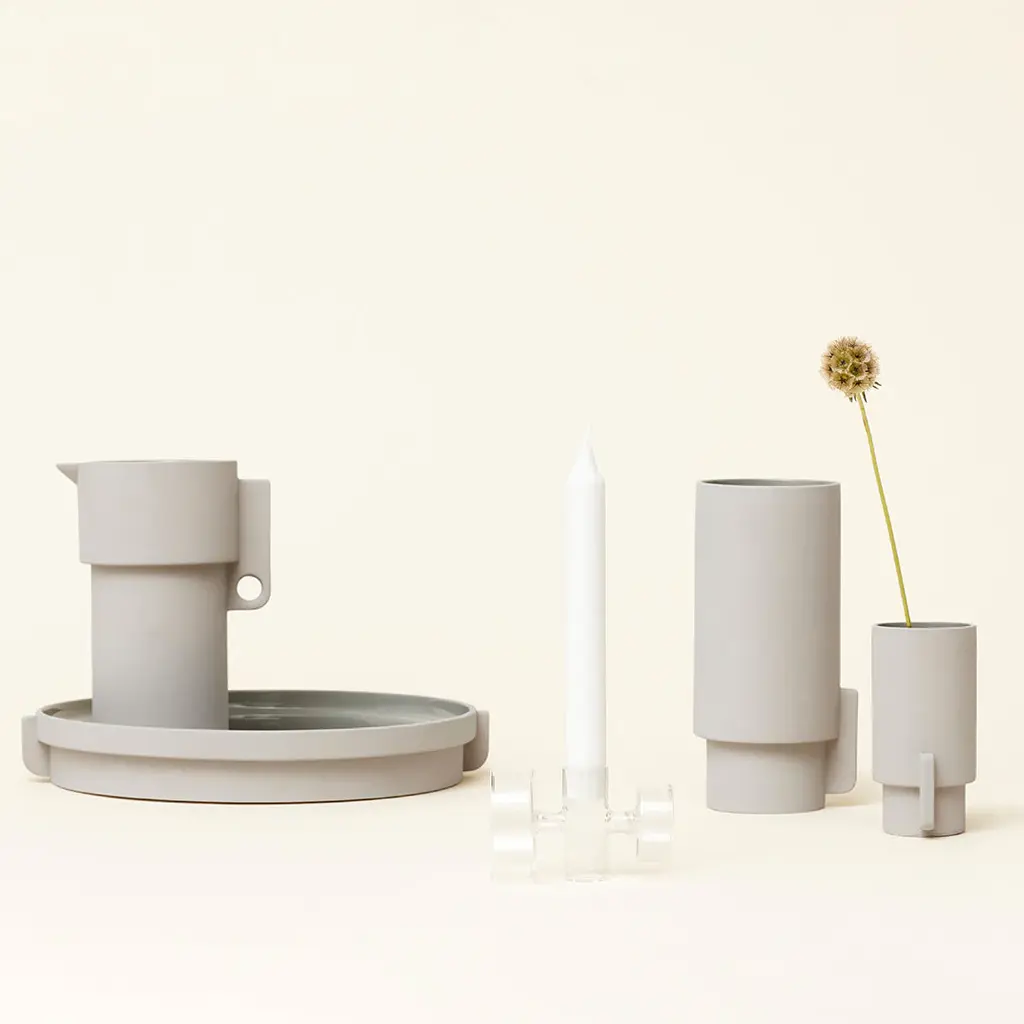 The Alcoa ceramics line stands out. It is clear and simple in form. The handle creates a functional and recognizable expression for the line. The surface is a balanced matte grey on the outside and a high gloss grey on the inside to give a subtle contrast. The name Alcoa refers to the region Alcobaça in Portugal where the ceramics hail from. The region has a natural richness of fine white clay which has cradled a culture of pottery. The Alcoa ceramics line consists of vases in two sizes, a pitcher and a tray . "We took an analytical approach to the design, by applying to contrast properties of forms and colors. This is evident in the geometric lines that form the objects and the c ontrast used in the finished glaze with matte and high gloss." - Herman Studio