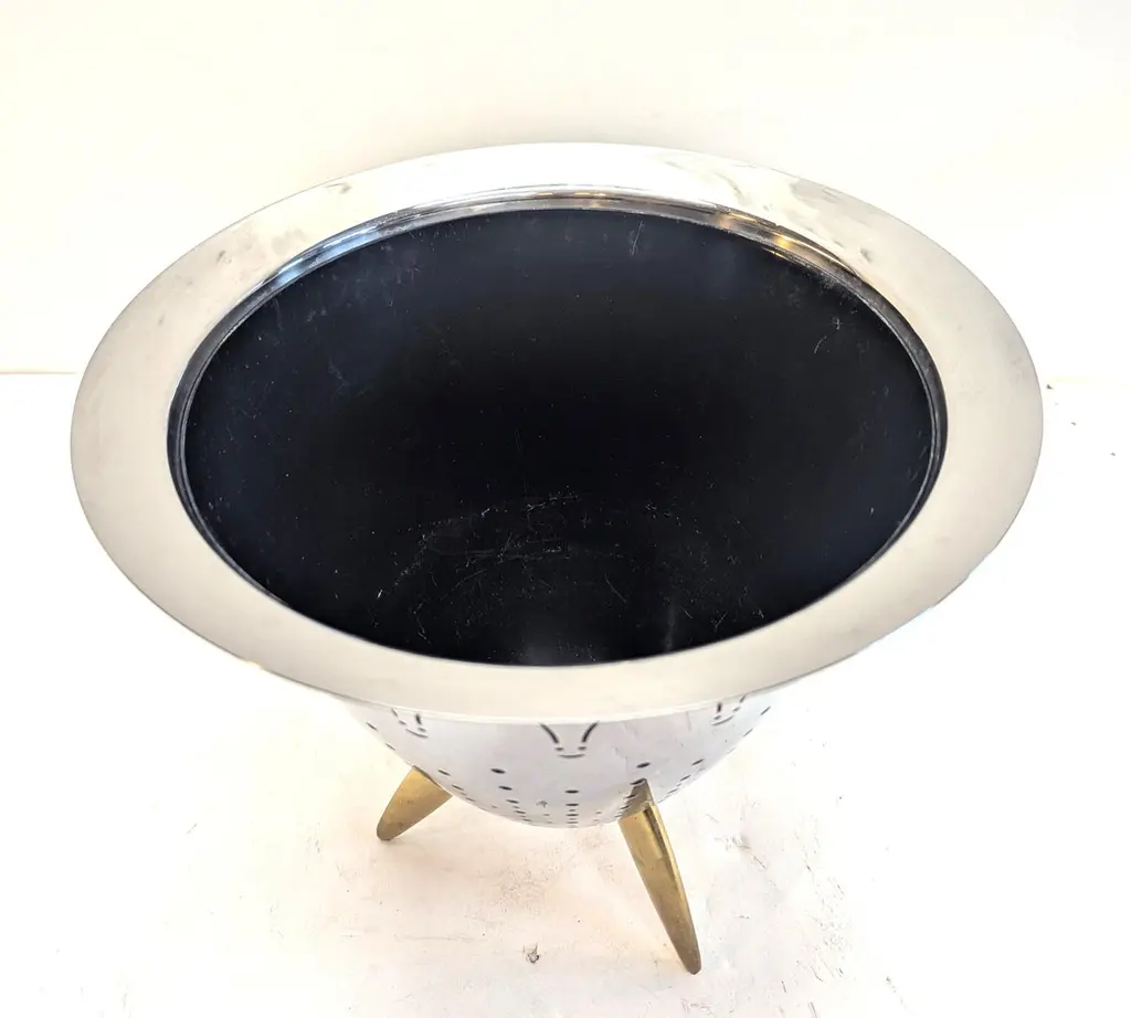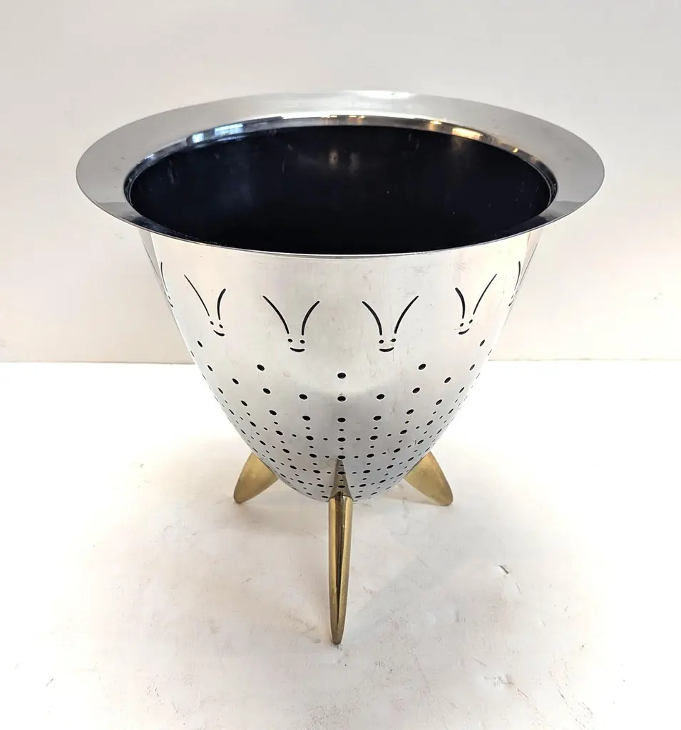 Vintage Philippe Starck for Alessi Ice Bucket Colander. Alessi Ice Bucket Colander designed by Philippe Strack for Alessi. A wonderful fun piece can be used as Ice Bucket, Colander, or planter. Complete with black plastic watertight insert. A great addition to any barware, or table service. Composed of stainless steal with brass legs. In very good vintage condition. Some light light of use.