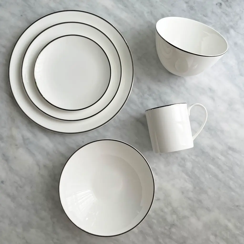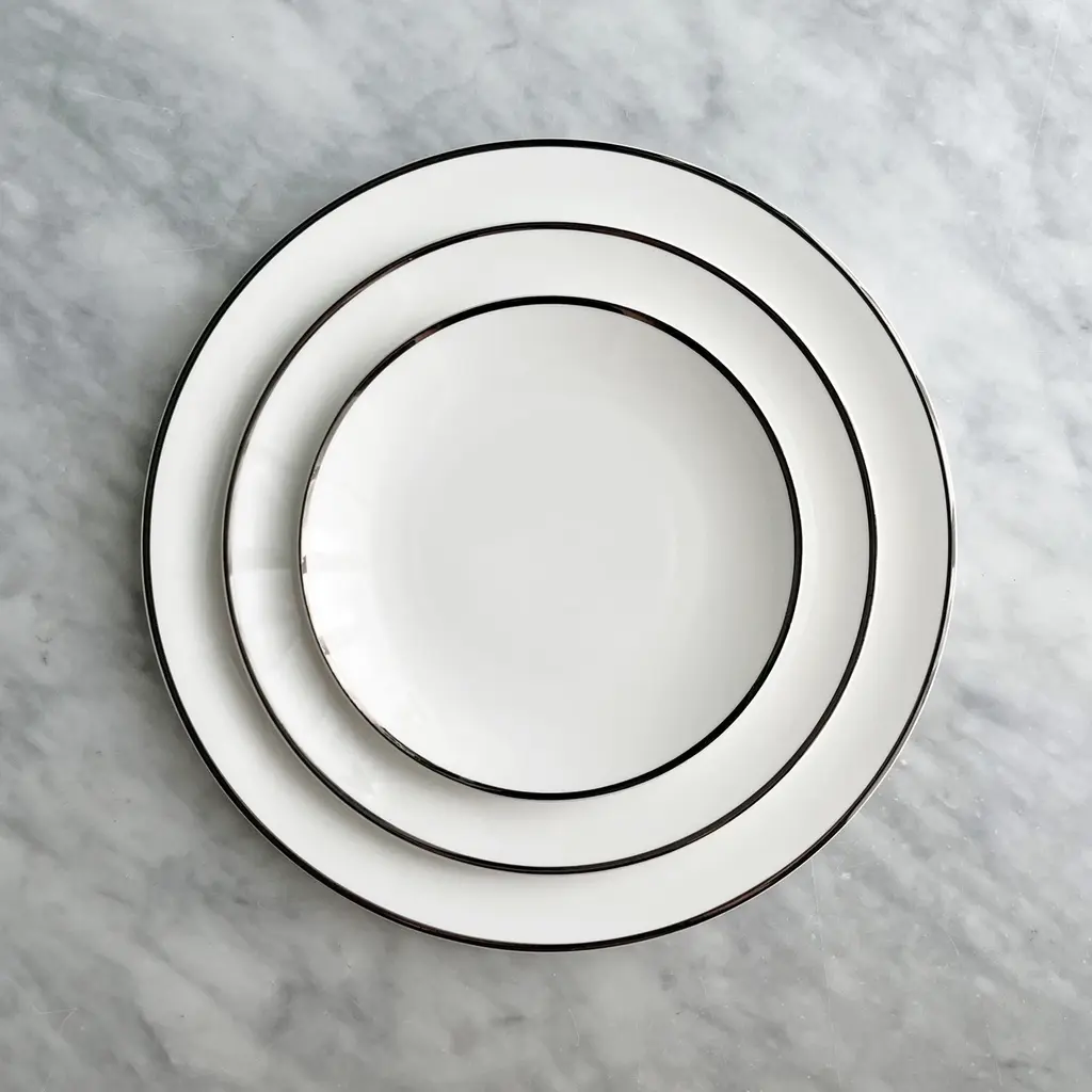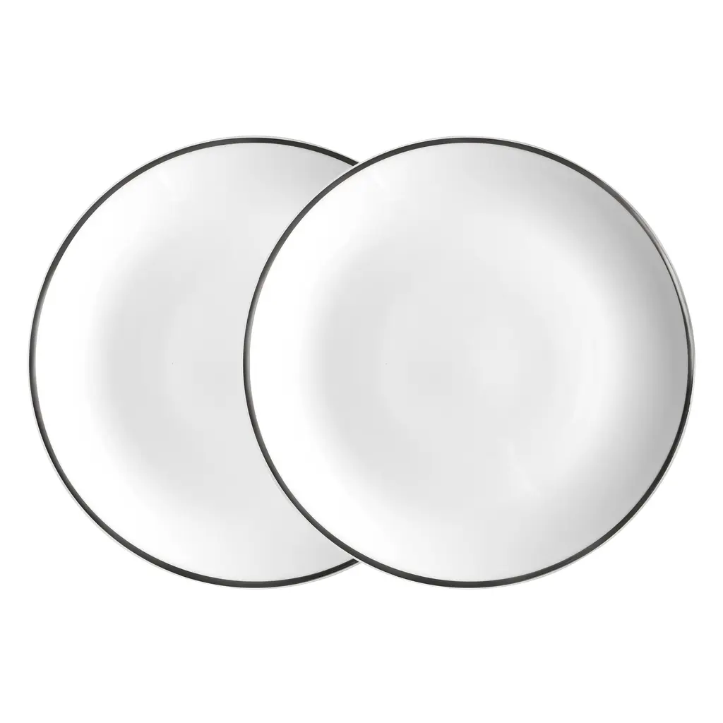 The Alex collection showcases the modern look of the classic Platinum on Fine Bone China combination with a thinner rim than the original Platinum Edge collection. Unlike previous Platinum rim products, Alex Platinum products are microwave safe increasing convenience and versatility to accommodate our fast-moving environment.This product is ideal as a salad/dessert plate.Set of two plates per box.Fine Bone China.