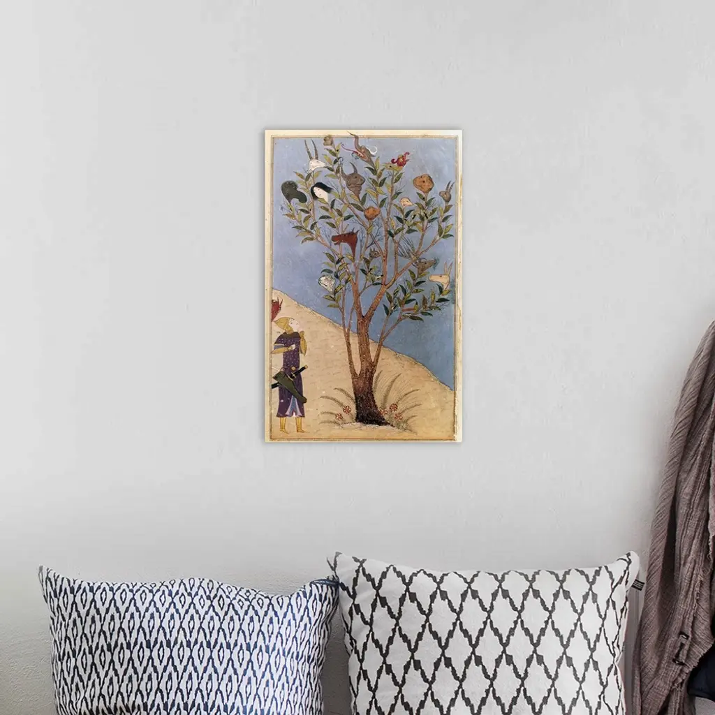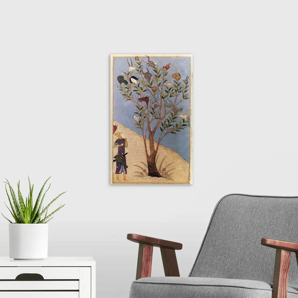 Alexander the Great contemplates the Talking Tree during the end of his travels. Illumination from a Timurid Shanameh, from Shiraz,c1430.