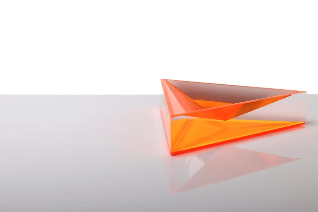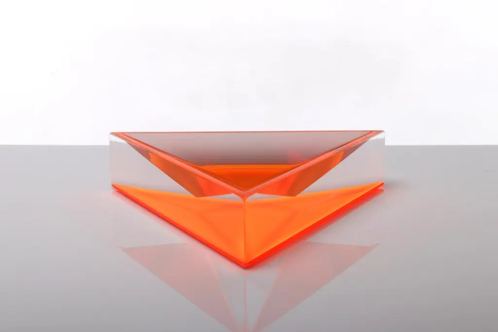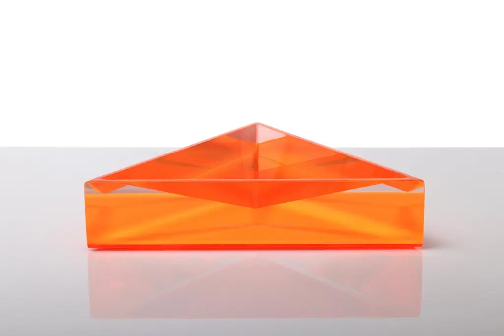 Elevate your interior with this striking modern decorative bowl by renowned designer Alexandra von Furstenberg. Crafted from high-quality Lucite, this piece exemplifies AVF's signature style—sleek, vibrant, and boldly architectural. The Acrylic Delta Dish in Orange sculptural silhouette and precision-cut facets catch and refract light, creating a dynamic interplay of color and clarity from every angle.
