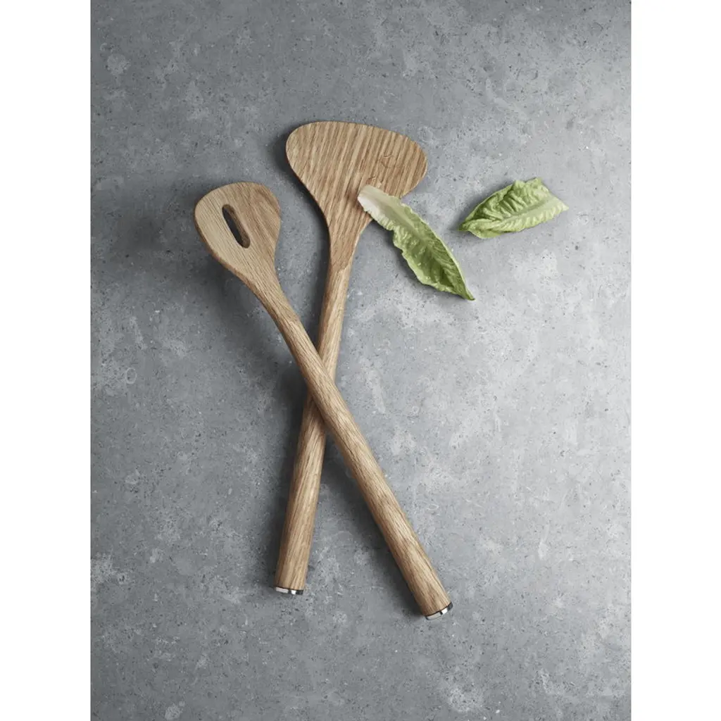 Georg Jensen's Alfredo salad servers are made of oak, and their ends have been finished with stainless steel plates. The salad servers go beautifully together with Georg Jensen's hollowware, and their simplistic design matches easily with all types of salad bowls. The soft and flowing form of the salad servers was created by designer Alfredo Häberli.