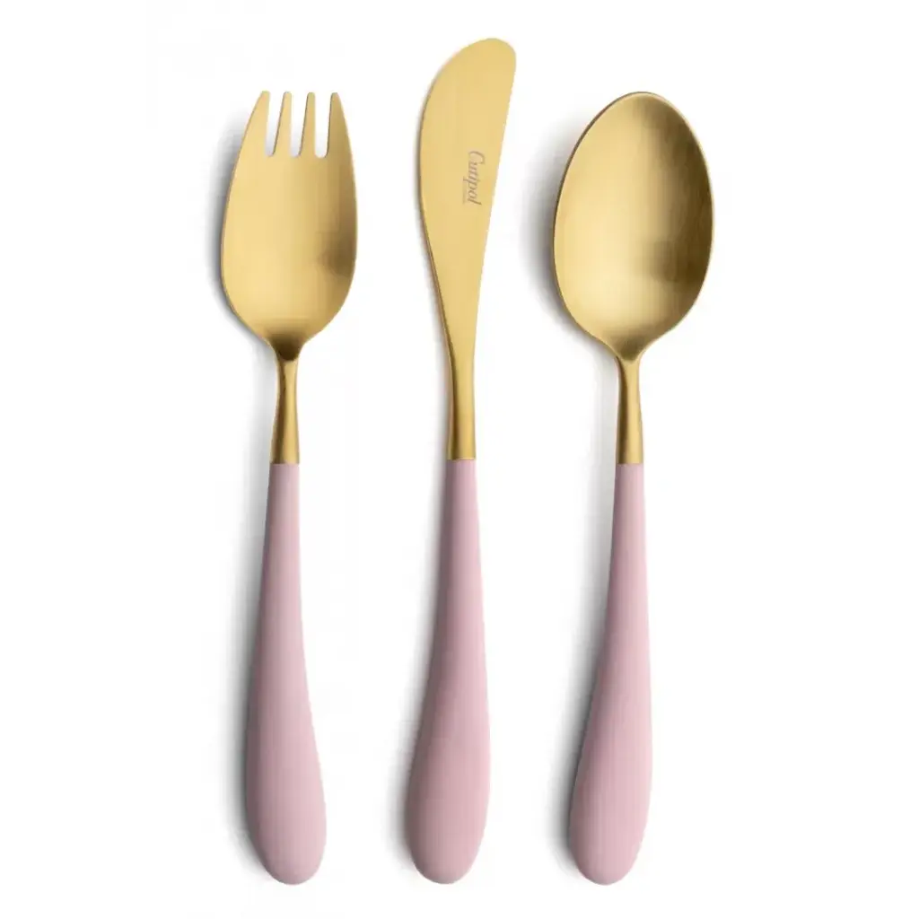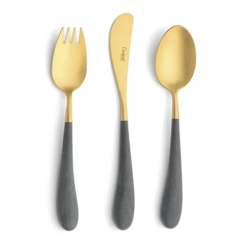 Design José Joaquim Ribeiro. Based in Portugal, Cutipol produces refined collections of flatware that are both practical and beautiful to use. Favorites of designers and party planners worldwide, Cutipol flatware is available in a large range of finishes, including stainless steel, gold, copper, and black. Designed to teach table rituals to children, Alice helps to teach them to keep the fork in the left hand and the knife in the right hand. Gold pieces are coated with 24kt gold; rose gold pieces are coated with 18kt gold. Subtly ergonomic set of 3 pieces, with a resin handle available in different colors. Please allow 4 months for delivery.
