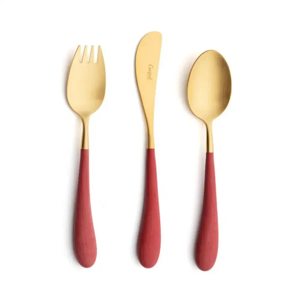 Design José Joaquim Ribeiro. Based in Portugal, Cutipol produces refined collections of flatware that are both practical and beautiful to use. Favorites of designers and party planners worldwide, Cutipol flatware is available in a large range of finishes, including stainless steel, gold, copper, and black. Designed to teach table rituals to children, Alice helps to teach them to keep the fork in the left hand and the knife in the right hand. Gold pieces are coated with 24kt gold; rose gold pieces are coated with 18kt gold. Subtly ergonomic set of 3 pieces, with a resin handle available in different colors. Please allow 4 months for delivery.