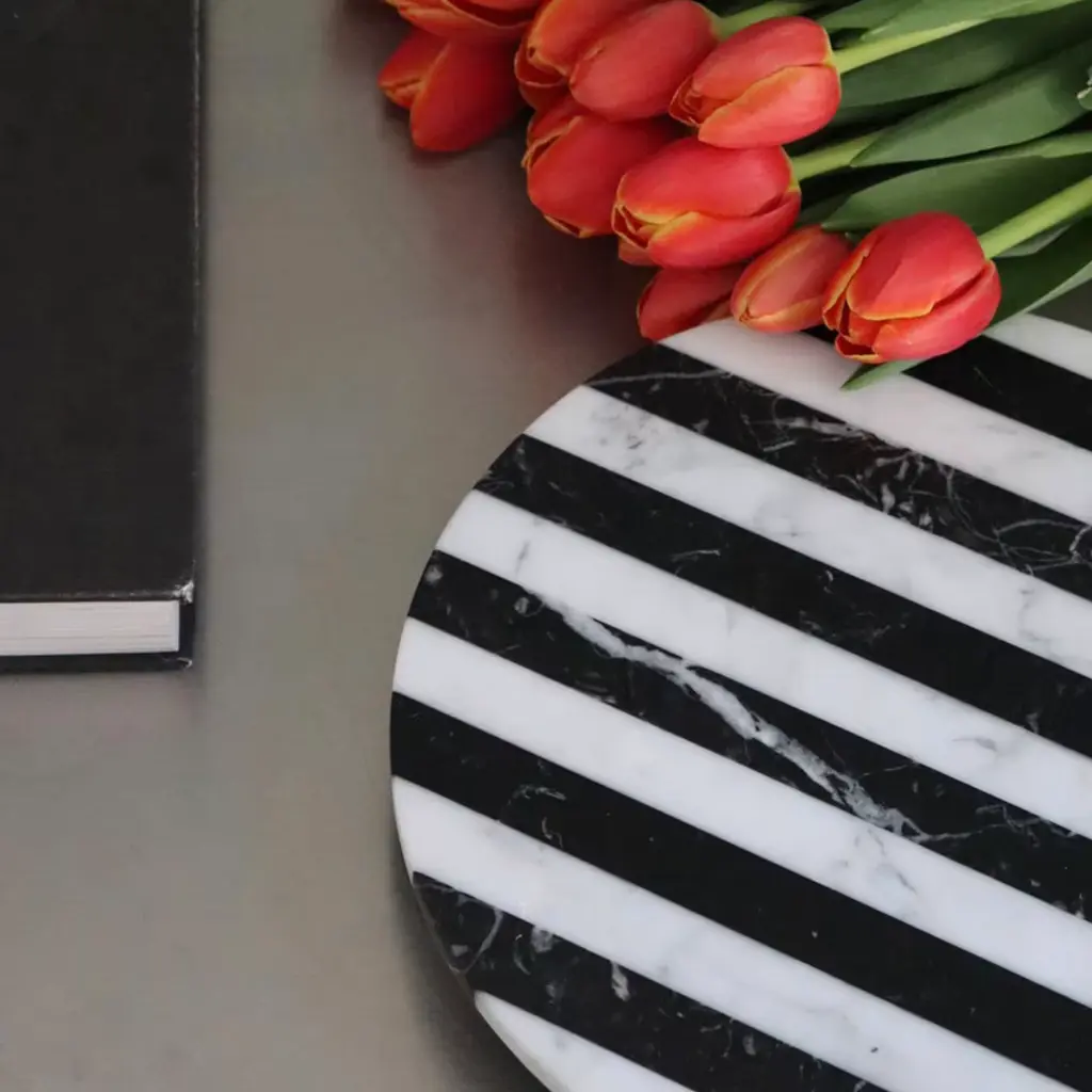A testament to harmony and streamlined design, this minimalist cake stand from the Alice Collection by Bethan Gray is a stunning work of functional decor. The low and wide silhouette is entirely fashioned of white Arabescato and black Marquina marbles, the striped pattern drawing inspiration from the 12th-century Cathedral in Siena, Italy. Marked by a highly functional and versatile design, this piece can be used as a cake stand, fruit display, or sculptural accent on a kitchen sideboard.