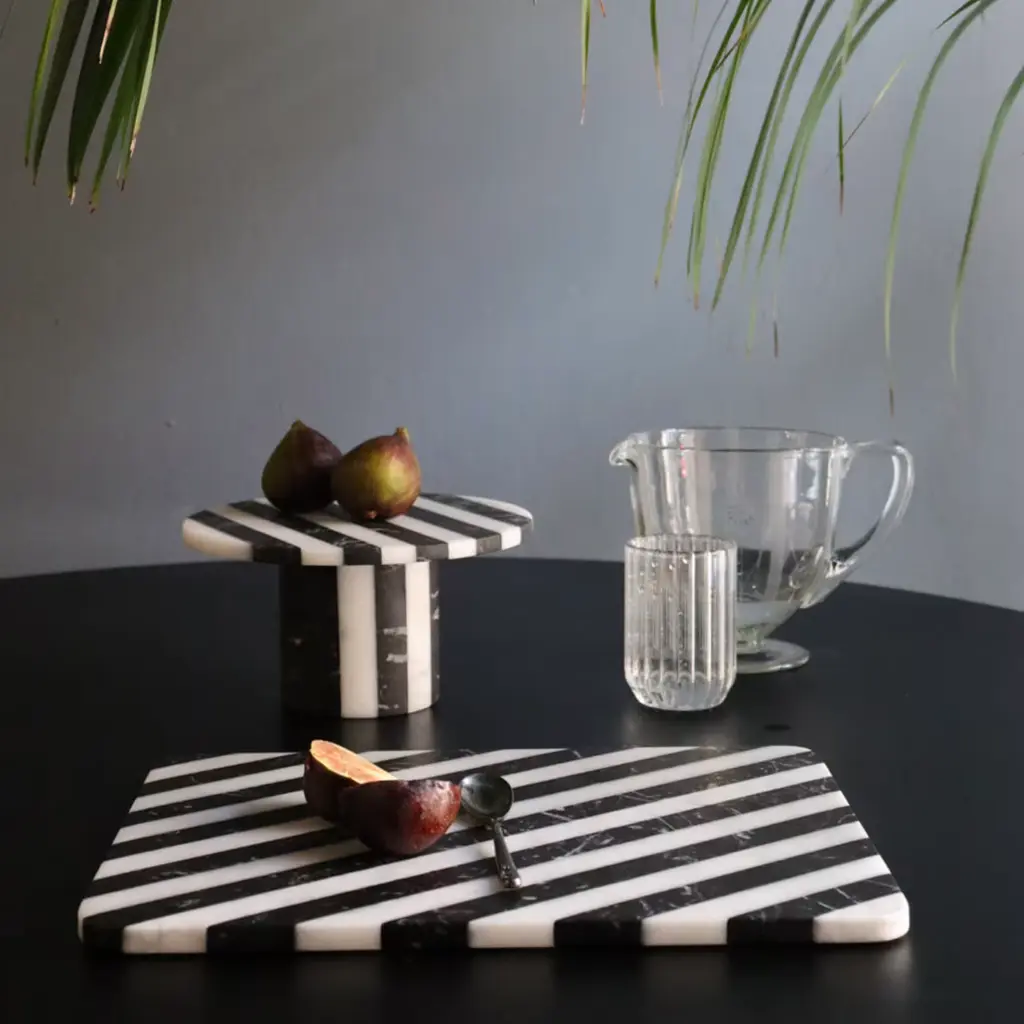 Envisioned and designed by Welsh artist Bethan Gray, this unconventional cake stand will be a bold accent piece in a kitchen or dining room decor. Inspired by ancient European stone architecture, the tall silhouette is handcrafted of white Arabescato and black Marquina marbles, the solid cylindrical base and flat circular top enhancing the alluring striped pattern. Used to display homemade cakes or seasonal fruits, this piece is will make a lovely housewarming present for loved ones.