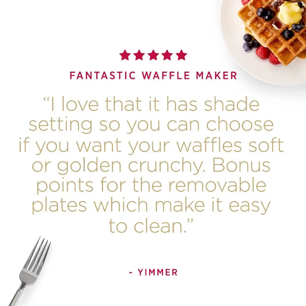 The Gourmet All-Clad Waffle Maker cooks 4 generous Belgian waffles at the same time. It features advanced heating technology for homogeneous browning; moreover, 6 levels of browning are possible. The steam release system prevents condensation buildup as waffles bake, for crispy outside and fluffy inside waffles. The ready to cook light signals when to add batter and the audible signal indicates when waffles are ready. The non-stick removable plates are easy to clean and are dishwasher safe. Also included is an overflow batter tray that can be placed at the back of the cooking plate to avoid messesAbout Us: For over 50 years, All-Clad has been crafting premium cookware in Canonsburg, Pennsylvania—the heart of America’s steel and aluminum industry. Founded in 1971, we draw on the region’s unmatched metalworking expertise to create fully bonded cookware known for its exceptional performance and lasting durability. Trusted by chefs and home cooks alike, All-Clad represents American craftsmanship at its finest designed to elevate every cooking experience for generations to come.