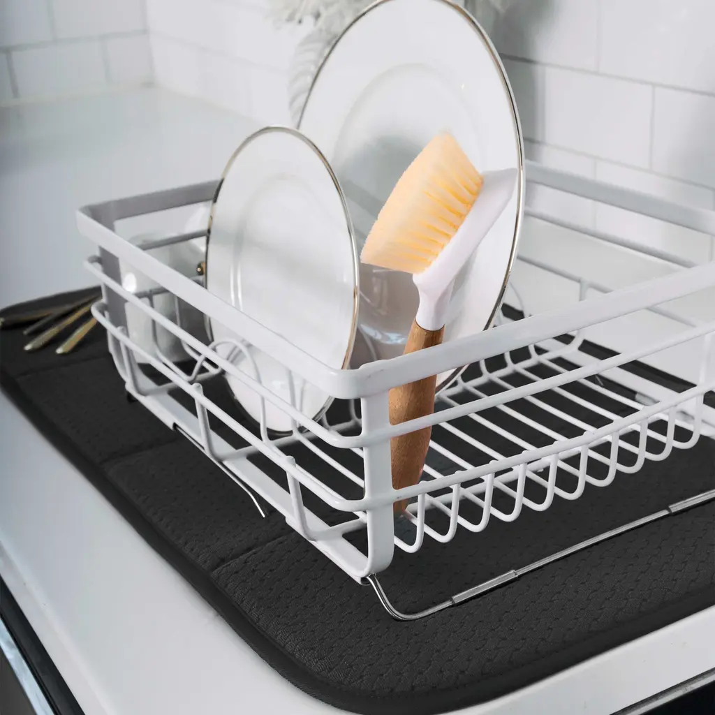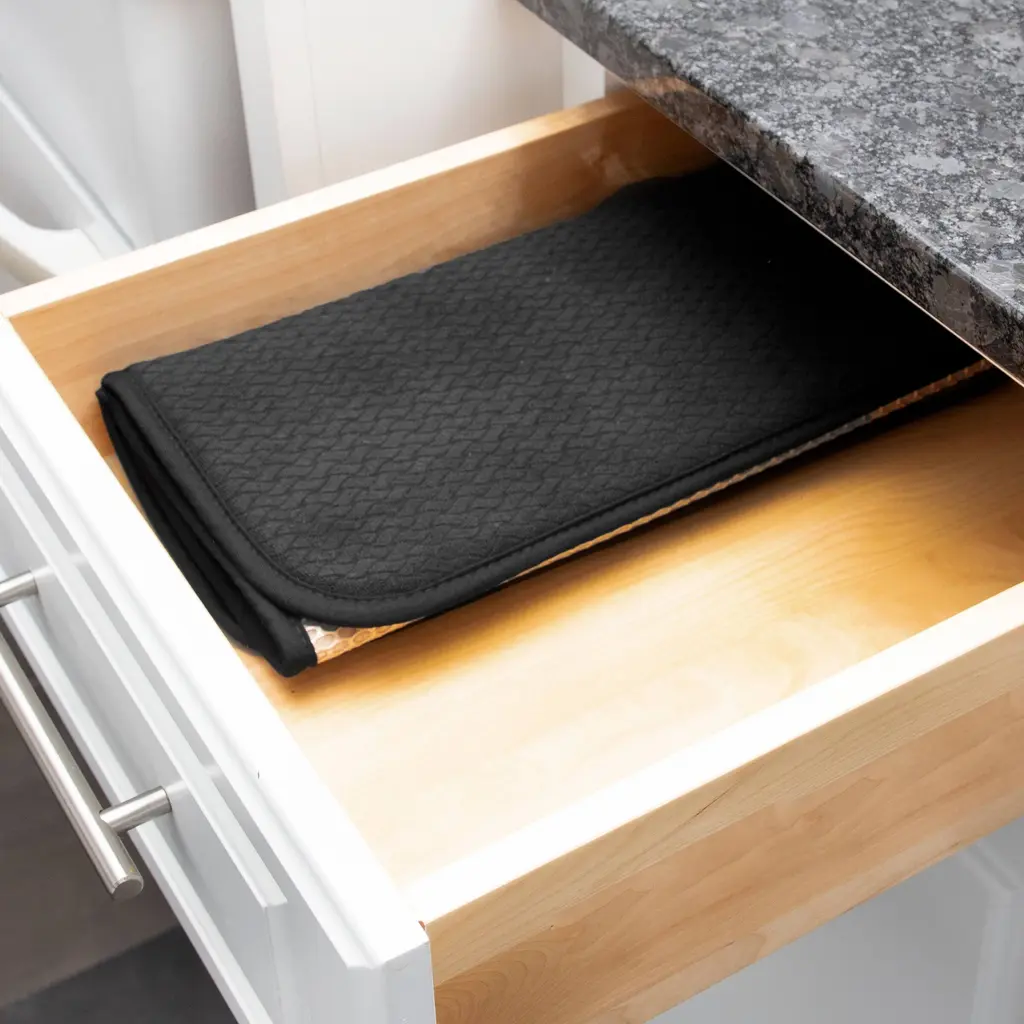 An essential for any kitchen, especially when space is at a premium, the All-CladⓇ Dish Drying Mat is a safe landing pad for wet dishes, glassware, and oversized pots and pans to ensure they remain free of chips and scratches. This durable oversized mat measures 16" in. x 28" in. (40 cm by 71 cm) and is designed with a super-absorbent thick foam that keeps counters dry while polyester mesh prevents condensation and fog build-up inside of glasses. All-CladⓇ Dish Drying Mats offer several folding options that allow for convenient storage and are available in a variety of stylish colors to compliment your taste. Machine wash for easy care.