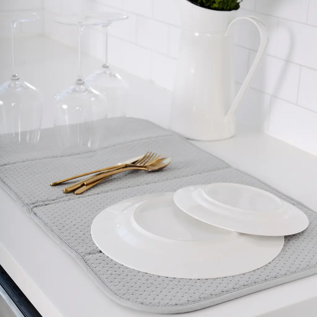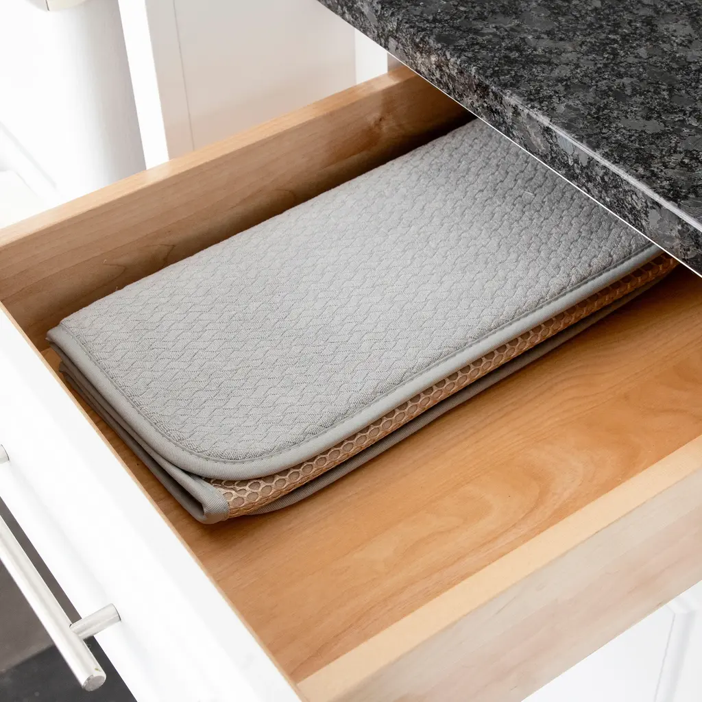 An essential for any kitchen, especially when space is at a premium, the All-CladⓇ Dish Drying Mat is a safe landing pad for wet dishes, glassware, and oversized pots and pans to ensure they remain free of chips and scratches. This durable oversized mat measures 16" in. x 28" in. (40 cm by 71 cm) and is designed with a super-absorbent thick foam that keeps counters dry while polyester mesh prevents condensation and fog build-up inside of glasses. All-CladⓇ Dish Drying Mats offer several folding options that allow for convenient storage and are available in a variety of stylish colors to compliment your taste. Machine wash for easy care.