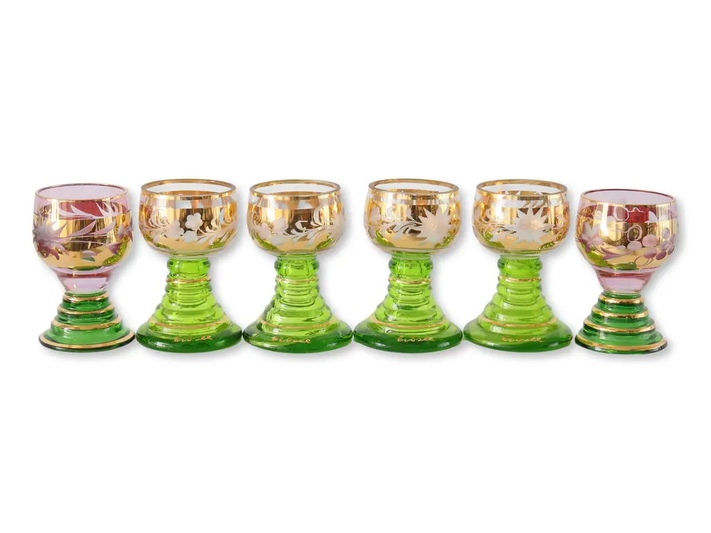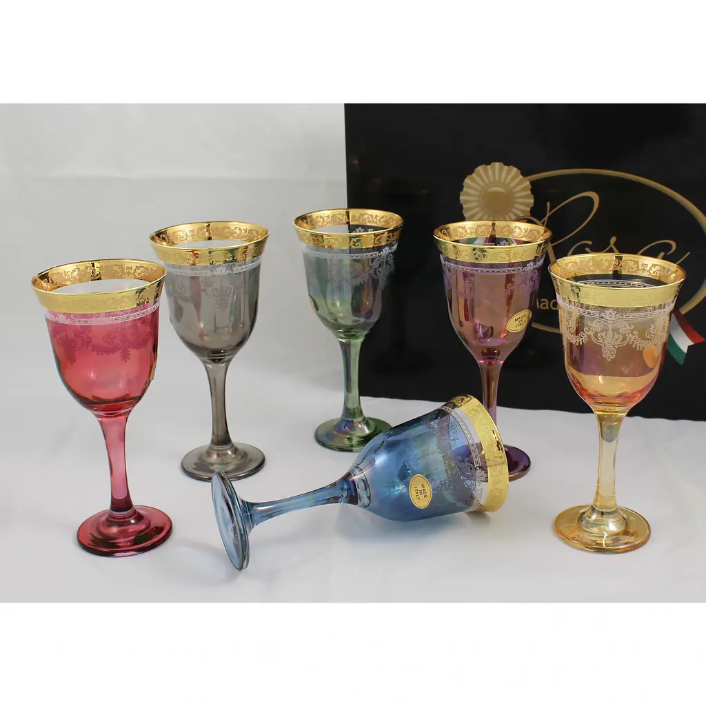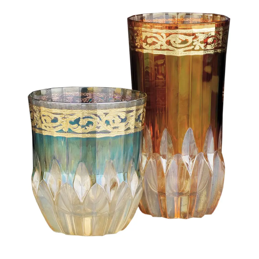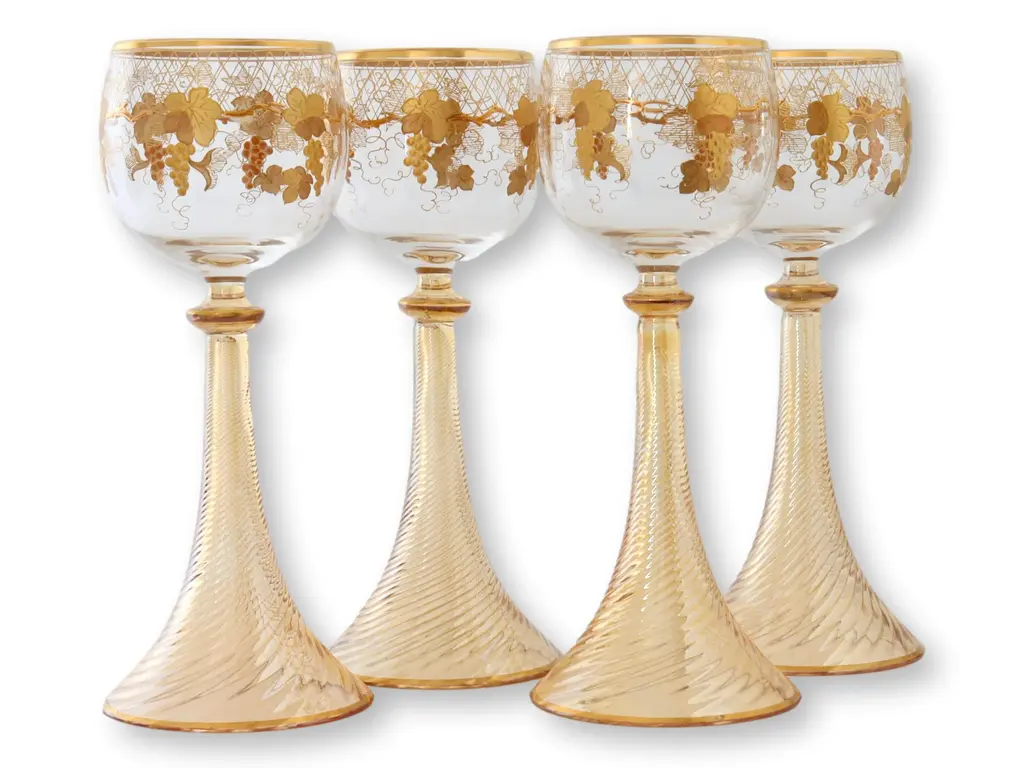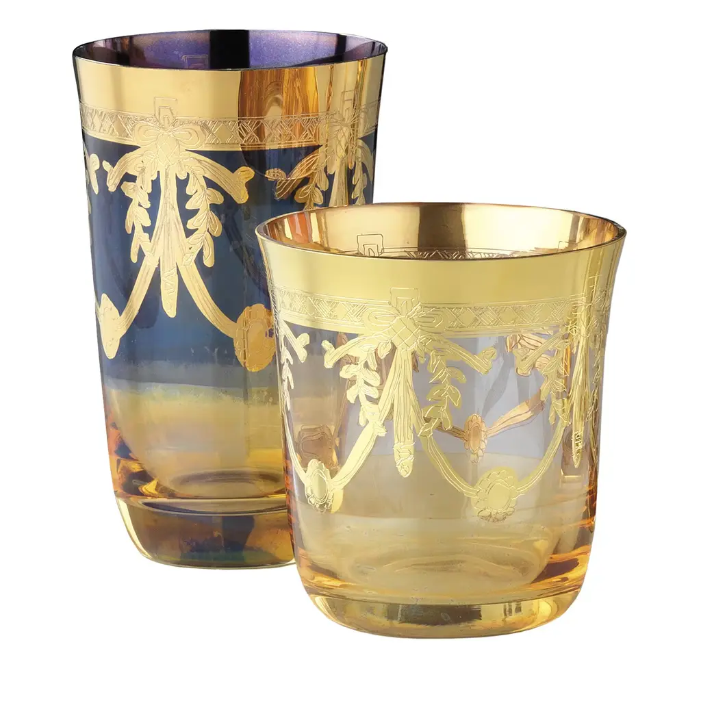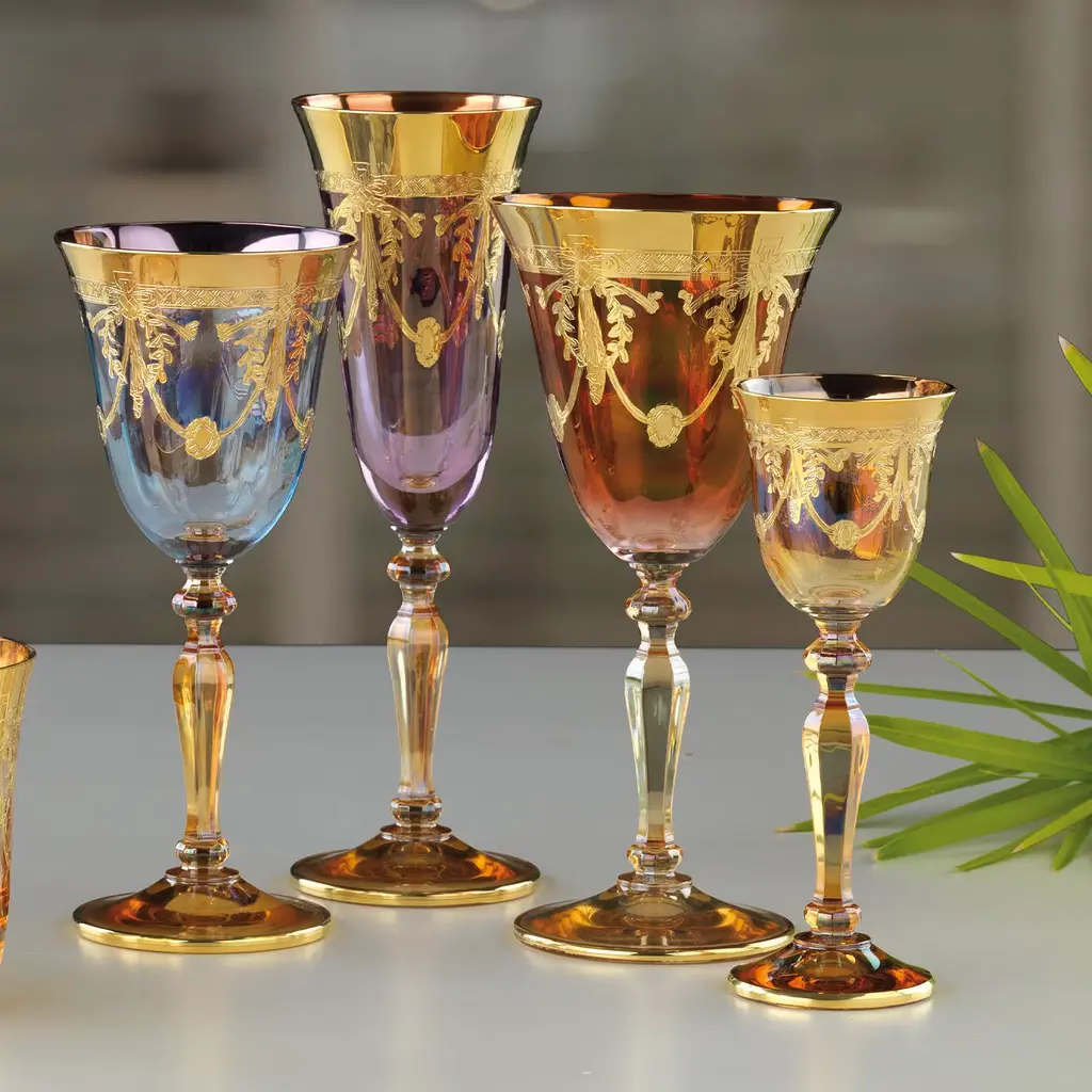 A striking set of water glass, wine glass, liquor glass, and flute that will make a magnificent, unforgettable presence on an elegantly set dining table, each piece is superbly handcrafted of mouth-blown glass following traditional techniques. Decorated by hand with superb ornaments in painted gold, the four glasses boast different mesmerizing shades combining a transparent yet shaded finish.