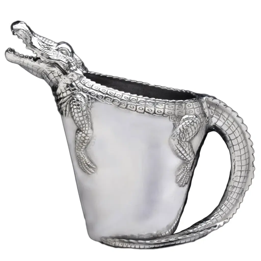 Join this relaxing reptile for a refreshing drink with this 72 oz. Alligator Pitcher from Arthur Court. This handmade, aluminum gator enjoys a break as he lounges on top of the pitcher and allows his scaly tail to curve and form a sturdy handle. With its innovative design, this pitcher is easy to talk about, but hard to put down.
