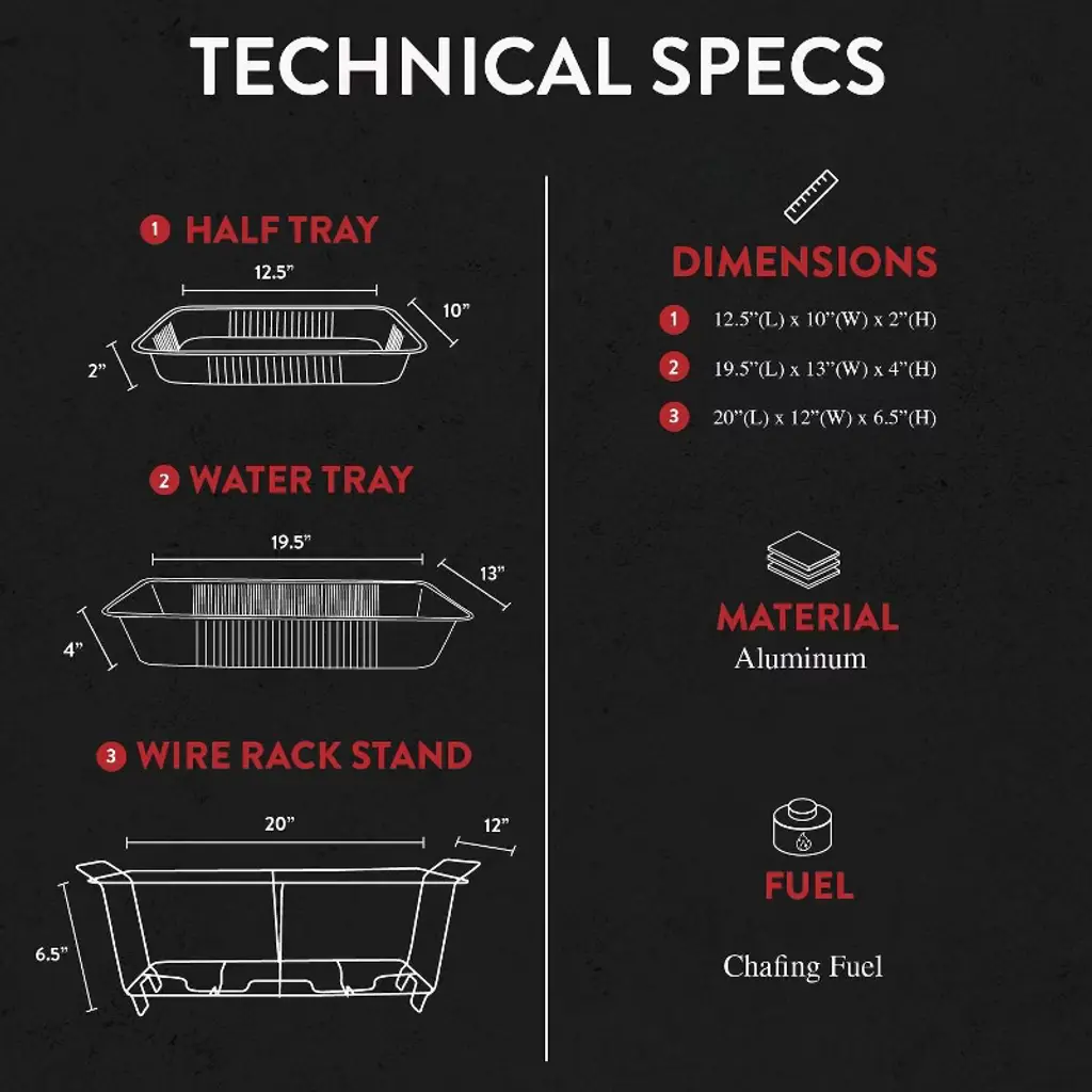 Complete Chafing Dish Buffet Set with Chafing Fuel Whether you have a professional catering business or you are preparing for a big family event, be sure that the buffet will look spectacular with our chafing servers set! The complete set comes with stands, utensils, aluminum trays and covers, as well as chafing fuel cans to keep the food warm and always fresh! With our chafing dish set, you can easily set the buffet and impress your guests with delicious, fresh food that will definitely enchant your guests! Still not convinced? Here are some of the amazing features of this product:. Convenient chafing dish buffet set;. Ideal for catering businesses, parties, special events, weddings, gatherings, family dinners, special occasions;. Hassle-free buffet setting;. Keep the food at optimal temperature;. Your guests will enjoy fresh, delicious food;. Reliable and secure design;. Premium quality materials; What's Included:. 3 x Wire stands. 3 x Sets of utensils. 6 x Aluminum half pans. 6 x Lids. 6 x Chafing fuel cans For a successful party and amazing buffet, choose this chaffing server set buffet!