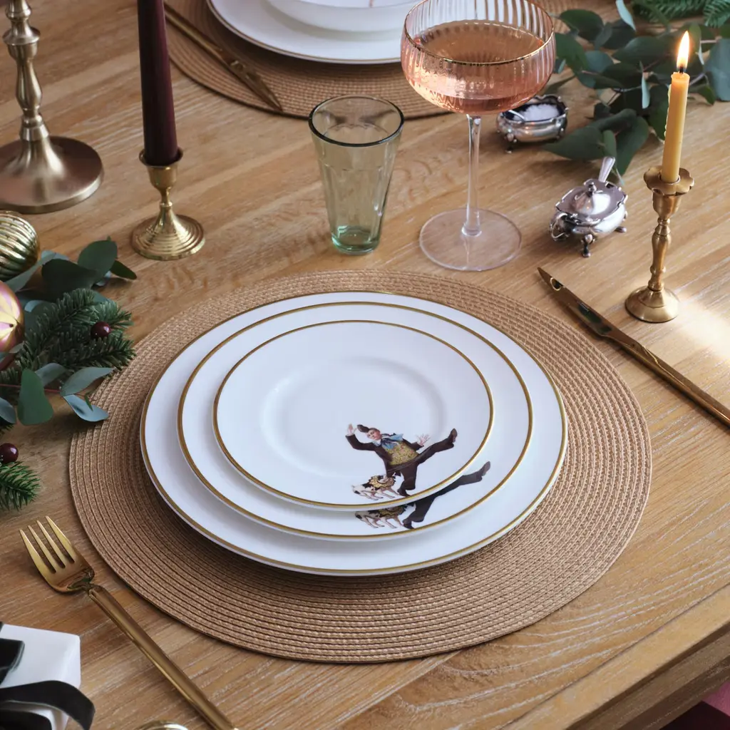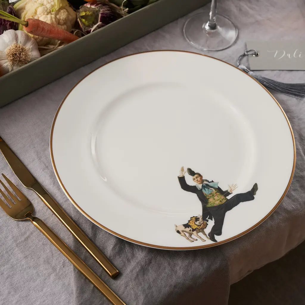 An exquisitely handcrafted fine bone china dinner plate featuring the wonderful Alphonso and his performing pooch from the 'The Show Must Go On' collection.Featuring hand painted 22kt burnished gold gilded edge for a luxurious and dishwasher friendly finish. The playful design paired with the best of British craftsmanship makes this the perfect plate for any occasion. Mix, match and layer to create a unique tablesetting for any occasion.Taking its influence from vintage Circus posters and celebrating the thrill of live performance, the collection brings the extravagant costumes, colours and buzz of the Big Top straight to the table.