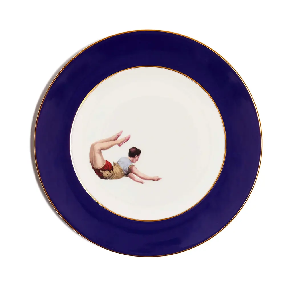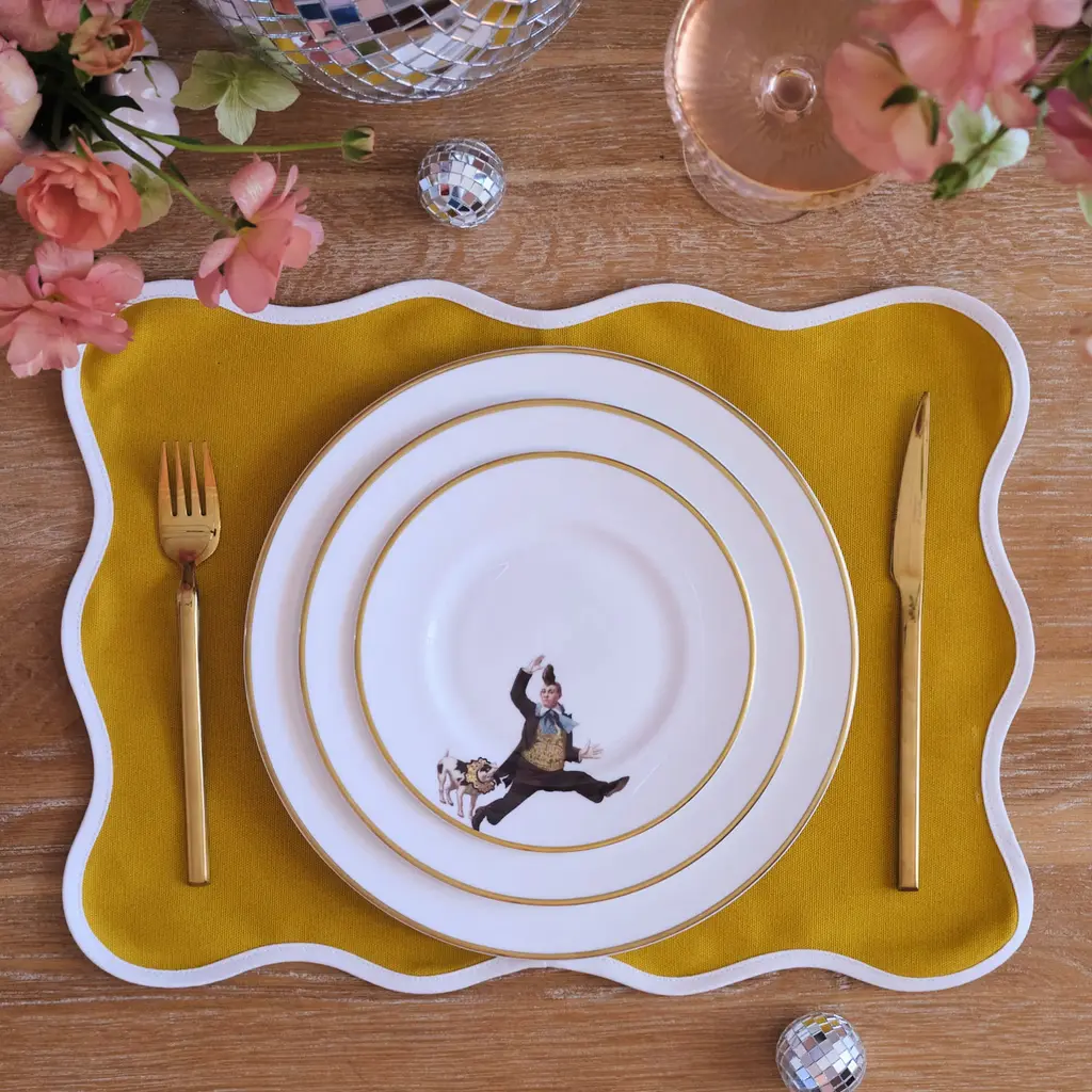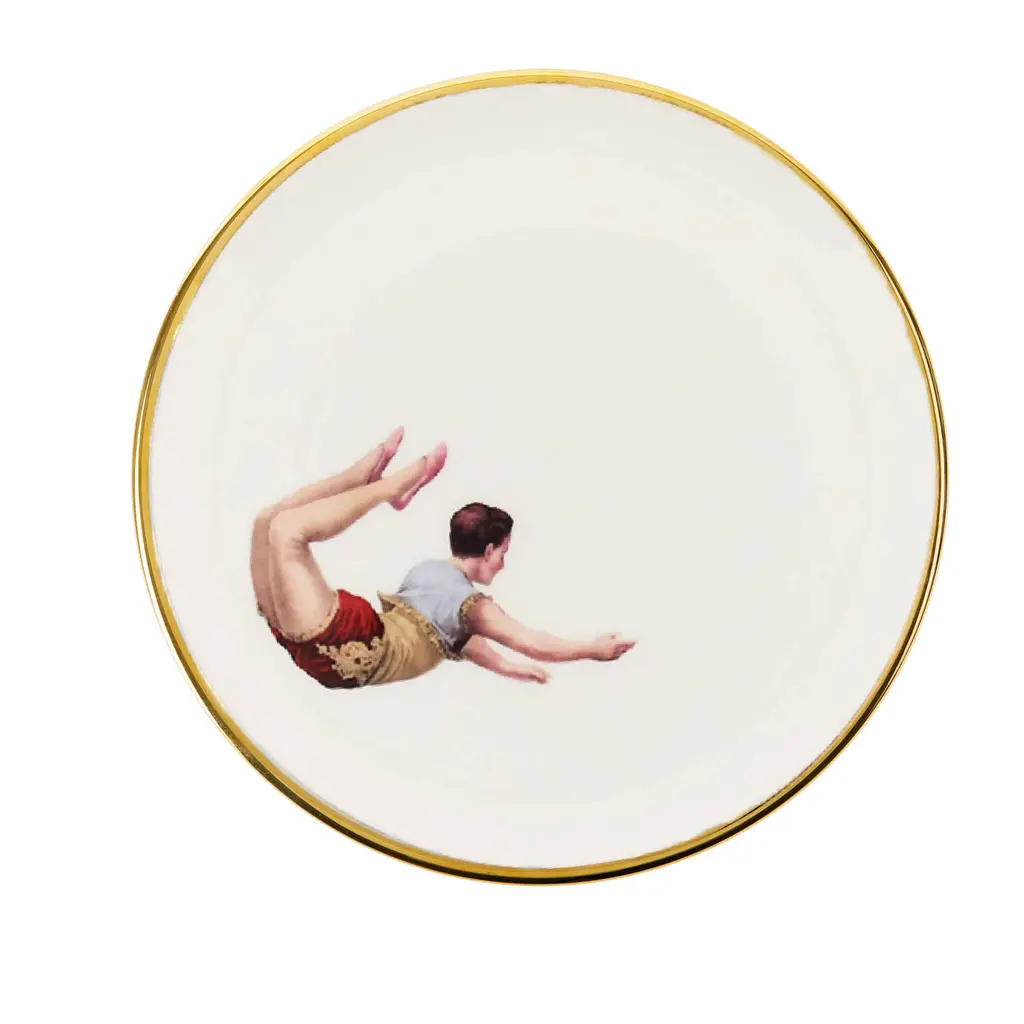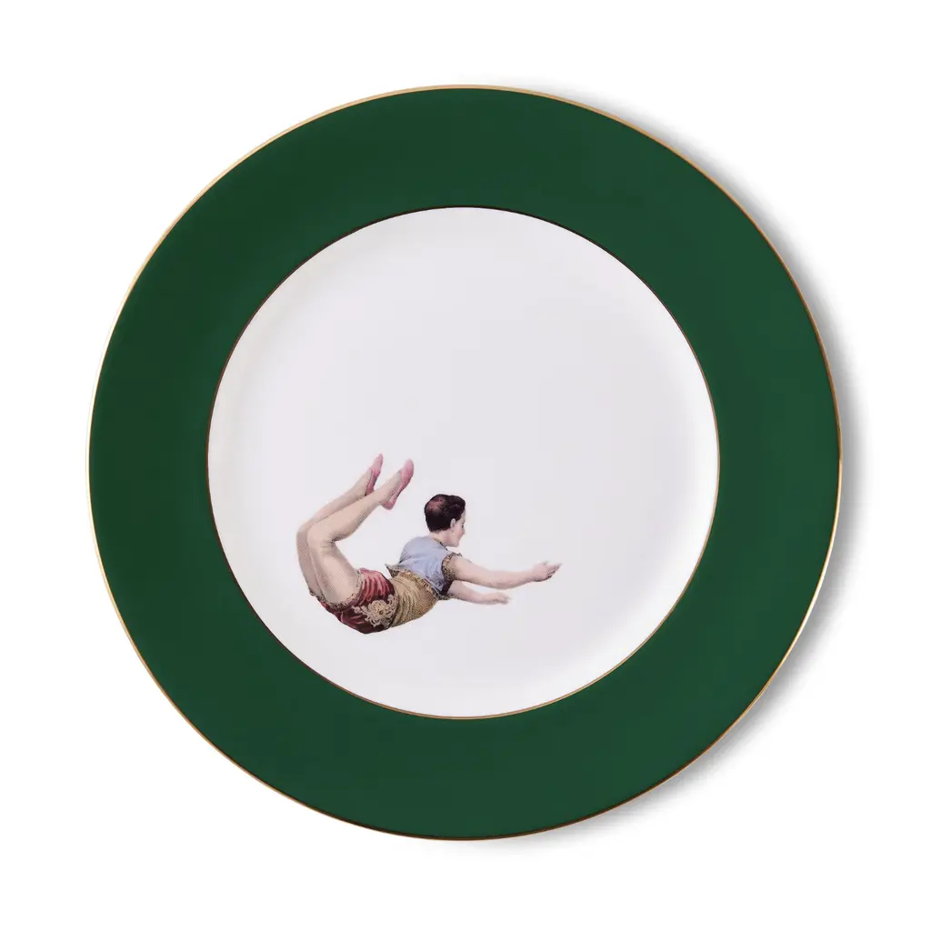 Exquisitely handcrafted fine bone china lunch/salad plate featuring the wonderful Alphonso and his performing pooch from the circus inspired 'The Show Must Go On' collection. Edged in hand painted 22kt burnished gold gilding creating a luxurious and dishwasher friendly finish. Perfect for any occasion, makes a delightful gift on it’s own or mix, match and layer Melody Rose pieces to create a truly unique set.The medium sized plate is to use perfect for lunch, salads, desserts or whatever takes your fancy. Design also available in larger size dinner plate and smaller dessert/side plates and bowls.