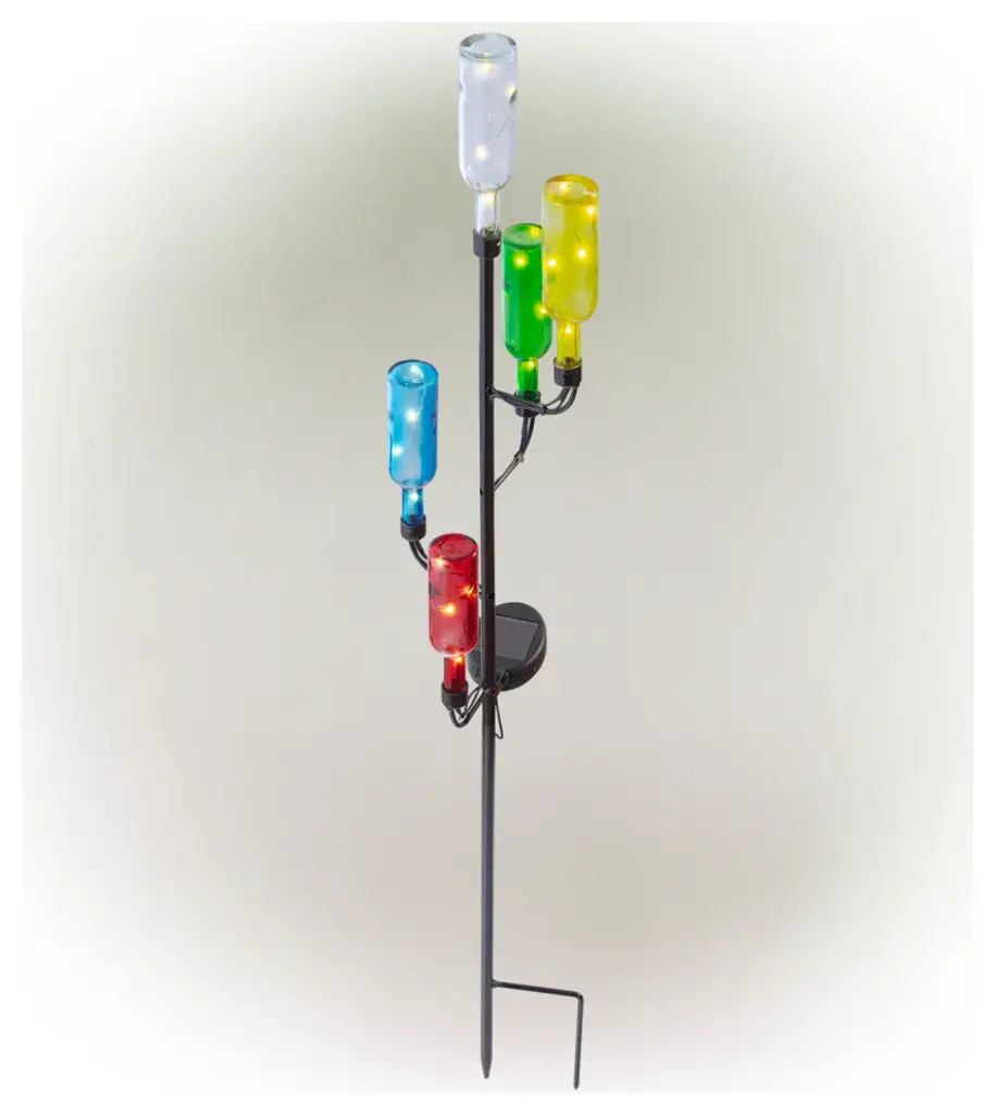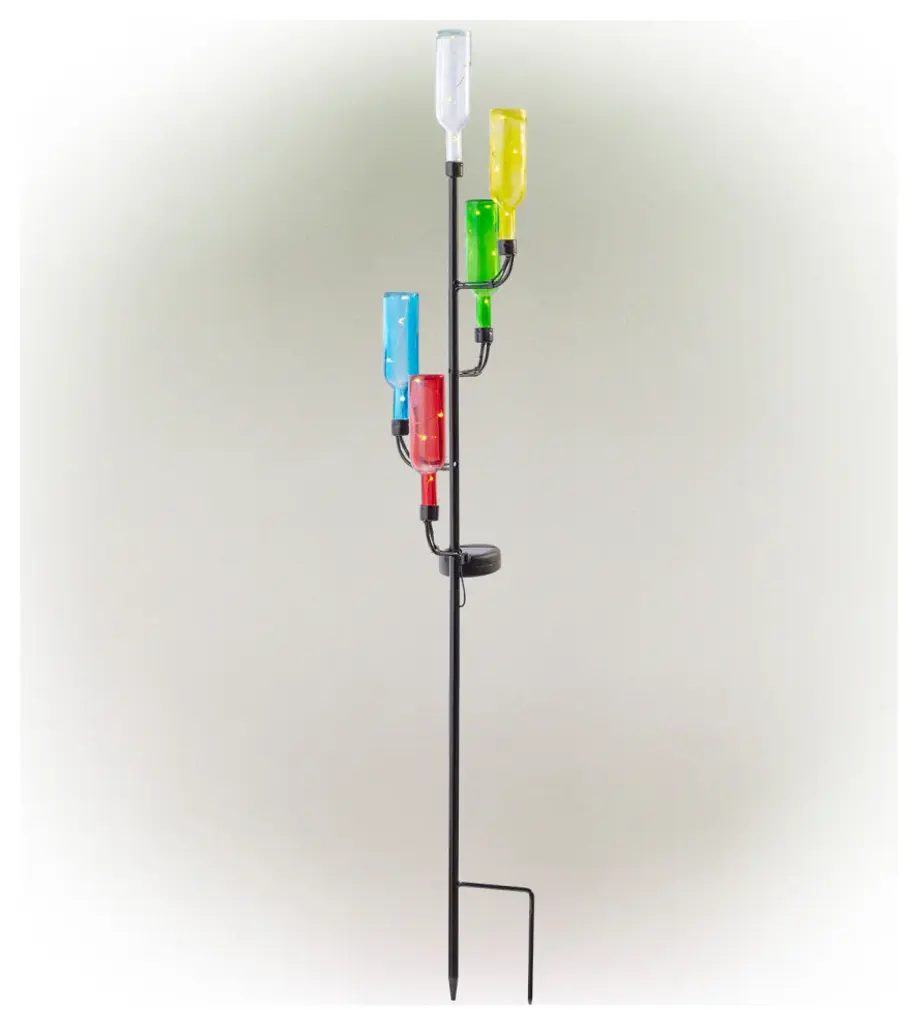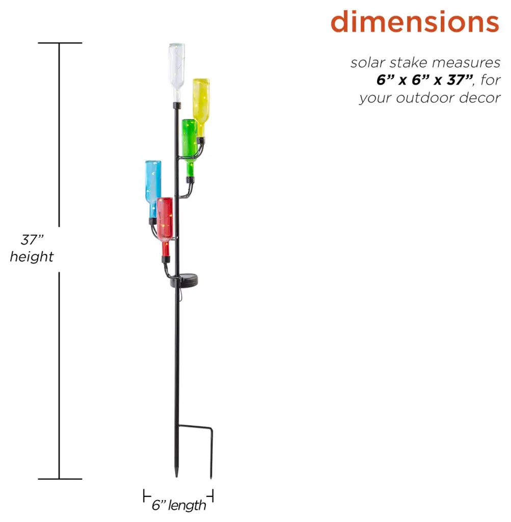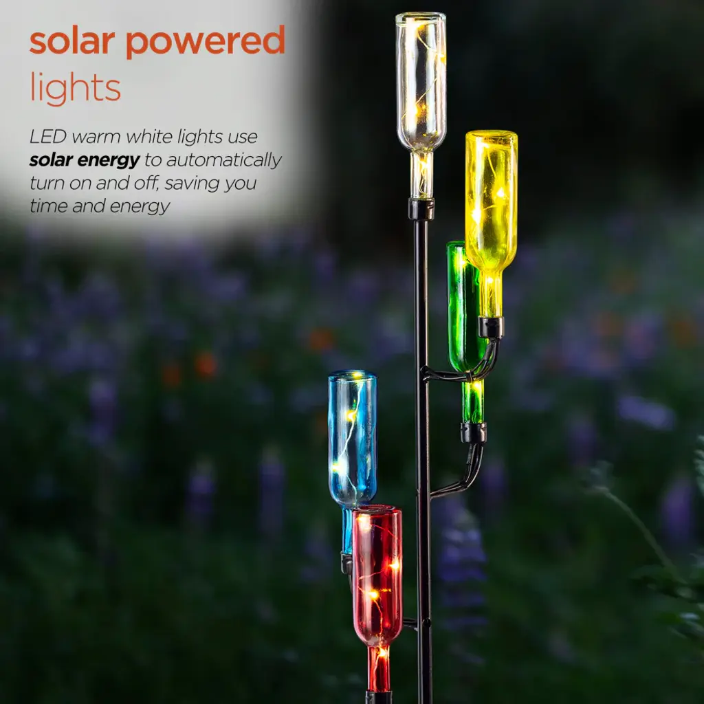 Brighten up your patio, lawn or garden with Alpines solar products. Simply place them in your garden and let it charge in the day and watch as it illuminates at night bringing life into your garden. Elegant, weather-resistant and designed to withstand extreme climate change. These solar products will extend a warm welcome to all your visitors and makes a great housewarming gift for everyone in your life! Set it in a sunny spot in your yard or garden and enjoy.Measures 6"L x 6"W x 37"H, made of Metal and GlassFeatures colorful, upside down LED bottle stakes that have handicraft designThis solar pathway light offers a truly unique look that is sure to impress and pleaseMade of durable materials that will perfect your home, yard, and garden decorIncludes a limited 1-year, hassle-free manufacturer''s warranty