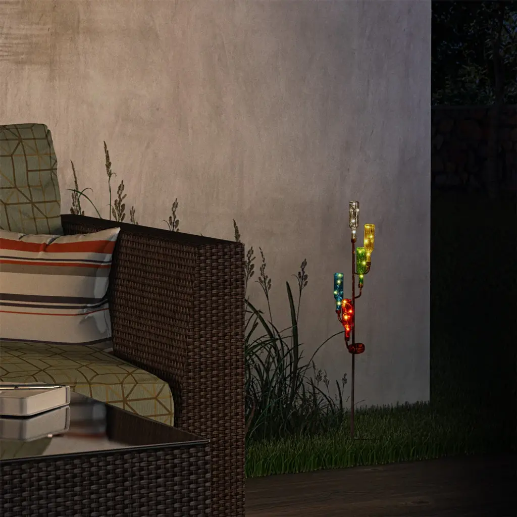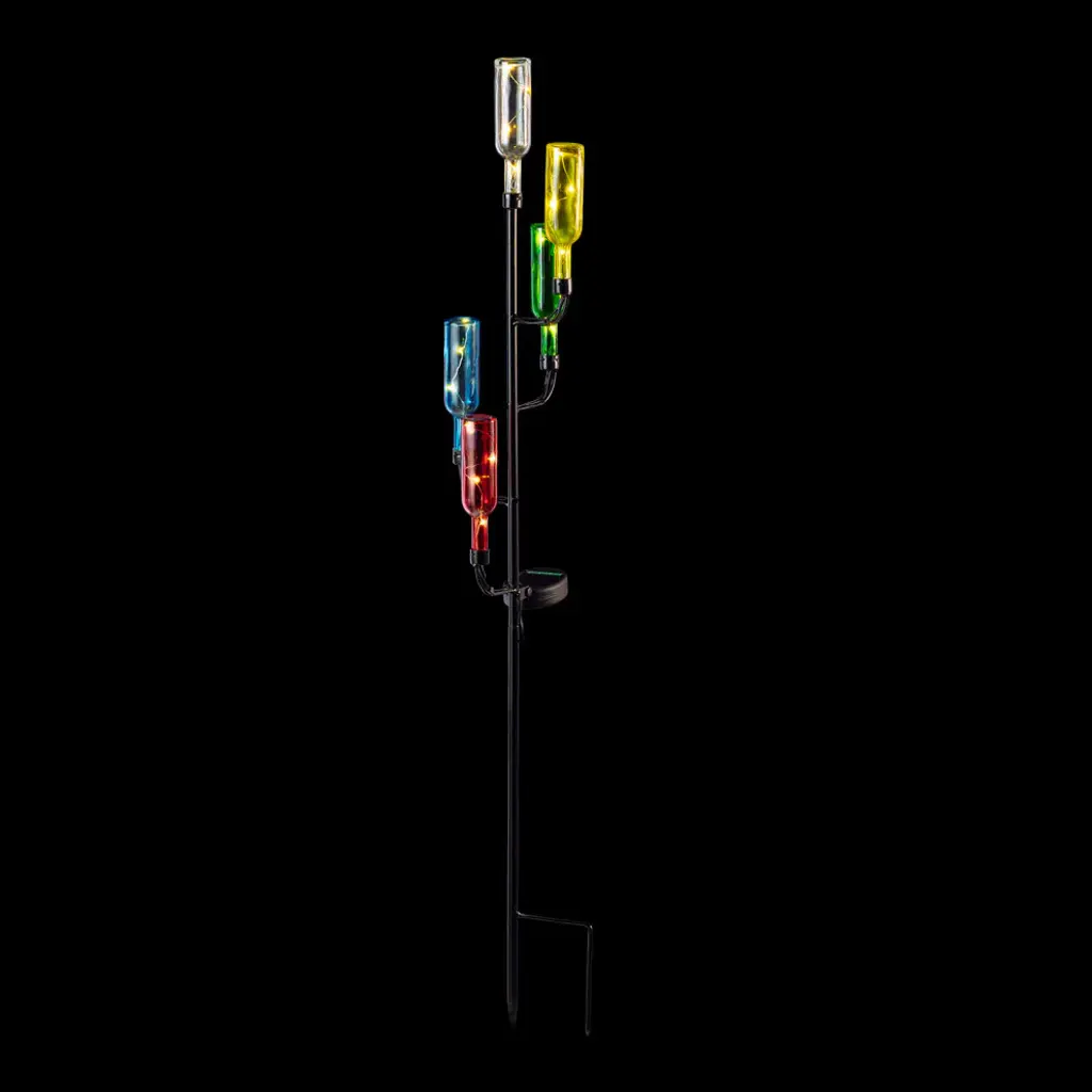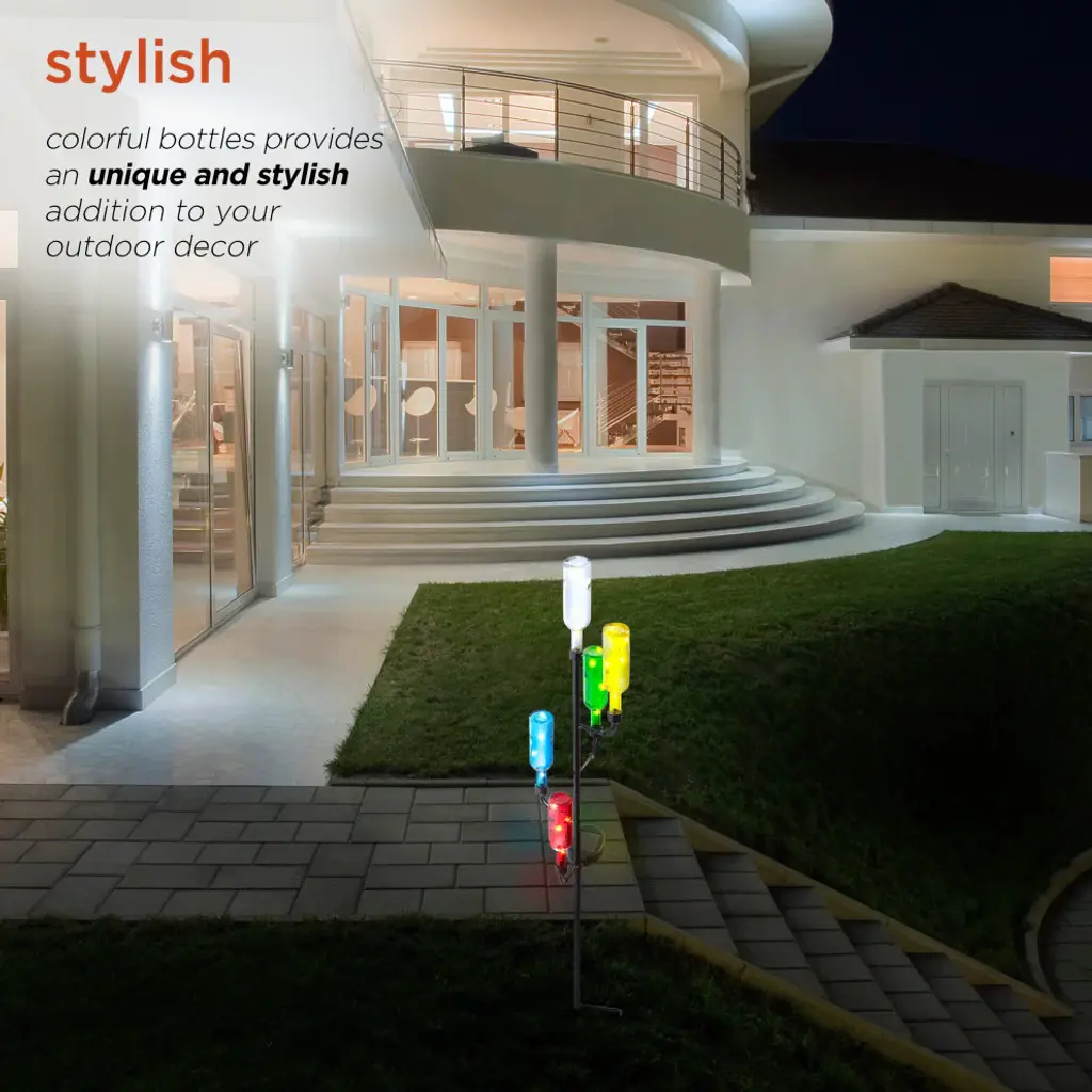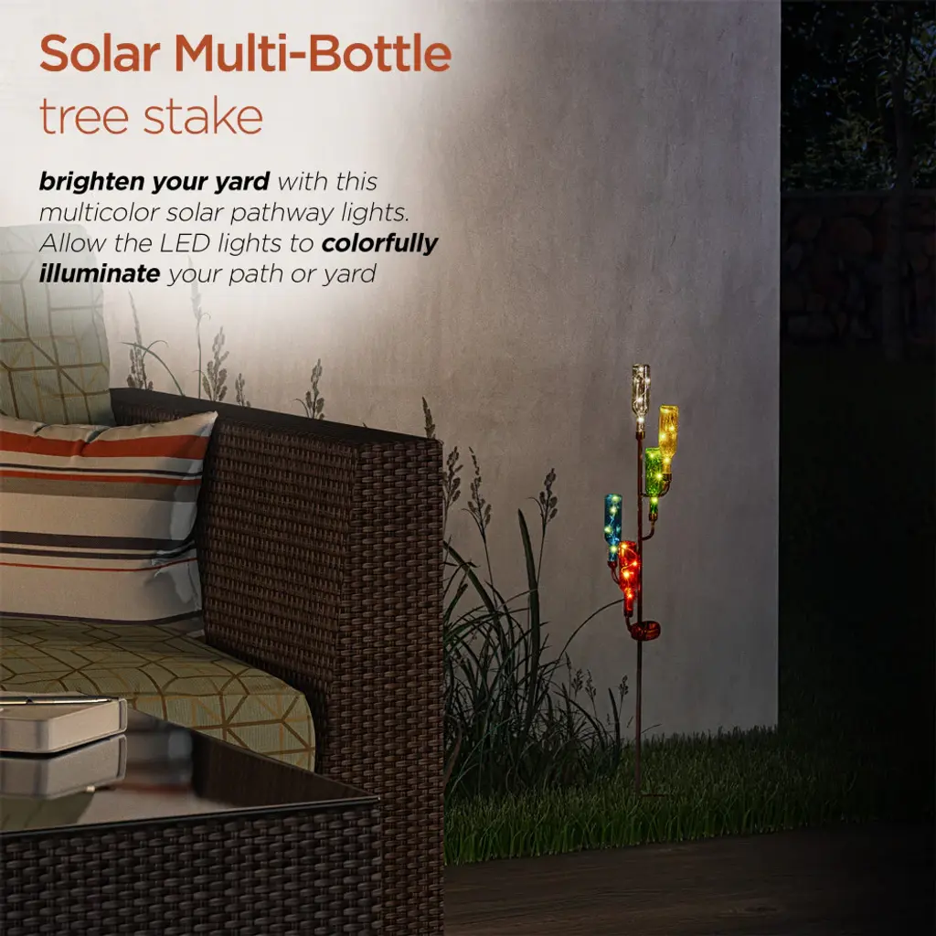 Brighten up your patio, lawn or garden with Alpines solar products. Simply place them in your garden and let it charge in the day and watch as it illuminates at night bringing life into your garden. Elegant, weather-resistant and designed to withstand extreme climate change. These solar products will extend a warm welcome to all your visitors and makes a great housewarming gift for everyone in your life! Set it in a sunny spot in your yard or garden and enjoy.Measures 6"L x 6"W x 37"H, made of Metal and GlassFeatures colorful, upside down LED bottle stakes that have handicraft designThis solar pathway light offers a truly unique look that is sure to impress and pleaseMade of durable materials that will perfect your home, yard, and garden decorIncludes a limited 1-year, hassle-free manufacturer''s warranty
