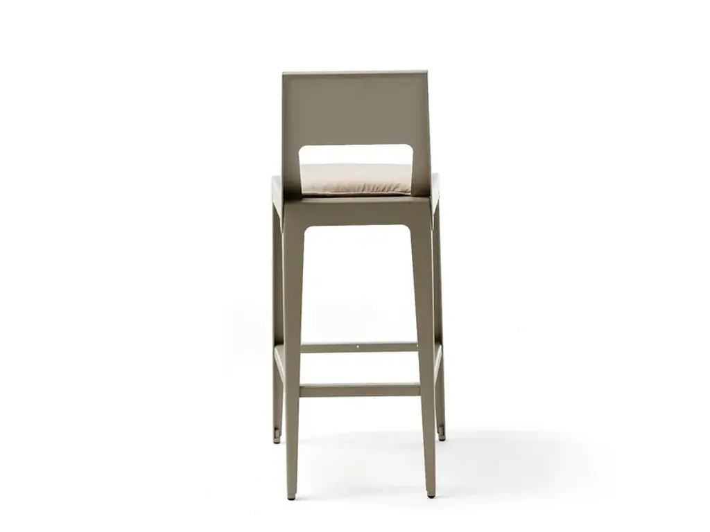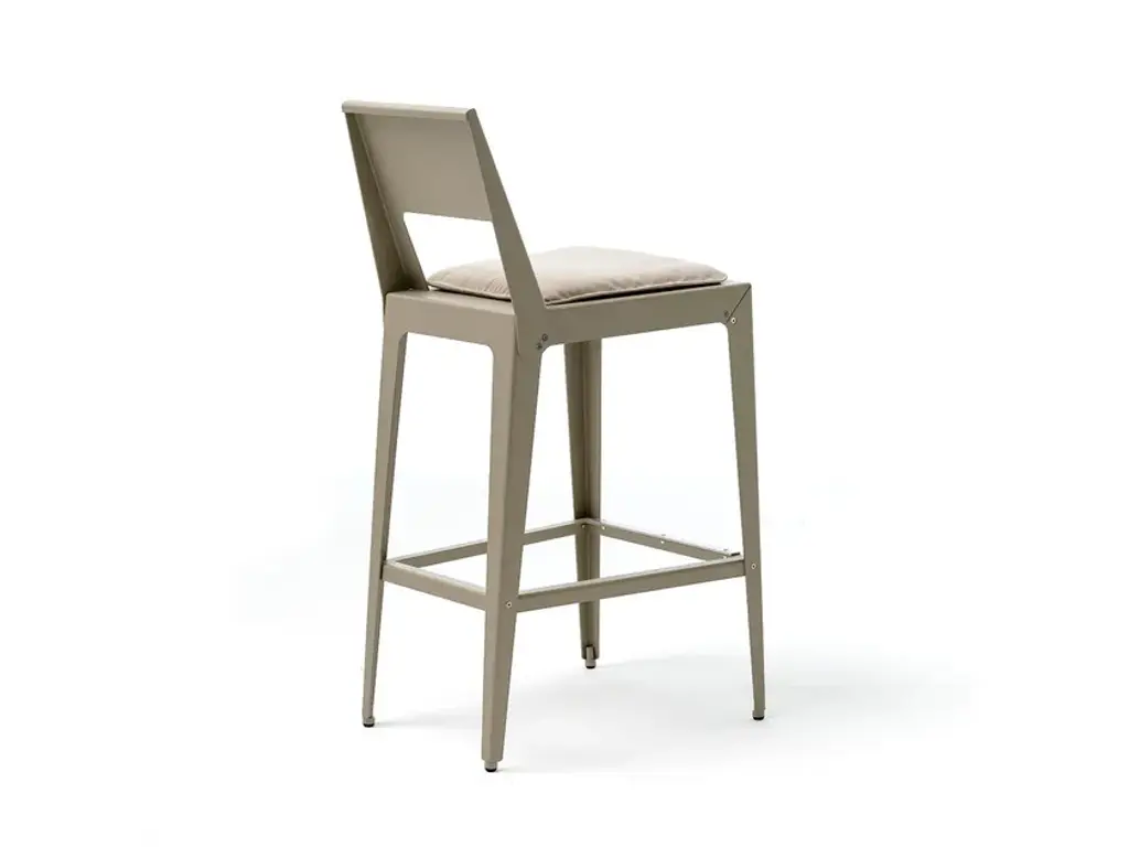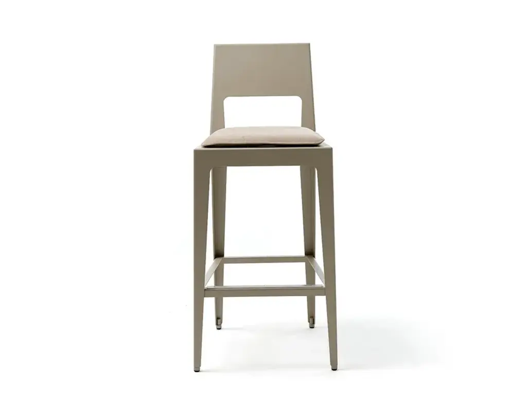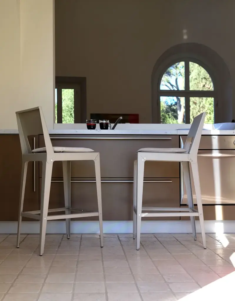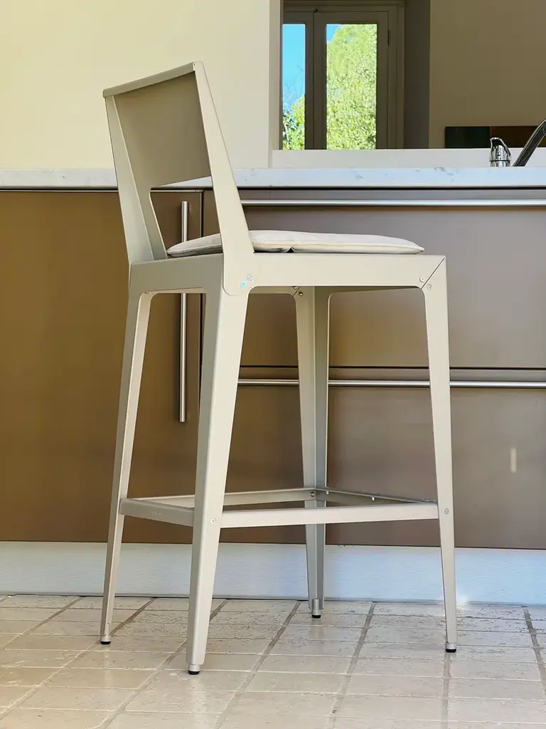 Alustool is a stool made from aluminum sheets, echoing the essential and archetypal lines of the chair of the same name.The structure is formed by mechanically joining two cut and folded aluminum sheets, with no welds involved. Four metal cylinders complete the legs and hold rubber feet, which not only protect the floor but also ensure quiet movement. A slim brushed aluminum bar serves as a footrest and protects the underlying metal surface. The removable cushion enhances seating comfort and insulates the body from the metal surface.Alustool is essential and lightweight, yet rich in character and comfortable.Materials:Aluminum sheet with rubber feet. Available in two finishes: powder-coated in any RAL color or polished mirror-finish aluminum.