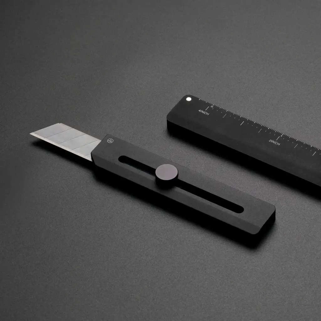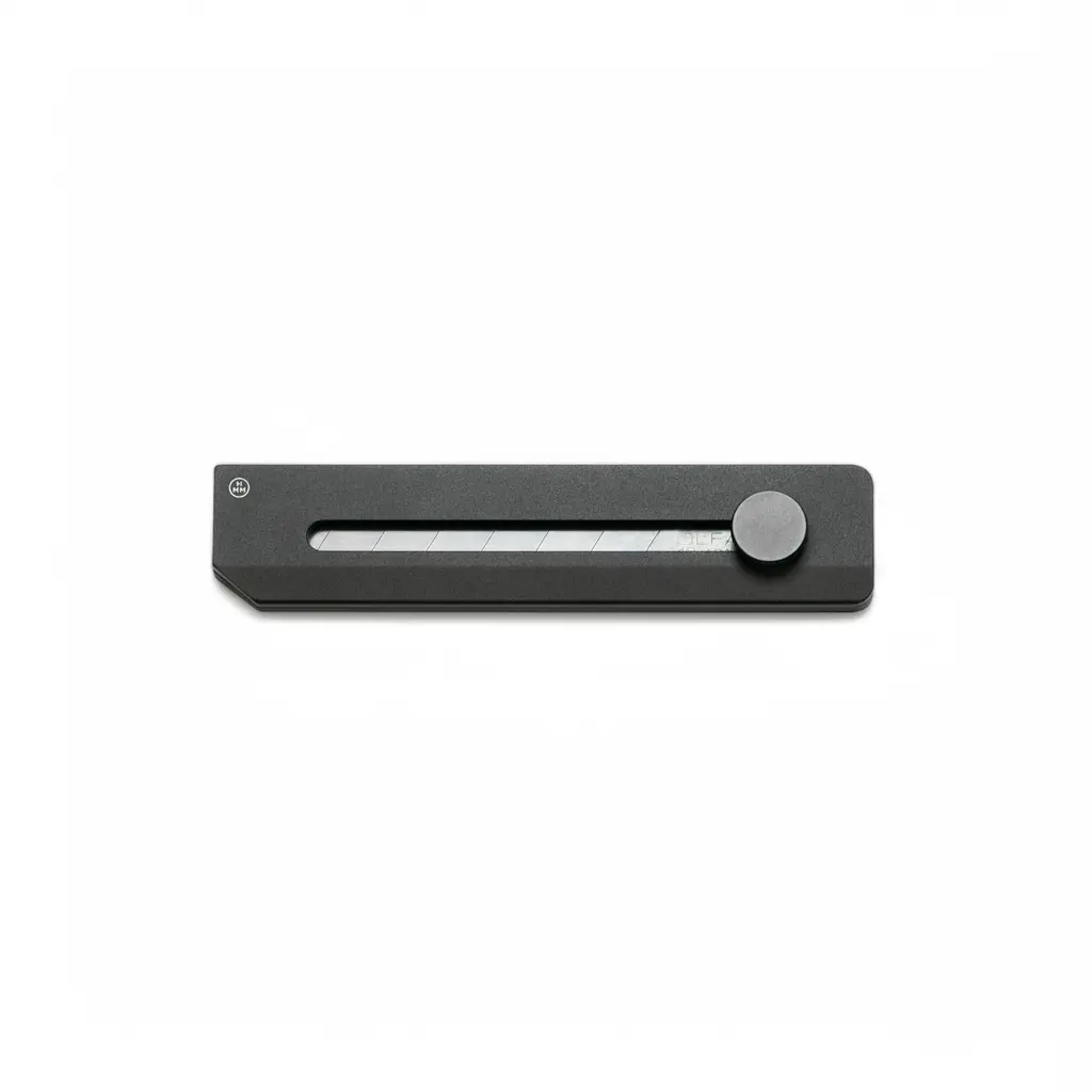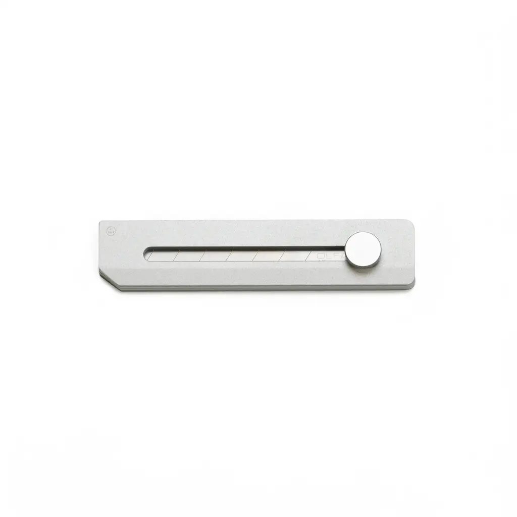The aluminum utility knife is a precision tool designed for artisans, featuring an OLFA large blade and an anodized aluminum body for enhanced stability and control. Its screw mechanism ensures secure blade positioning, making it ideal for product designers, leather crafters, and carpenters. On the reverse side, a magnetic ruler with a 15-degree curvature acts as a protective barrier, reducing accidental cuts. With both imperial and metric measurements, it supports precise measuring and cutting. Weighing only 80g, it is lightweight and portable for on-the-go use. The CNC-processed opening improves cutting accuracy, while the minimalist design ensures it fits seamlessly into any workspace. Available in black, silver, and army finishes, this aluminum utility knife delivers reliability and precision in a compact form.