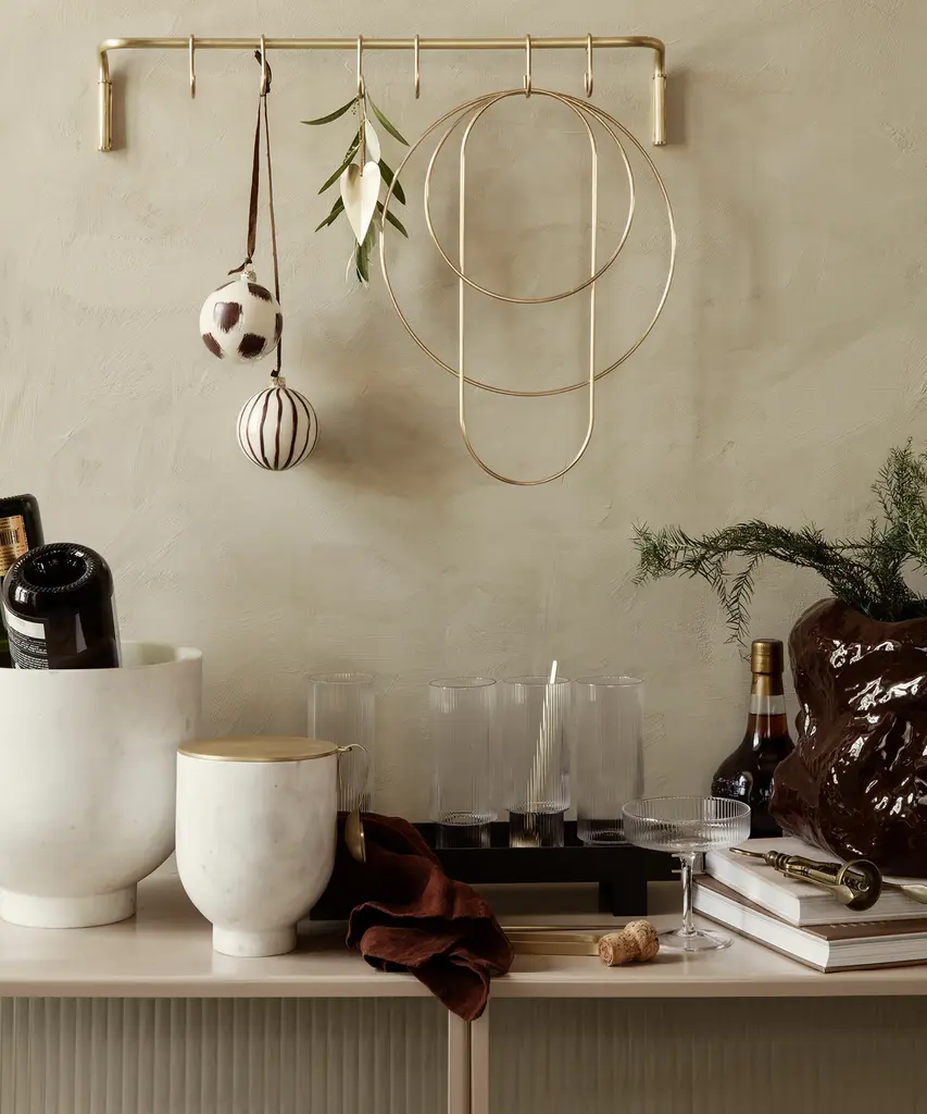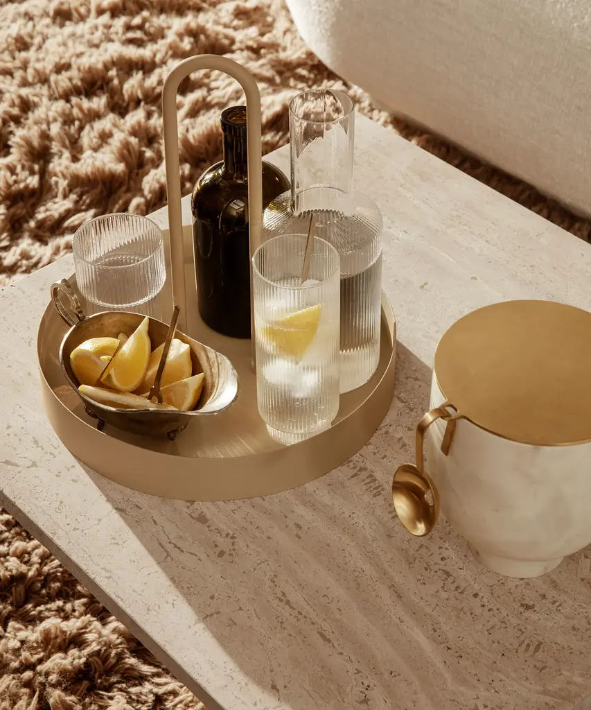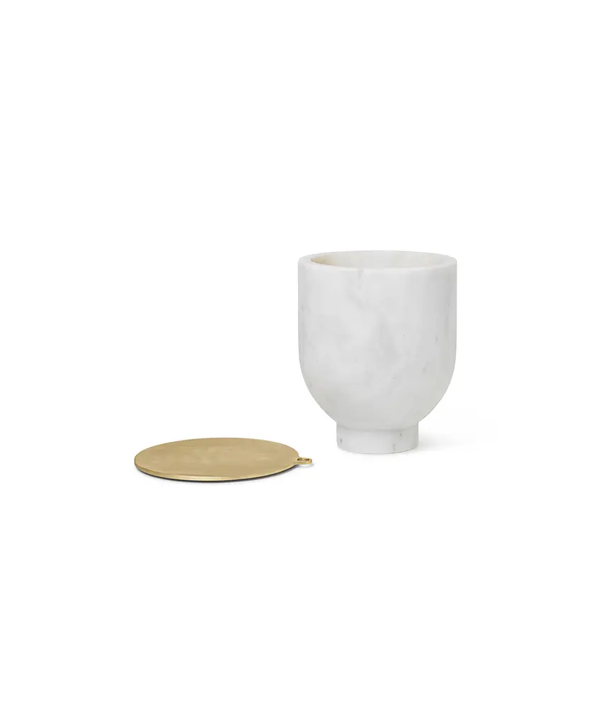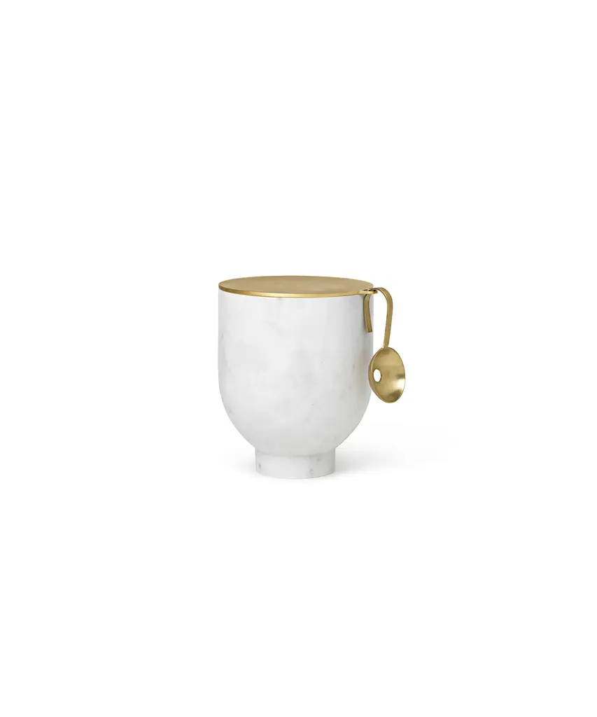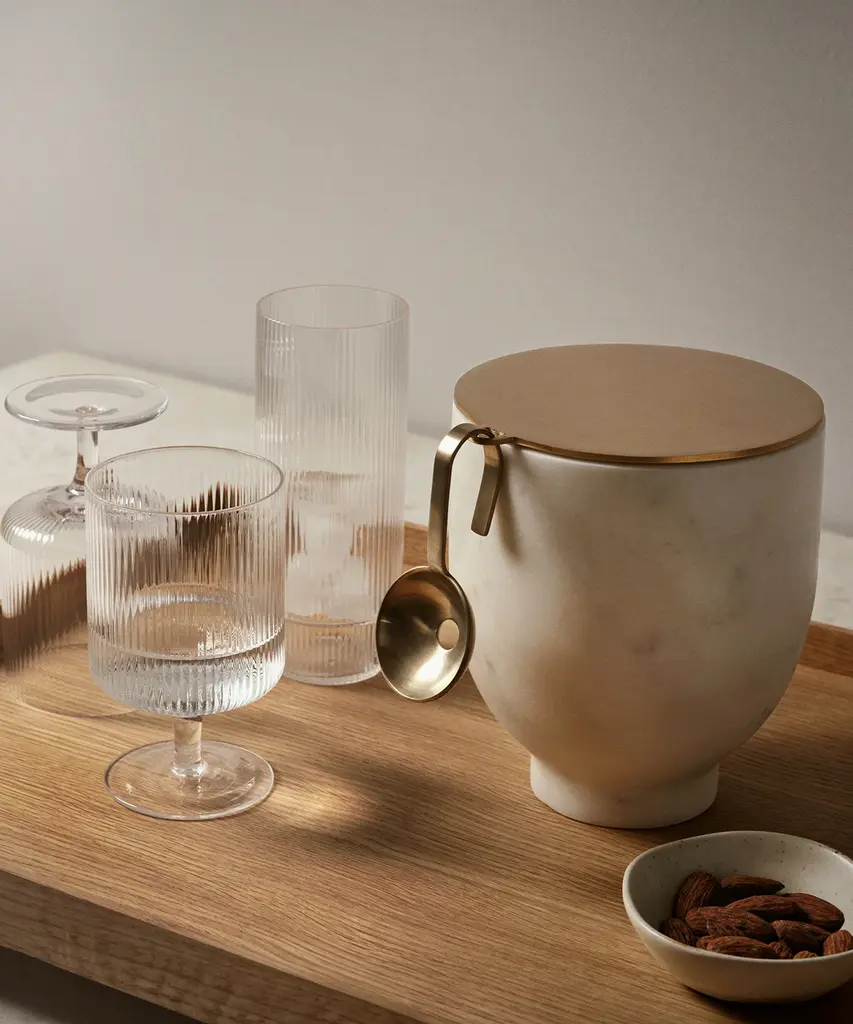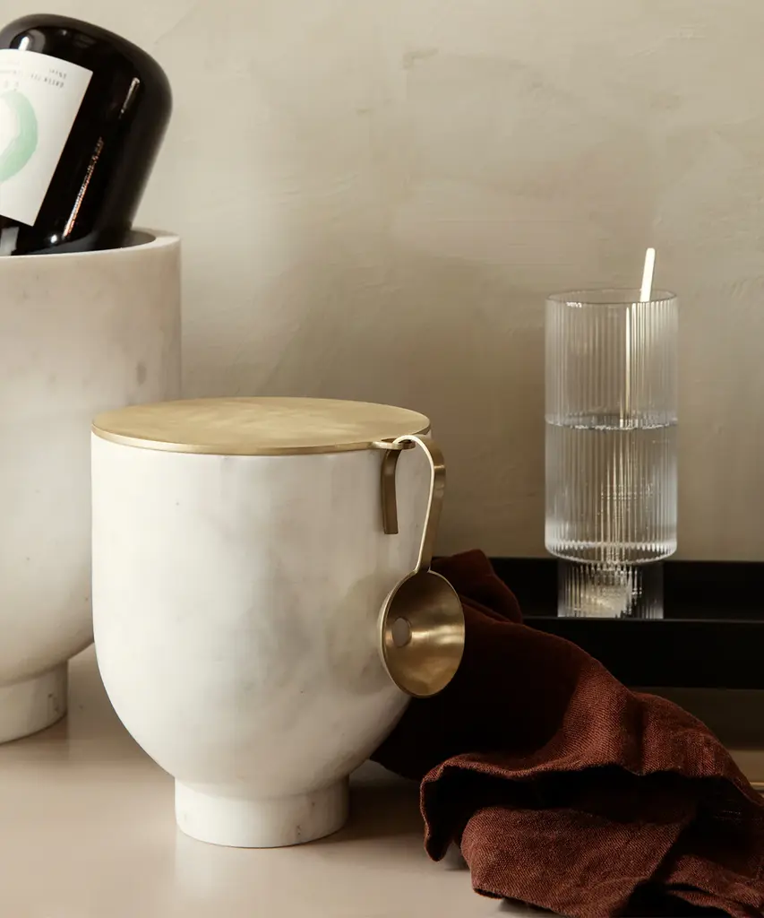 Modern and simple yet with a hint of extravagance, the Alza Ice Bucket is a decadently elegant accessory at parties. Complete with a matte brass lid, the decorative and functional bowl is made from solid marble and is ideal for keeping your bar cart or drinks table stocked with ice. Use it together with the Fein Ice Spoon, which can hang smartly from the lid’s understated hook. Designed and produced by the Copenhagen-based studio Ferm Living.