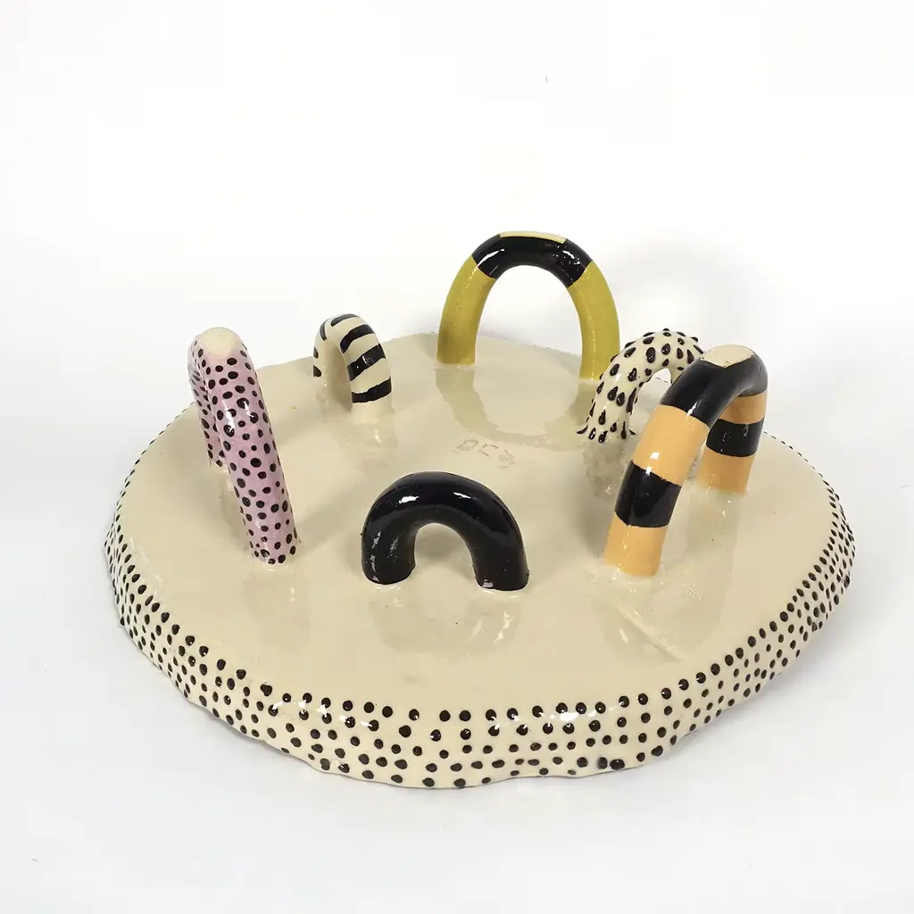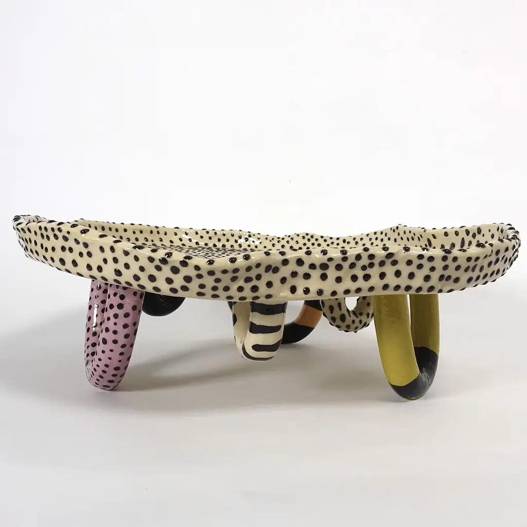 Boasting a unique design and sculptural artwork, this cake stand exudes a timeless and sophisticated character of pop inspiration. Deftly handmade of porcelain stoneware enriched with a spotted pattern of black porcelain drops, it features horse-shaped feet decorated with lilac, apricot orange, black, and acid green details. Due to its handcrafted nature, it may display small imperfections that are a testament to its uniqueness and to the authenticity of the material.