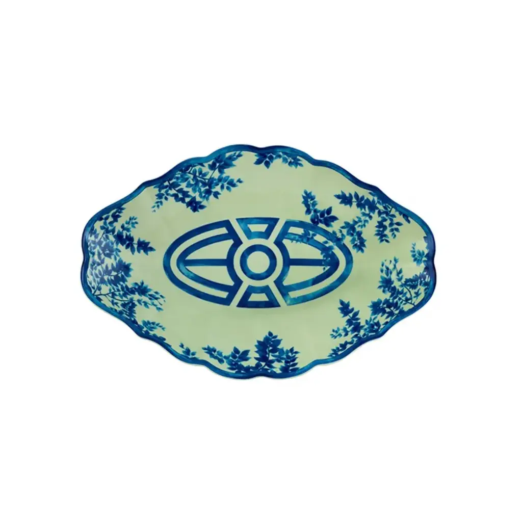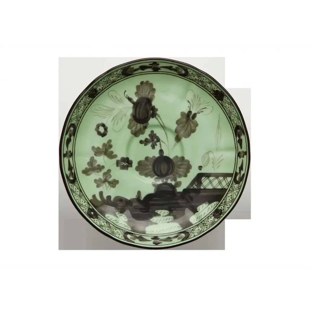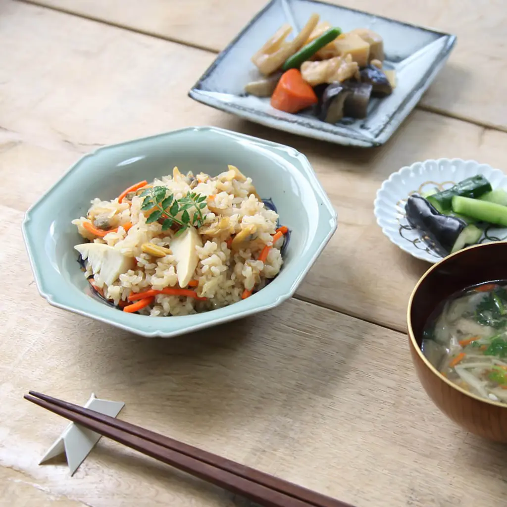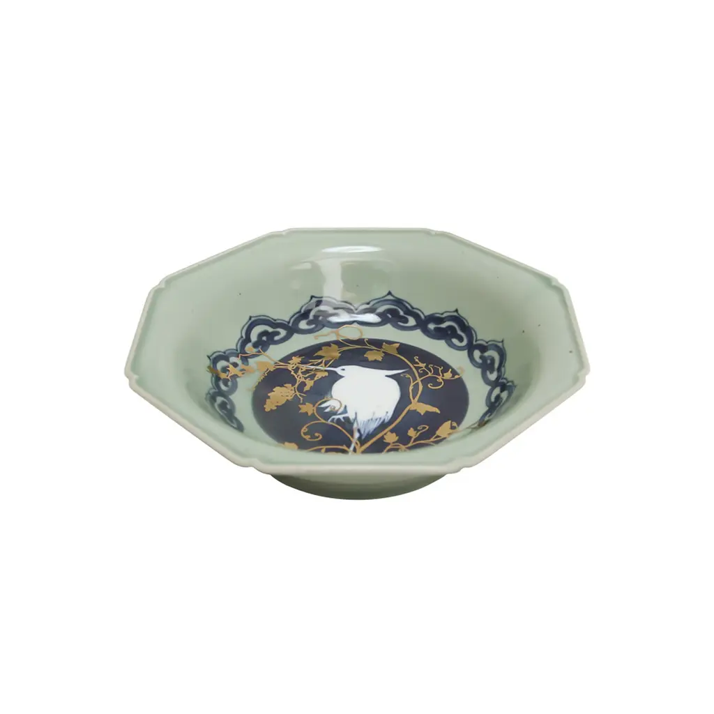 Sagimon, part of the Namasu Collection, is an elegant octagonal plate that features a tasteful pattern depicting a heron standing gracefully by the water, with one leg raised. The celadon glaze complements the vivid blue and white porcelain, creating a beautiful color scheme that delights the viewer. The overglaze incorporates grape vines, a popular Western motif, framing the design with a Japanese-Western fusion atmosphere.