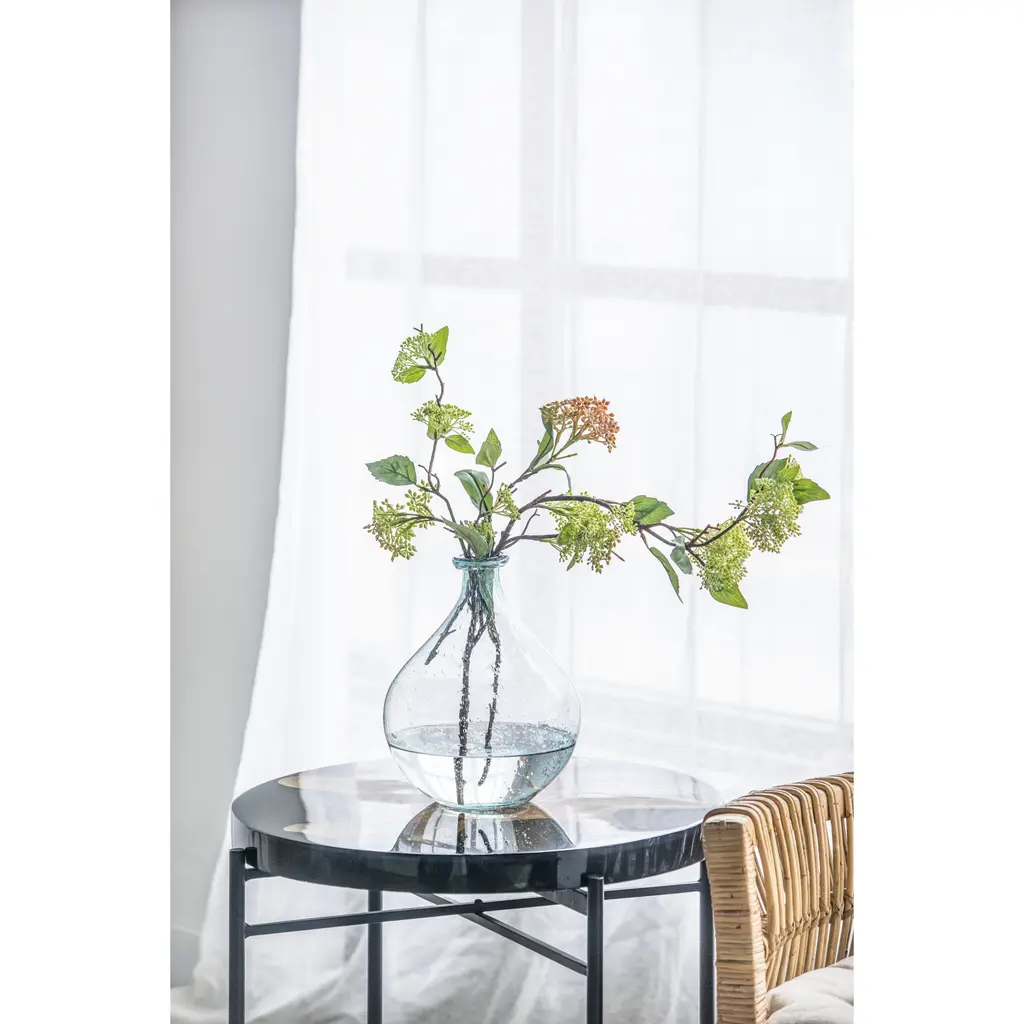 The Amadour Bubble Glass Bottle features softly teal colored glass in a uniquely rounded shape. This bottle is beautiful all on its own with tiny air bubbles throughout, reminiscent of dew droplets. Full of personality and ready for you to make it your own, this vase is great alone, or in multiples.
