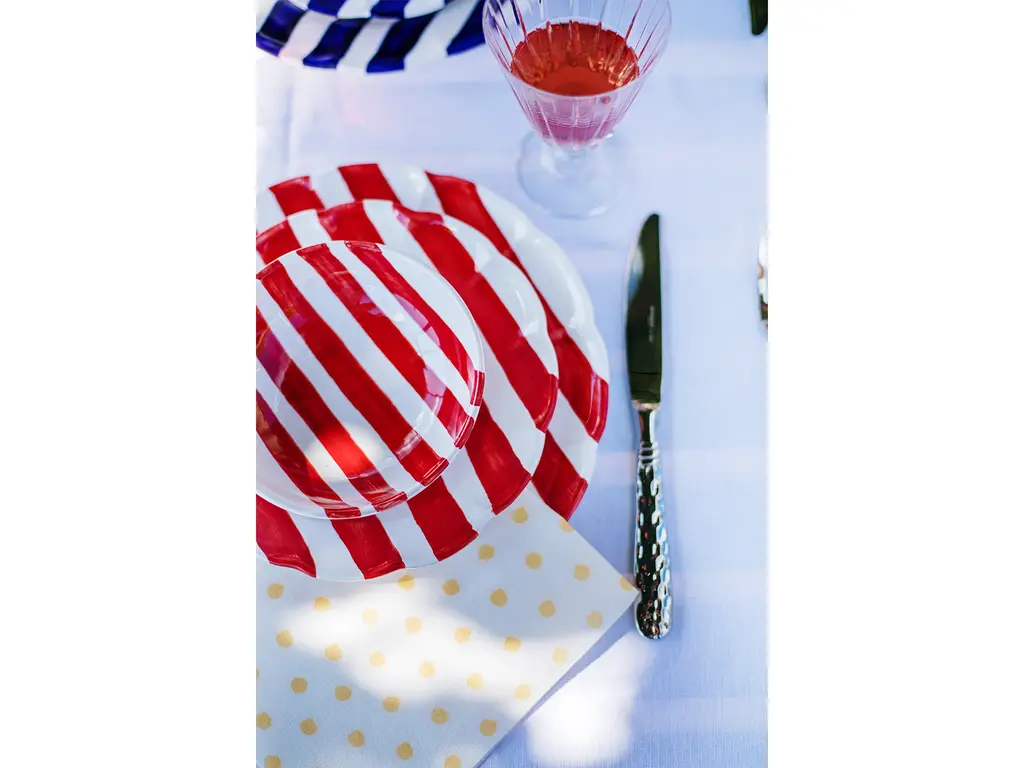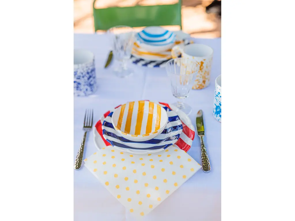 The Amalfi Coast's joyous explosion of color is celebrated in the brilliant blues, sunwashed reds, and saturated yellows of Amalfitana. Color is king in this part of paradise, and this collection livens up any table with vibrant, cheerful style. Crisp stripes and traditional Italian splatter designs are meant to be mixed and matched to create unique and lively looks.