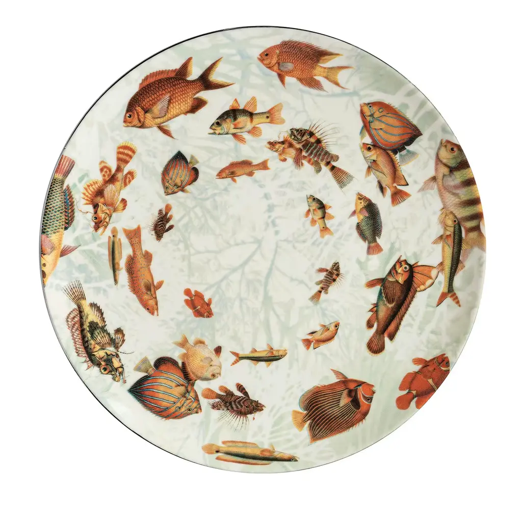 A tribute to the colorful tropical fish species endemic to the Amami archipelago in Japan, this fruit plate is part of a superbly crafted and designed series by artist Vito Nesta. Fashioned of porcelain, it is graced by a richly detailed, hand-painted decoration of red-colored fish seemingly swimming in their native coral reef rendered in delicate, light-blue strokes.