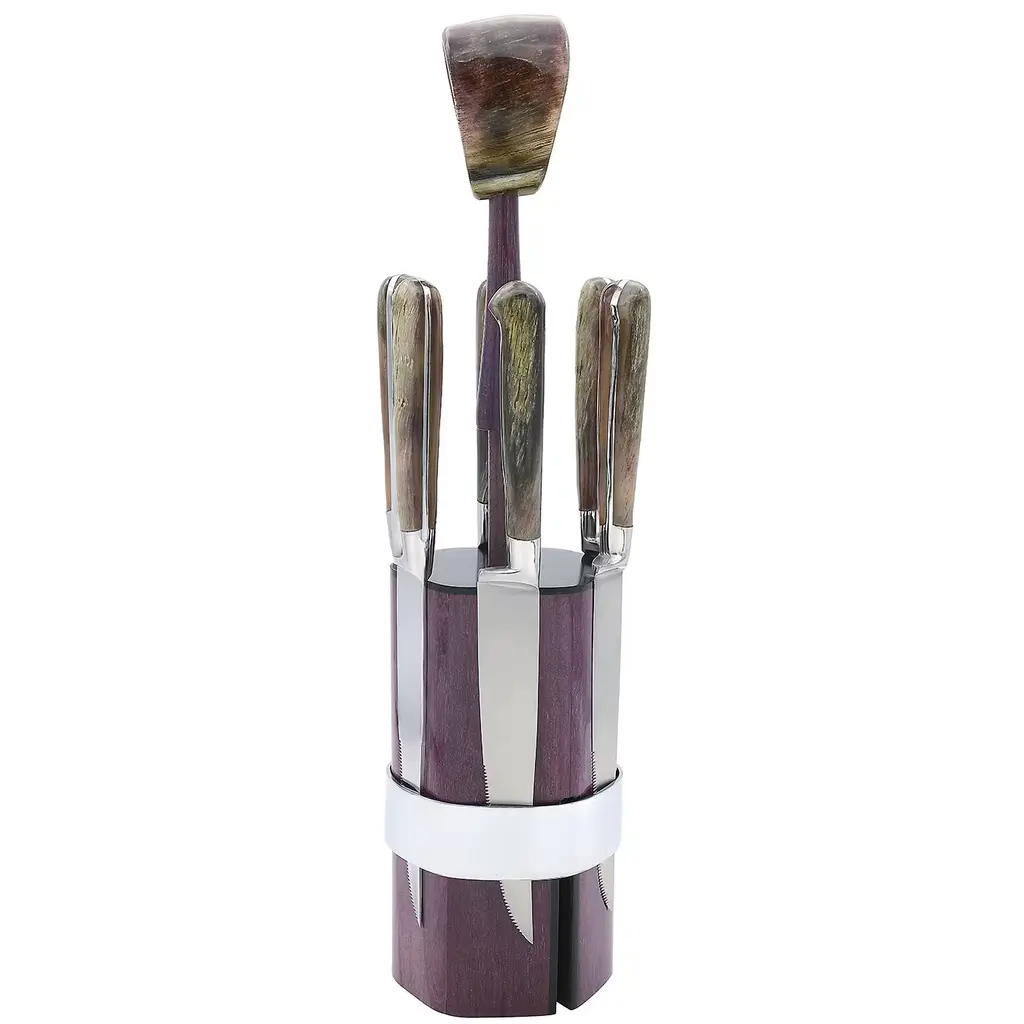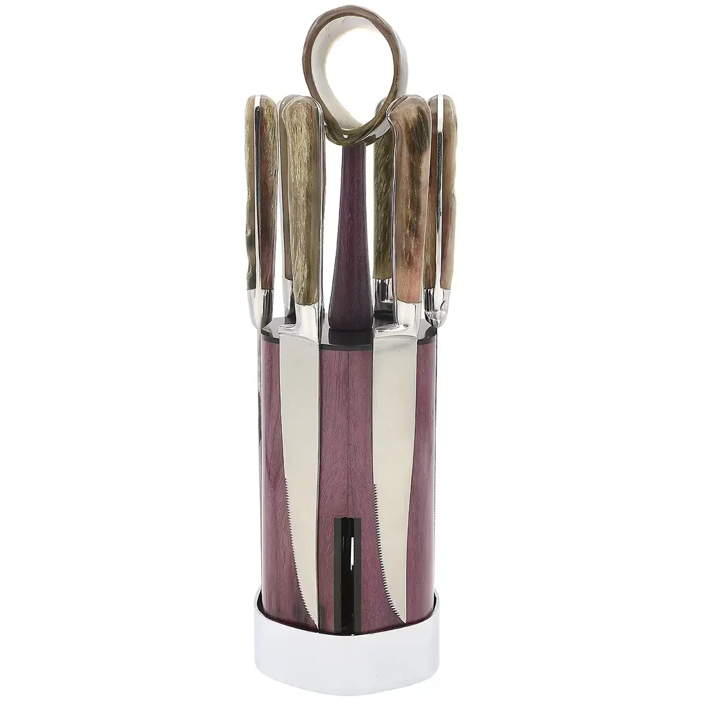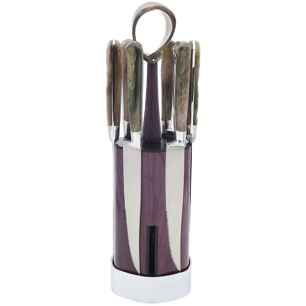 This magnetic knife block is crafted from amaranth and ebony wood. Its kudu horn handle matches the handles of the six forged steak knives, making the set a truly special addition to your kitchen. Complete with a knife locking system for safe transportation, the Amaranth and Ebony Knife Block is a must-have for serious chefs with a taste for sophistication.