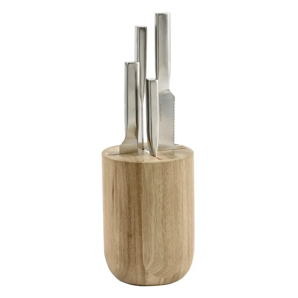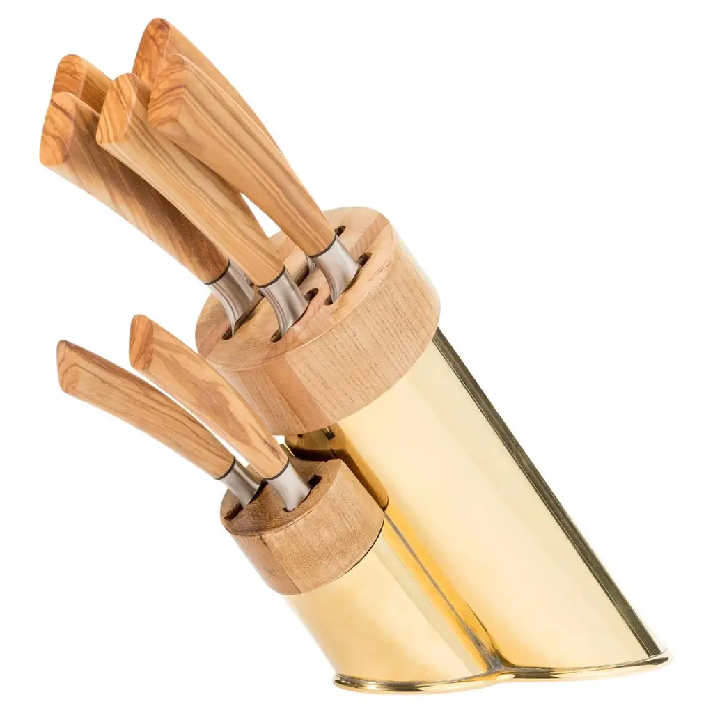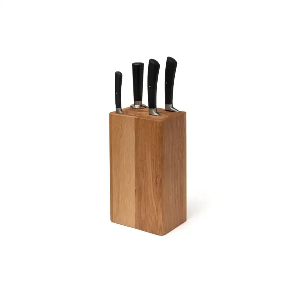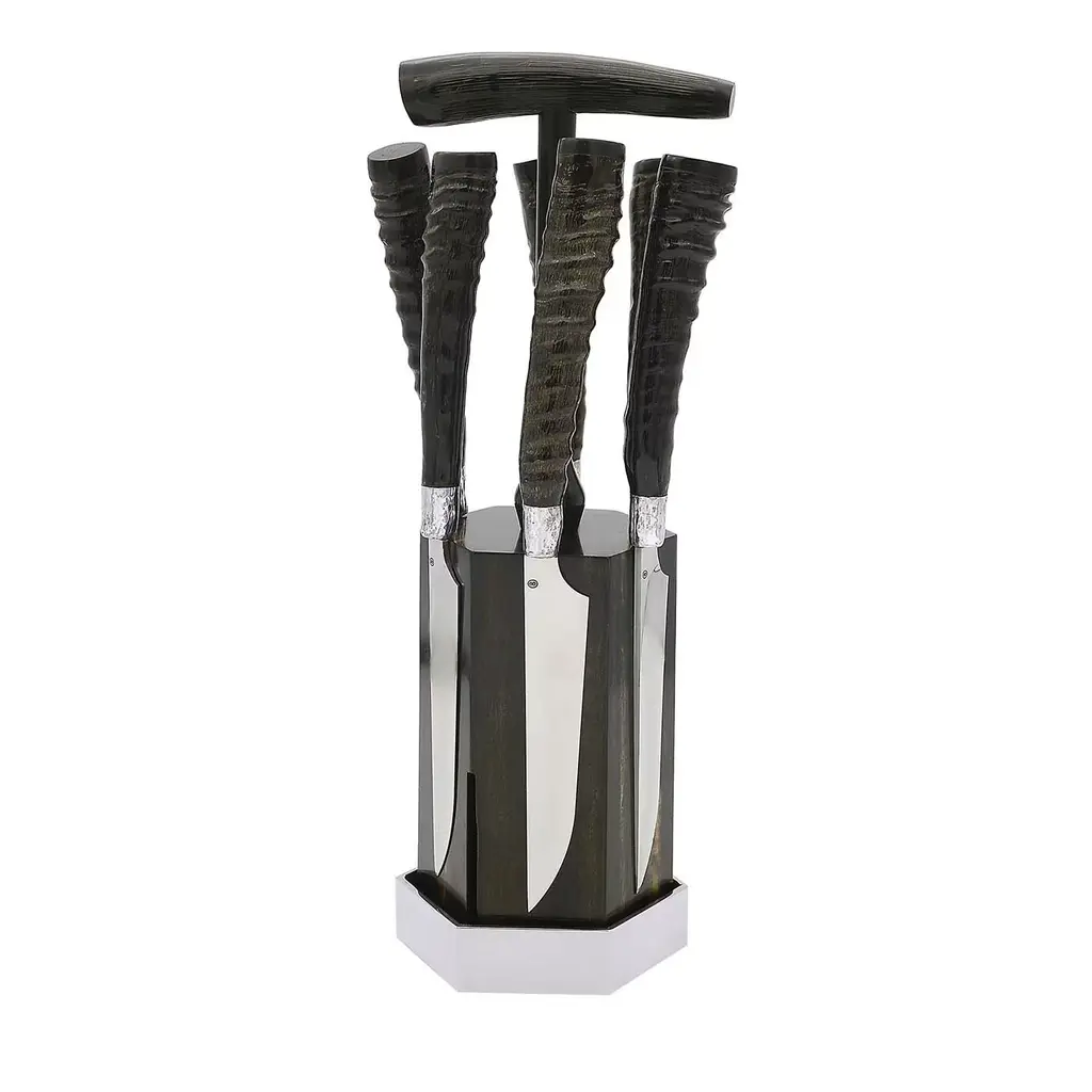 This magnetic knife block is crafted from amaranth and ebony wood. Its kudu horn handle matches the handles of the six forged steak knives, making the set a truly special addition to your kitchen. Complete with a knife locking system for safe transportation, the Amaranth and Ebony Knife Block is a must-have for serious chefs with a taste for sophistication.