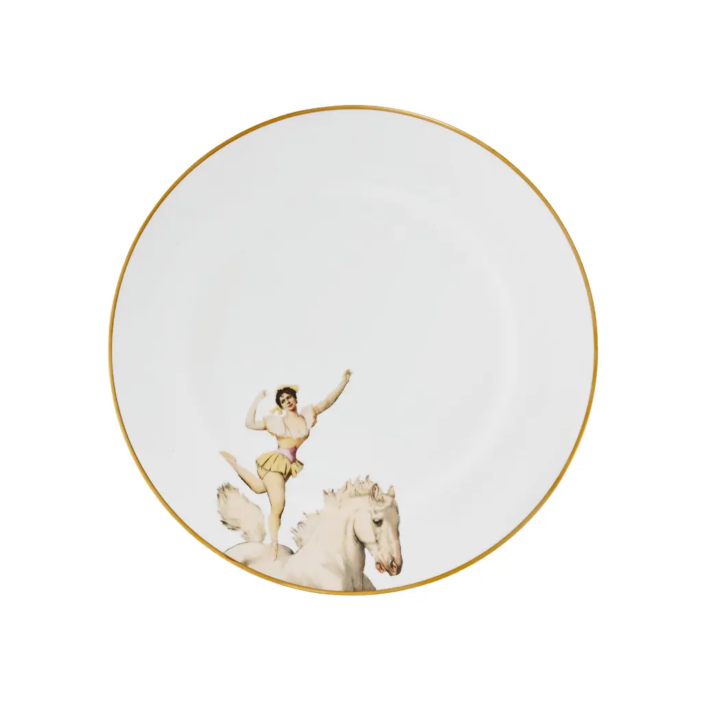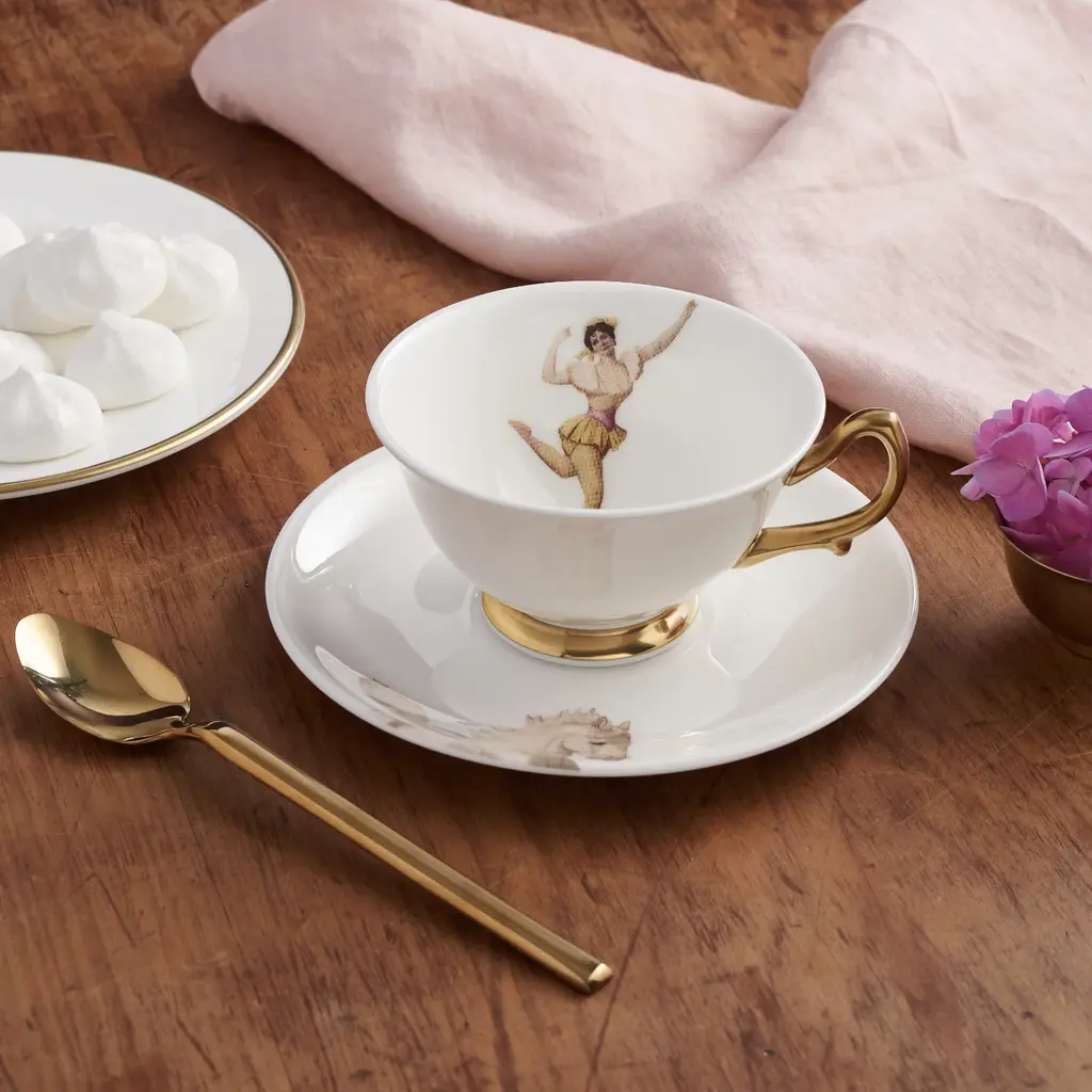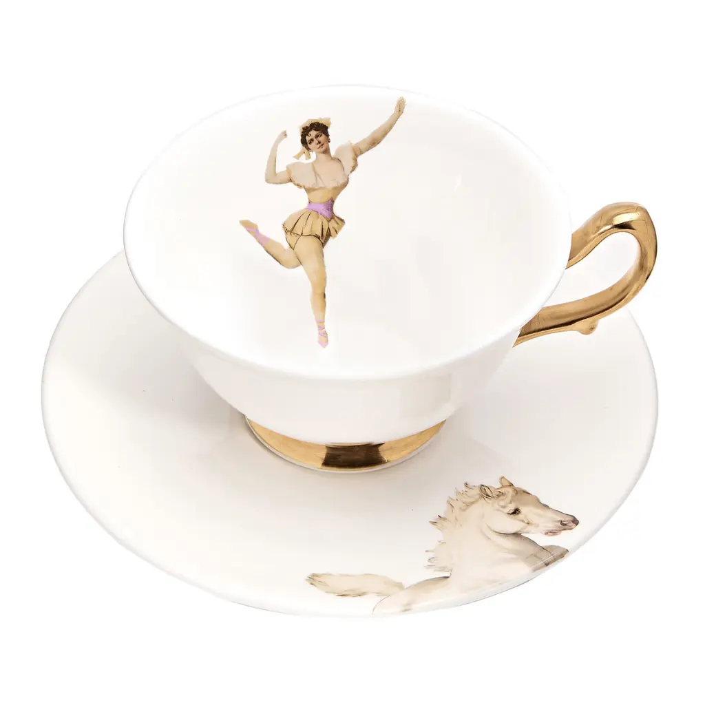 Exquisitely handcrafted fine bone china teacup and saucer featuring The Amazing Miss Rose from the Melody Rose's The Show Must Go On collection.Features hand painted 22kt burnished gold for a luxurious and dishwasher friendly finish. In her elegant ballerina outfit, Miss Rose combines beauty and bravery with her amazing acrobatic feats on horseback.Taking its influence from vintage Circus posters and celebrating the thrill of live performance, 'The Show Must Go On' brings the extravagant costumes, colours and buzz of the Big Top straight to the table.Perfect for any occasion, makes a delightful gift on its own or mix, match and layer Melody Rose pieces to create a unique set.