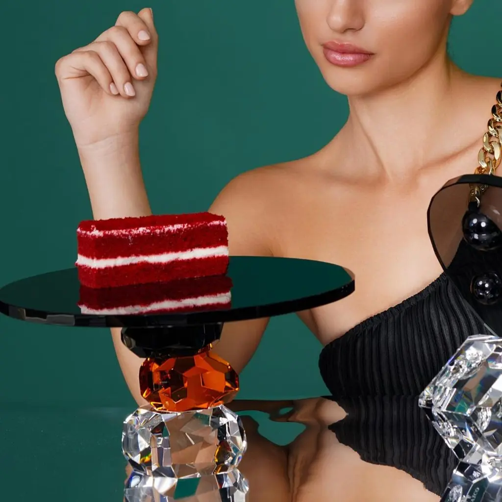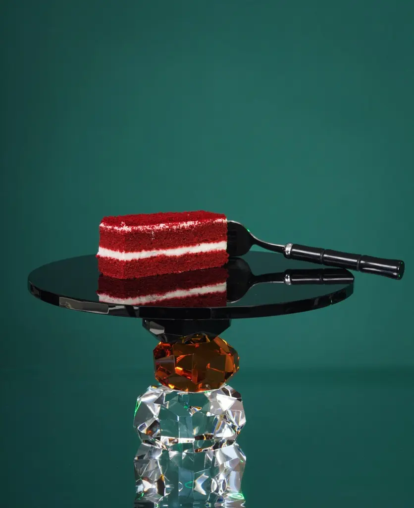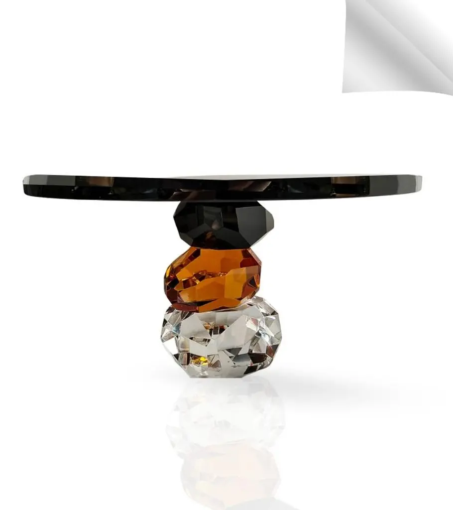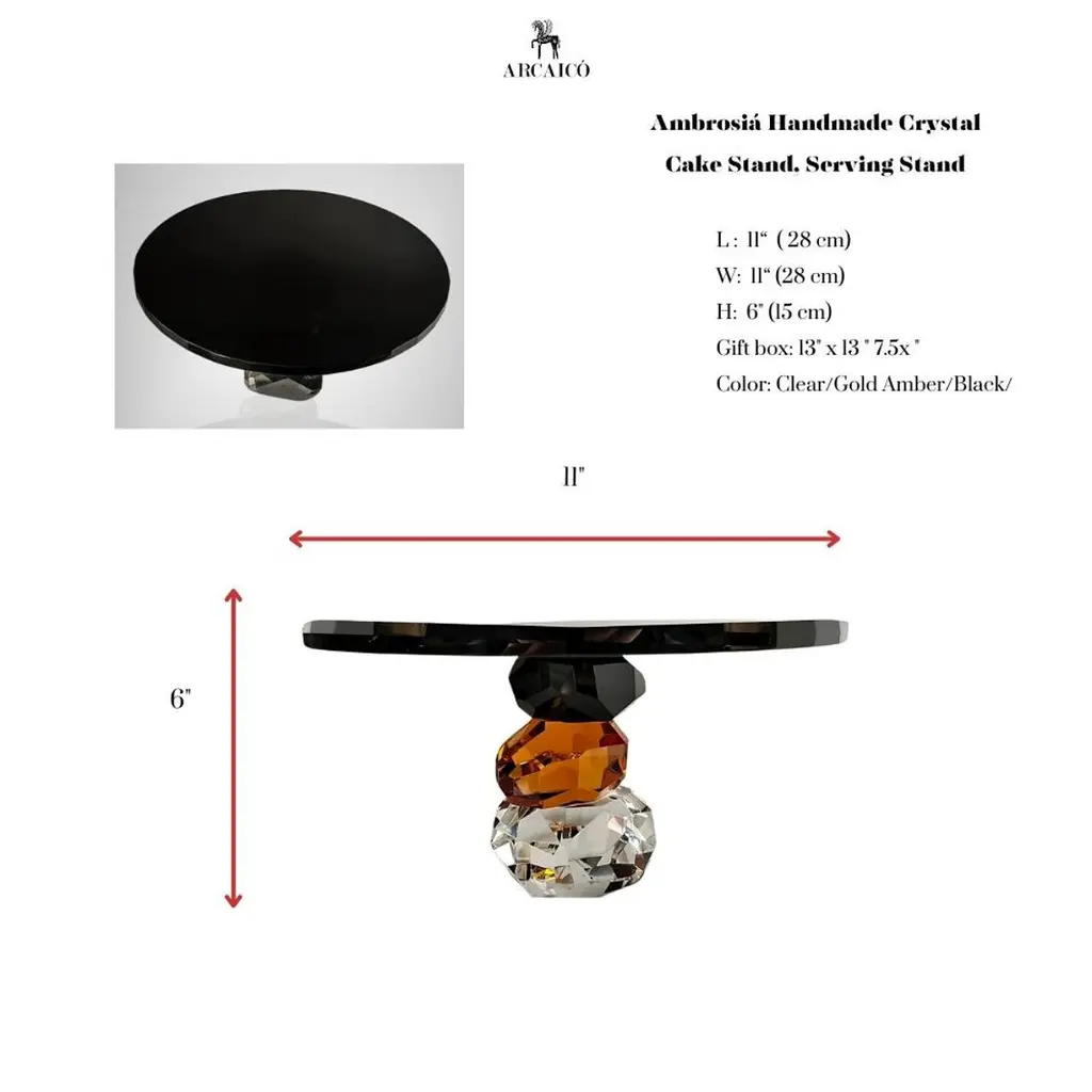 Ambrosiá Handmade Crystal Cake Stand – Black, Clear & Amber Elegant Dessert Display for Weddings, Events & Home DécorElevate your dessert presentation with the Ambrosiá Handmade Crystal Cake Stand, a striking serving piece that blends black, clear, and amber crystal into an unforgettable design. Handcrafted by skilled artisans, this artisan crystal cake stand combines timeless craftsmanship with modern elegance, making it the perfect luxury centerpiece for any occasion.This high-end crystal dessert stand is ideal for displaying cakes, pastries, cupcakes, and sweet treats at weddings, birthdays, anniversaries, and formal events. The bold contrast of rich black and warm amber hues with luminous clear crystal creates a visually stunning presentation that draws the eye and enhances your table décor.The Ambrosiá stand features a sturdy, stable base and a spacious, elevated surface—perfect for use as a cake platter, pastry tray, or elegant party display. Whether you're hosting a lavish gathering or enjoying a cozy celebration at home, this hand-cut crystal cake stand adds an artistic and luxurious touch to any setting.
