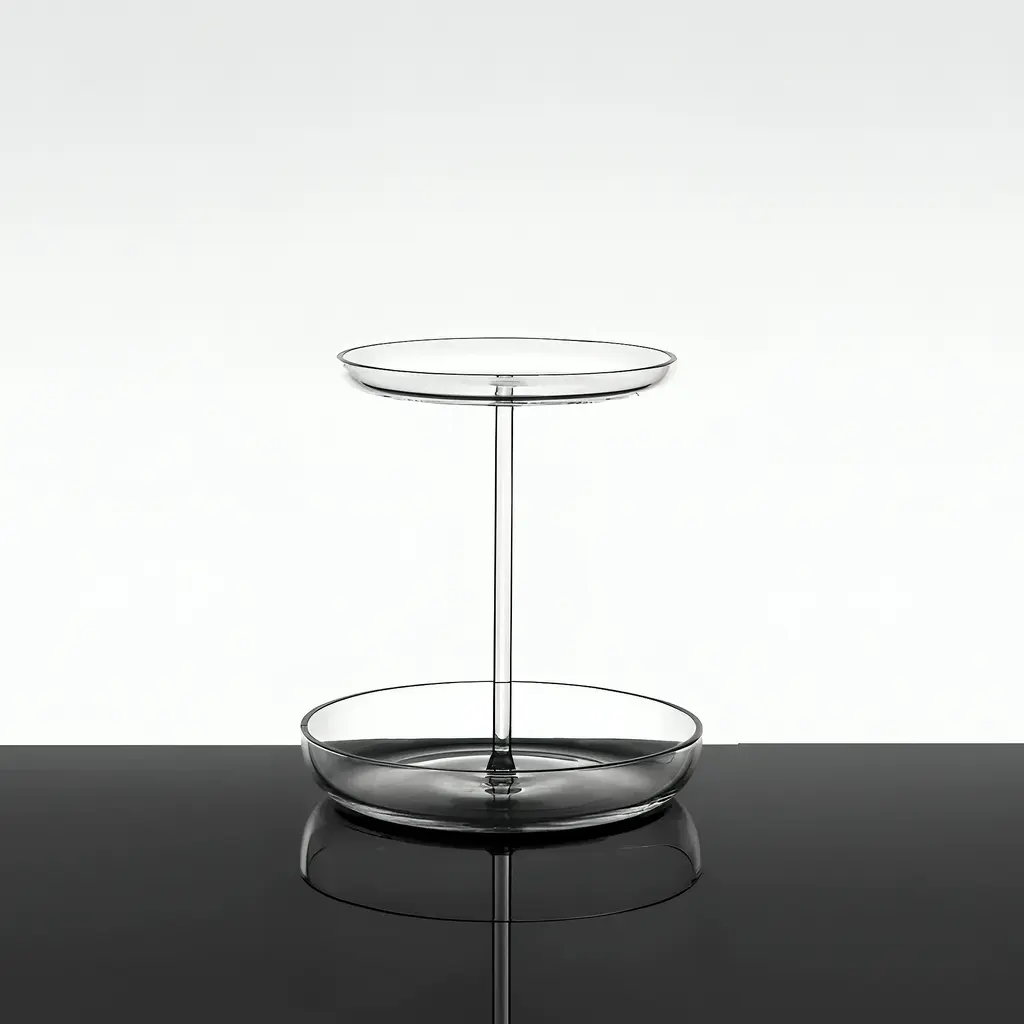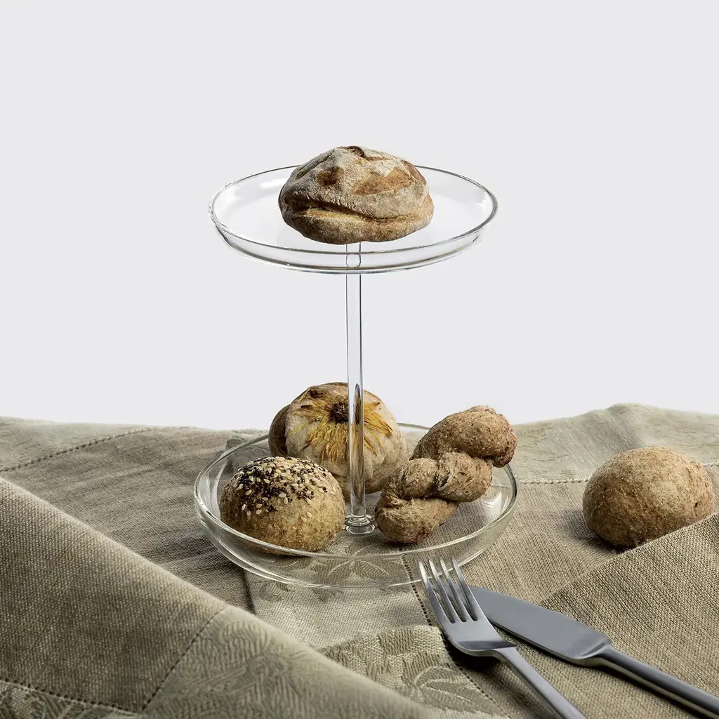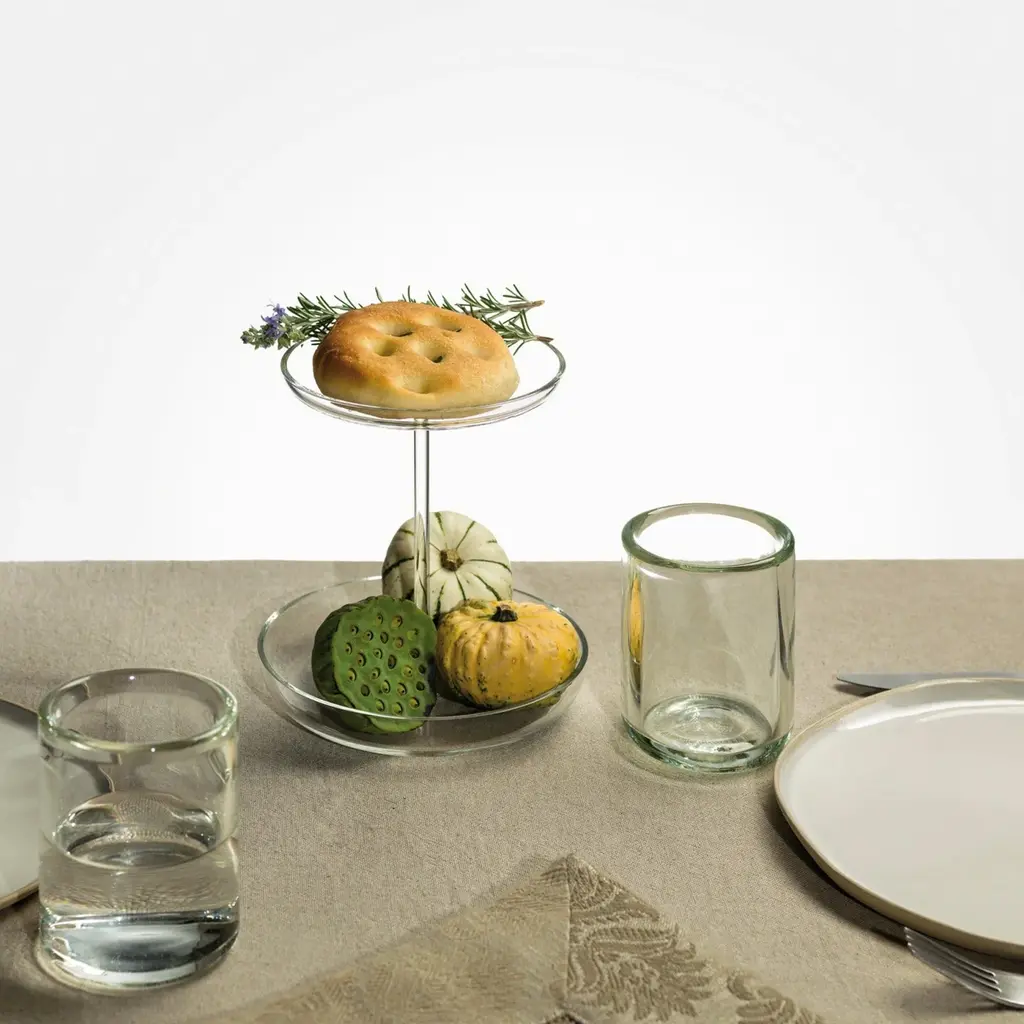 Bread and soft cheese, cookies and jam, fruit with honey, or small cakes. The world is your oyster with the Ambrosia Glass Stand with Flat Cup. Designed by Matteo Giarrè, an Italian industrial designer who specializes in creative glassware and tableware, this stand is elegantly simple and versatile. It features two dishes, one larger on the base and a smaller one at the top. Both of them provide room for a wide range of food, from savory to sweet. Plus, the borosilicate glass is not only tougher than regular glass, but also safe to clean in the dishwasher. A great choice to serve individual portions or to create a centerpiece on a dining table, the Ambrosia Glass Stand with Flat Cup is perfect for everyday use or special occasions.