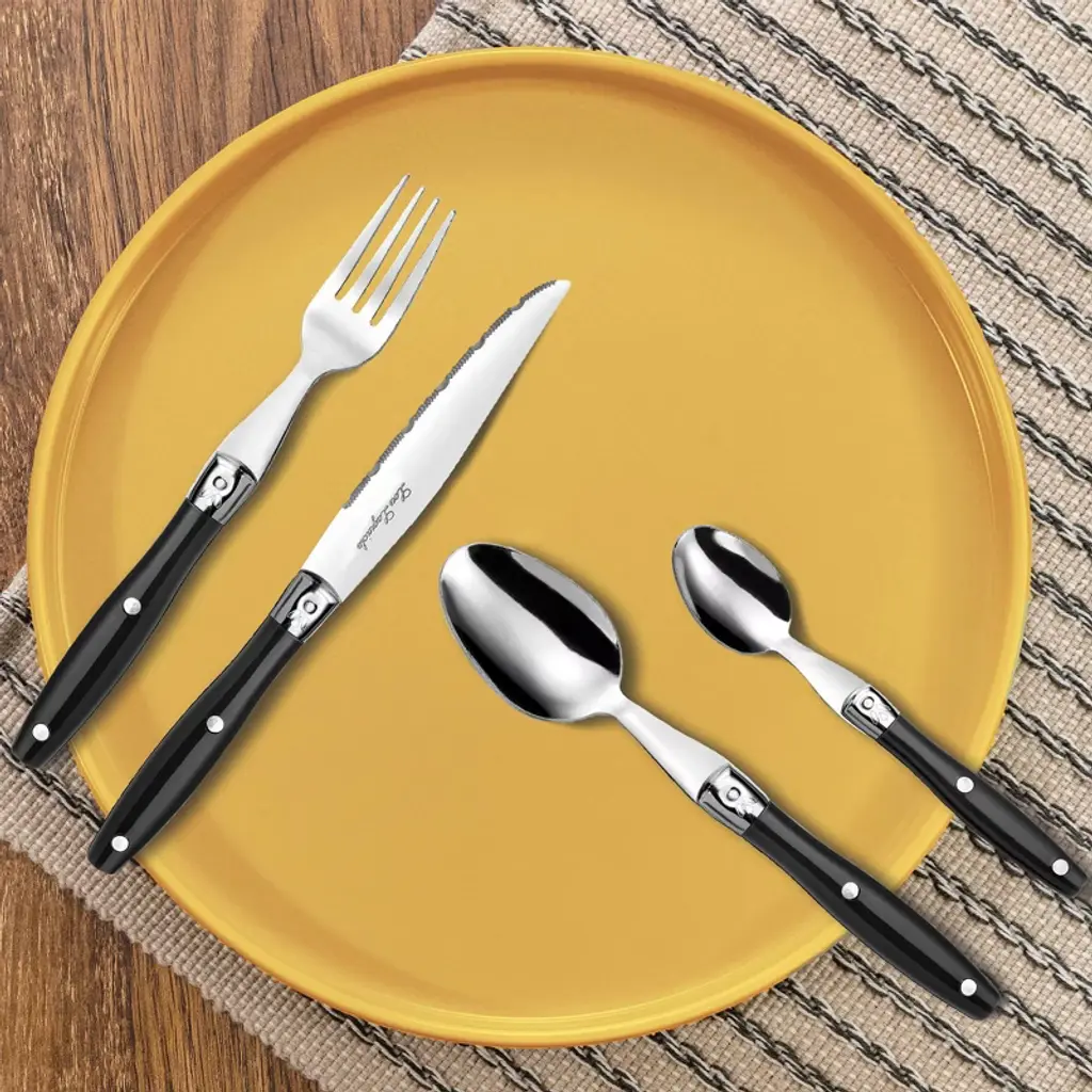 The Comptoir flatware set features a classic shape and riveted handles. The traditional look contributes to a timeless appeal, ensuring the set remains stylish across different dining settings. Suitable for various occasions, from formal dinners to casual gatherings, adding a touch of French charm to any table. Made of 18/0 stainless steel and dishwasher safe using mild detergents.
