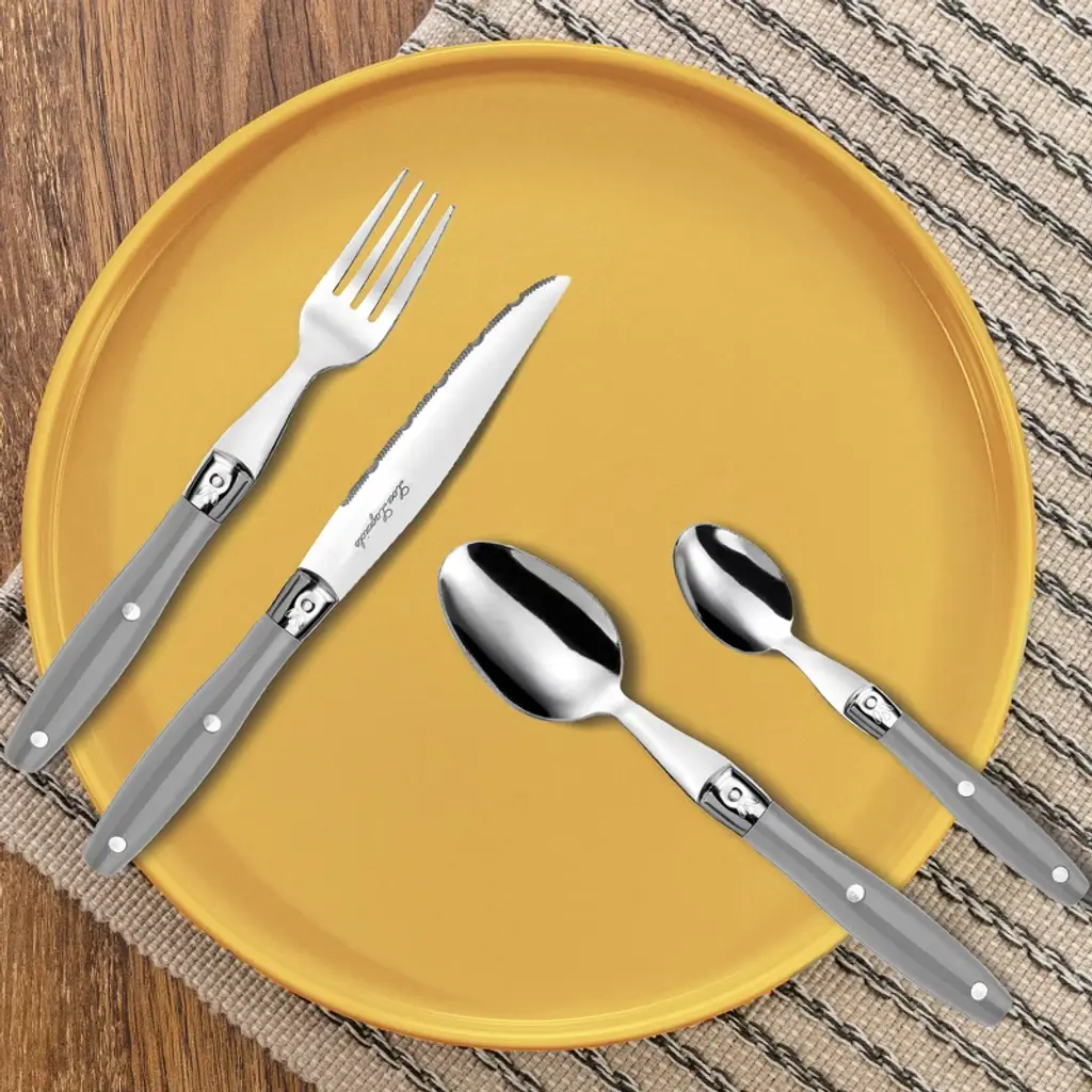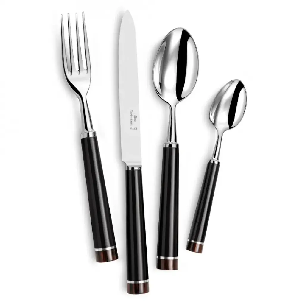The Comptoir flatware set features a classic shape and riveted handles. The traditional look contributes to a timeless appeal, ensuring the set remains stylish across different dining settings. Suitable for various occasions, from formal dinners to casual gatherings, adding a touch of French charm to any table. Made of 18/0 stainless steel and dishwasher safe using mild detergents.