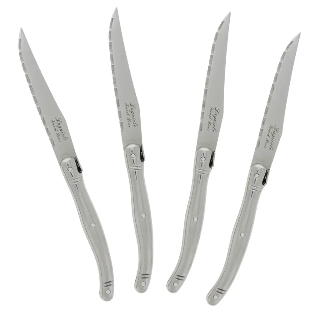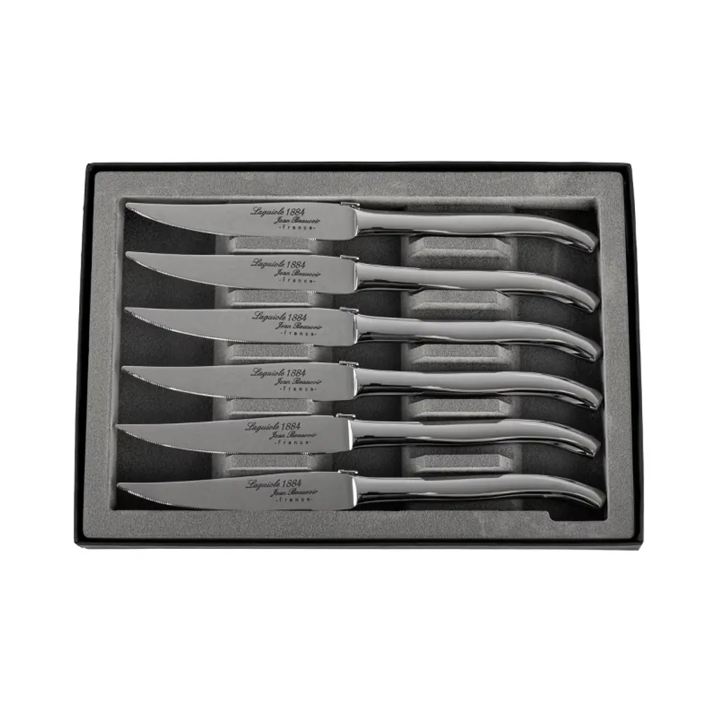 This Lou Laguiole steak set, Alphonse, is made in Thiers, France, adhering to the rich cutlery tradition of the region known for its craftsmanship and expertise. This set gives your table a modern ambiance. Each knife in the set is designed to be perfectly balanced, ensuring a comfortable and precise cutting experience. The set comes packaged in a wooden gift box, providing an elegant and convenient storage solution. Made of 13/0 stainless steel and dishwasher safe.