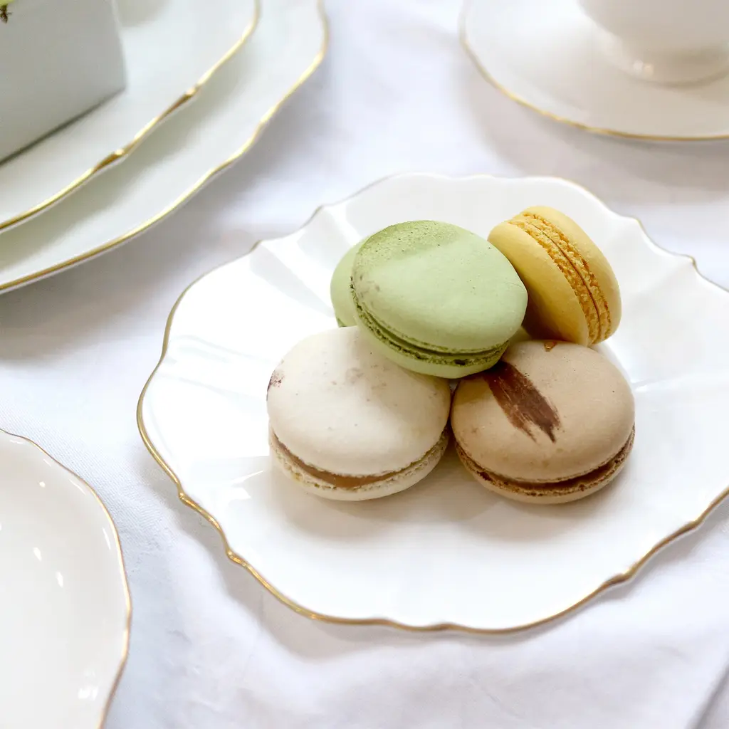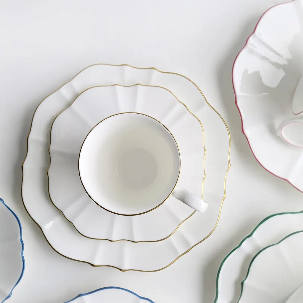 Timeless and fresh, the Amelie Brushed Gold Collection features creamy dinnerware with intricate scallops and delicate gold trim.