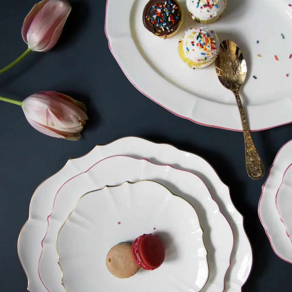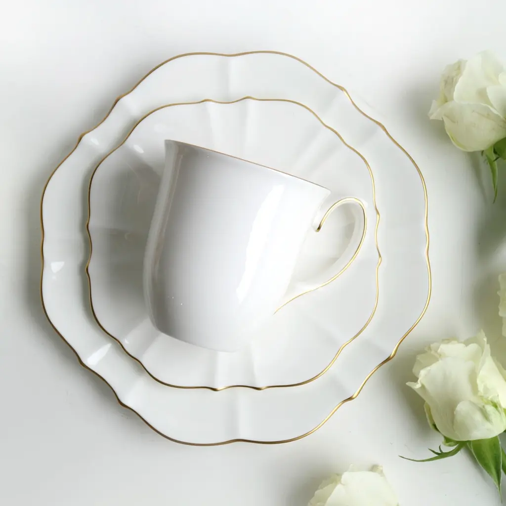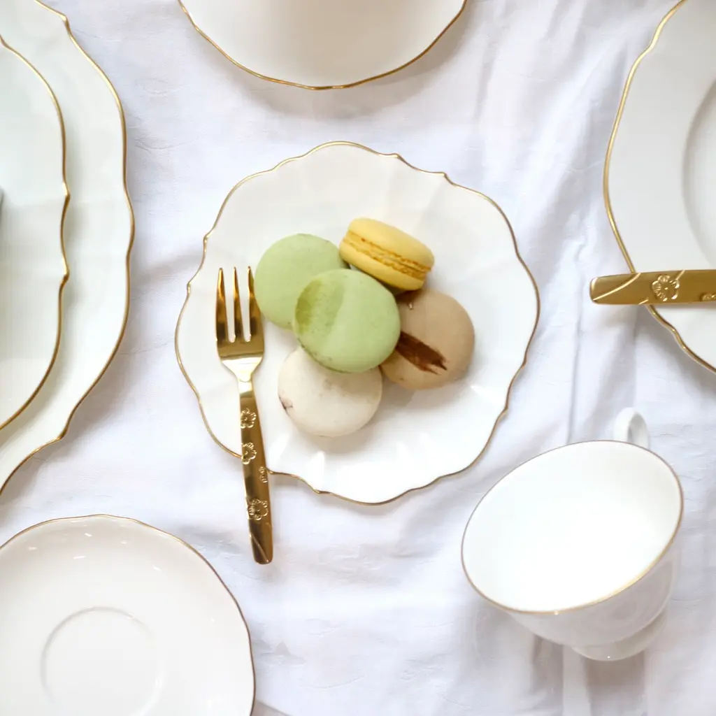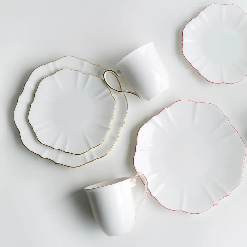 This collection takes its inspiration from the beloved movie character and melds the contradictions of her personality into one unique collection. The Amelie Collection features beautifully shaped dishes that truly stand out but counters this with the striking simplicity of white of Fine Bone China with a hand-painted colour as an accent for the rim. Full of possibilities for mixing and matching among different colours to create one’s own personal set.Ideal for serving bread and butterOne plate per box Fine Bone China with 24K Gold hand-painted rimAmelie Collection
