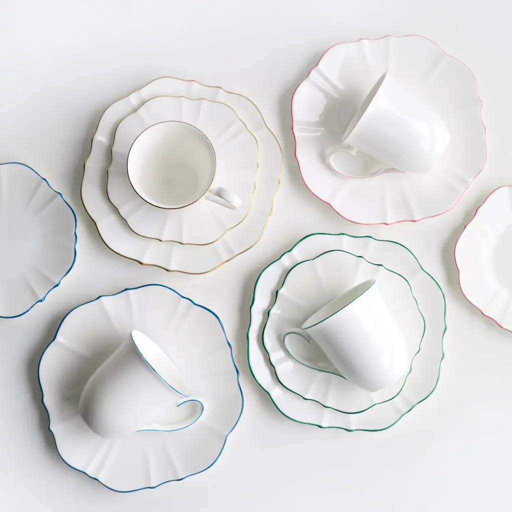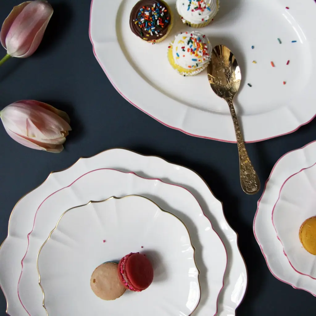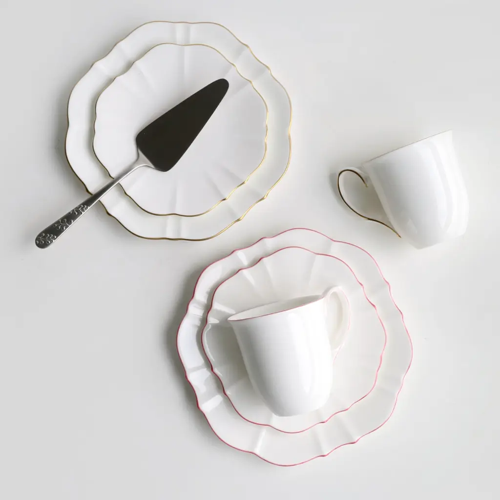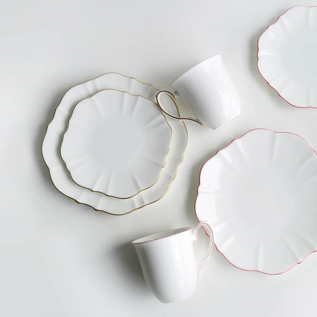 This collection takes its inspiration from the beloved movie character and melds the contradictions of her personality into one unique collection. The Amelie Collection features beautifully shaped dishes that truly stand out but counters this with the striking simplicity of white of Fine Bone China with a hand-painted colour as an accent for the rim. Full of possibilities for mixing and matching among different colours to create one’s own personal set.Ideal for salads and dessertsOne plate per box Fine Bone China with 24K Gold hand-painted rimAmelie Collection