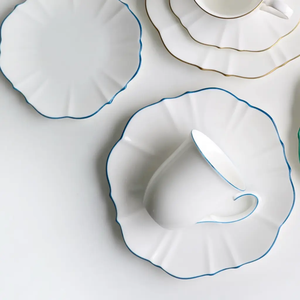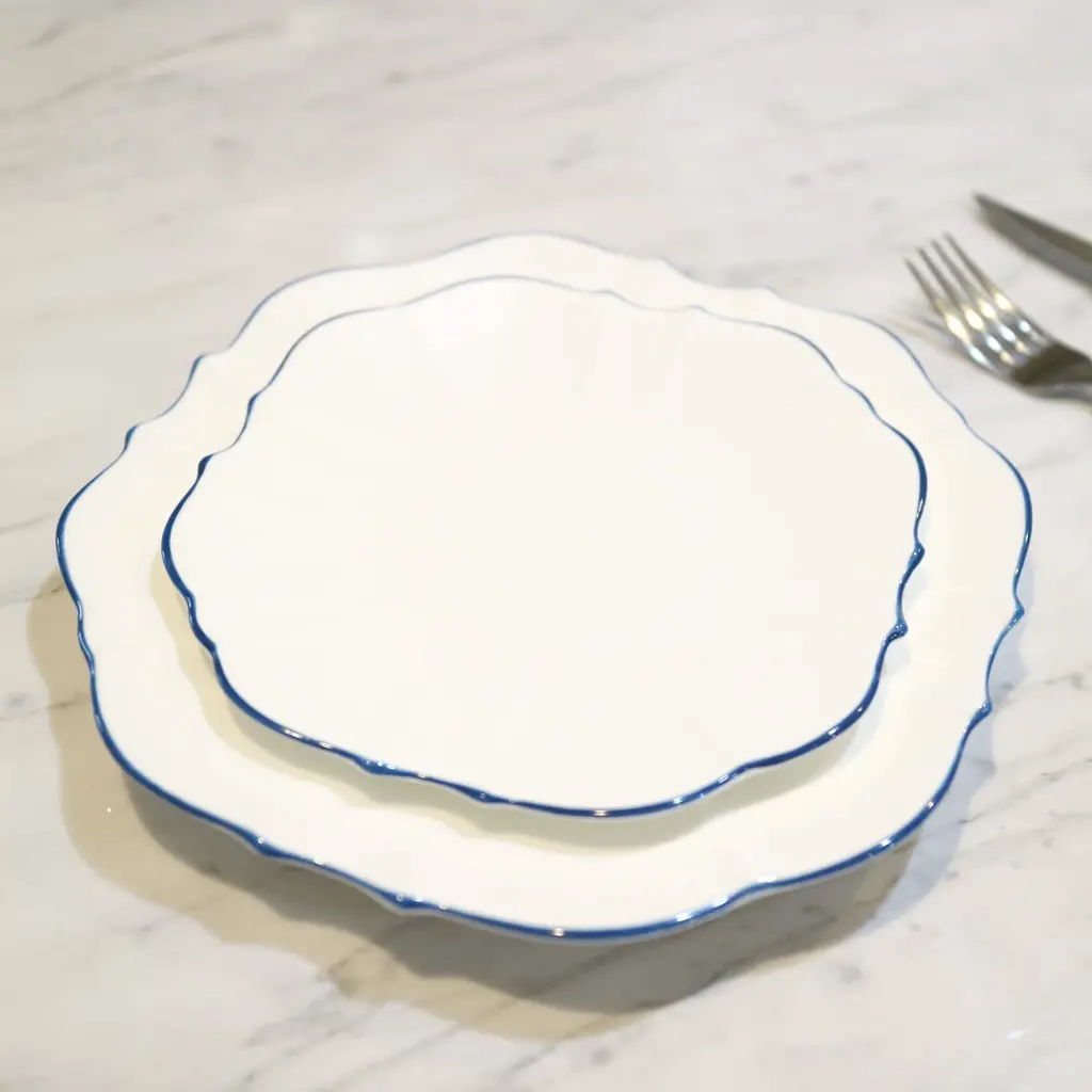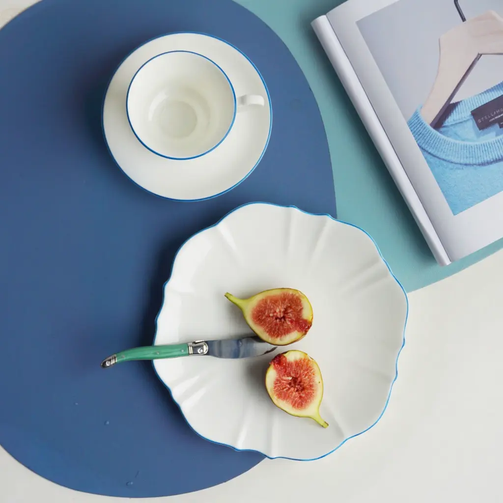 This collection takes its inspiration from the beloved movie character and melds the contradictions of her personality into one unique collection. The Amelie Collection features beautifully shaped dishes that truly stand out but counters this with the striking simplicity of white of Fine Bone China with a hand-painted colour as an accent for the rim. Full of possibilities for mixing and matching among different colours to create one’s own personal set.Ideal for salad and dessertsOne plate per box Fine Bone China with hand-painted rimAmelie Collection
