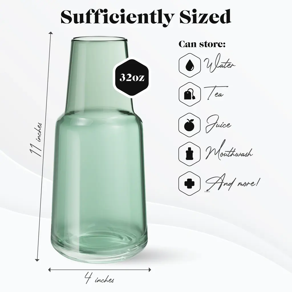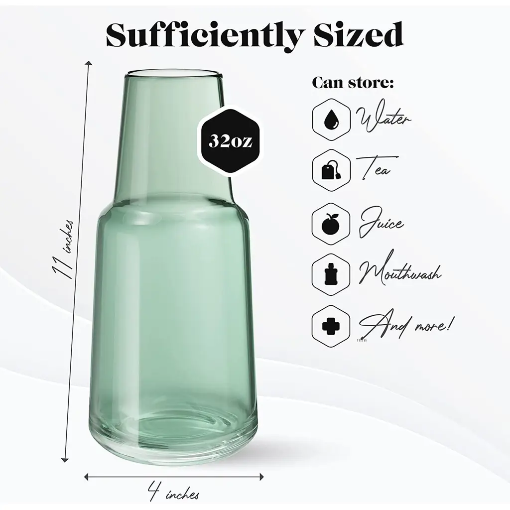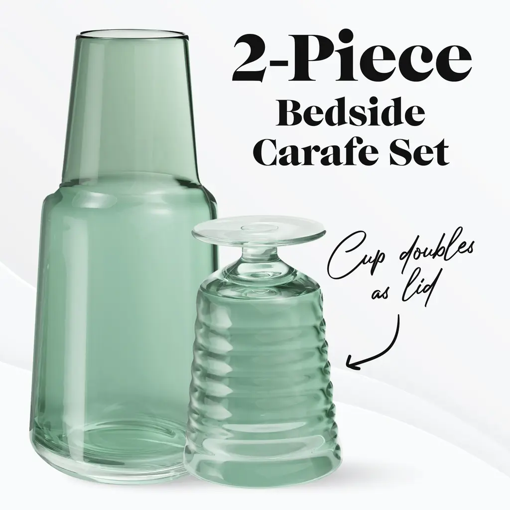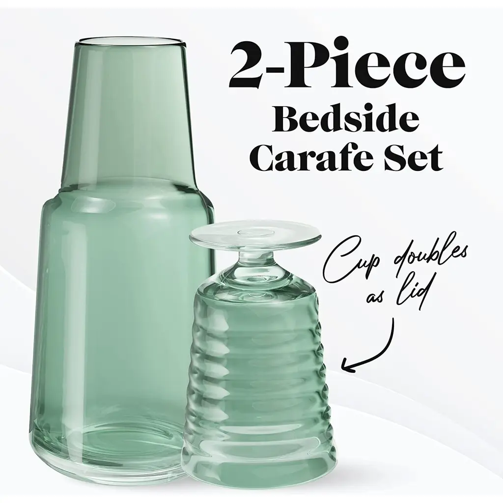 American Atelier Bedside 32 oz Water Carafe with Footed Glass/Lid - NewKeep a drink by your bedside and your nightstand clutter free with the American Atelier 2-piece water Carafe. This convenient, multi-purpose carafe is cleverly designed with a handy drinking glass inverted on top, serving as a lid to keep water clean for drinking while saving precious space. As such, it will make a classy complement to a bedside table, buffet table, on top of the fireplace mantle or on a shelf inside your China closet. This carafe provides sufficient space for storing water and furnishing you with a drink when you need to quench your thirst in the middle of the night. It can also be used to serve other drinks, such as herbal tea, wine or refreshing juice - with any of your meals. Beautifully smooth colored glass decanter, the American Atelier carafe will create increased visual interest and appeal wherever it's displayed. Artistically designed to coordinate beautifully with any interior design, the American Atelier Night Carafe will make a great gift for birthdays, holidays, bridal showers, weddings, and housewarmings. Comes in various colors FEATURES:MATERIAL:WHAT'S IN THE BOX:PACKAGING: Retail Packaging