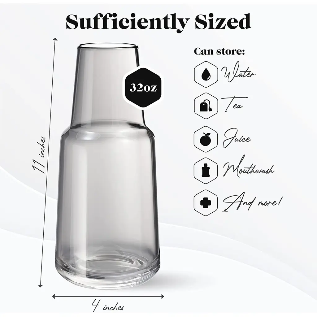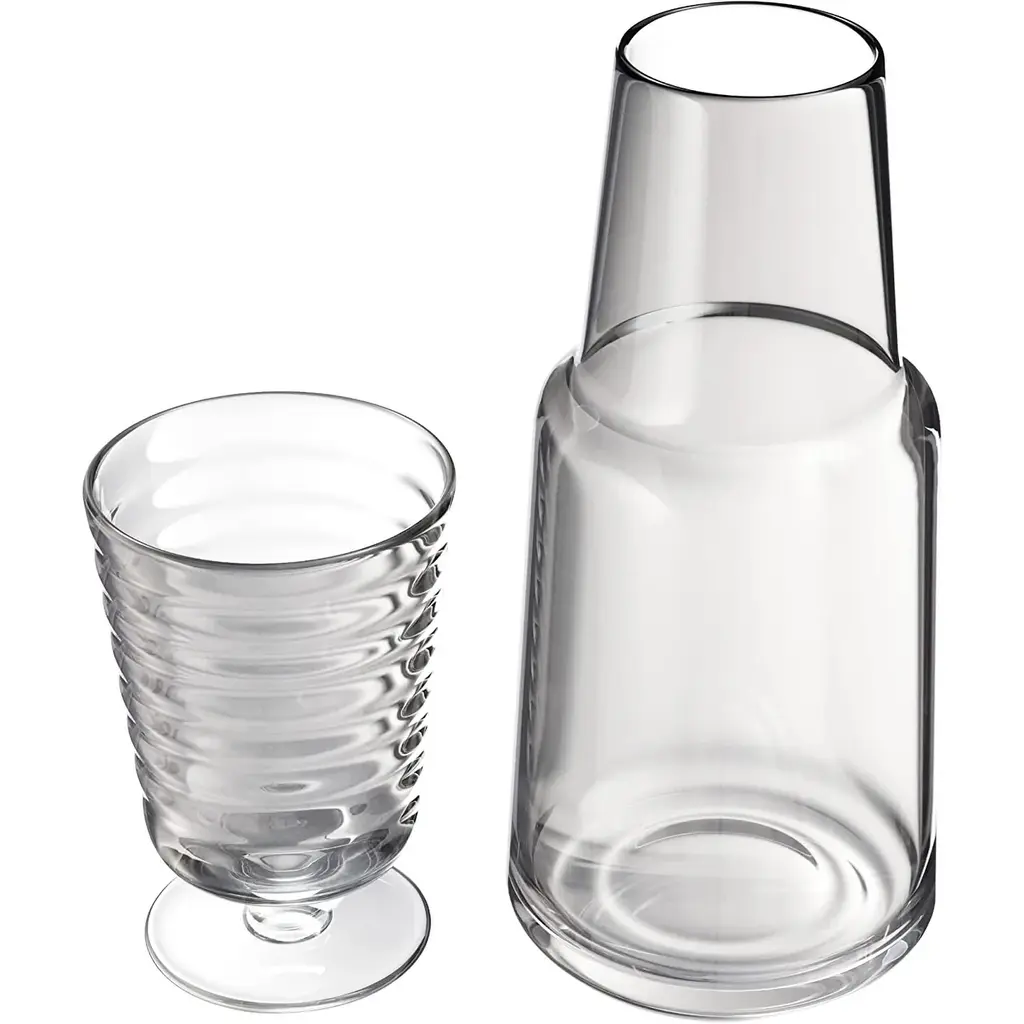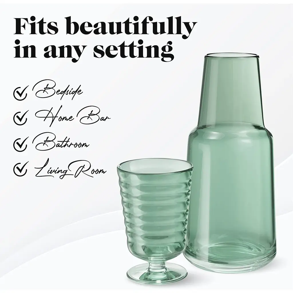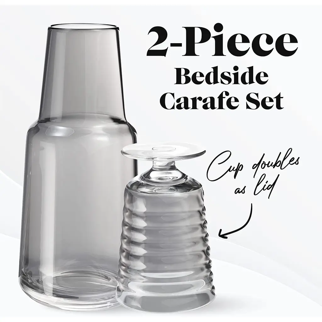American Atelier Bedside 32 oz Water Carafe with Footed Glass/Lid - NewKeep a drink by your bedside and your nightstand clutter free with the American Atelier 2-piece water Carafe. This convenient, multi-purpose carafe is cleverly designed with a handy drinking glass inverted on top, serving as a lid to keep water clean for drinking while saving precious space. As such, it will make a classy complement to a bedside table, buffet table, on top of the fireplace mantle or on a shelf inside your China closet. This carafe provides sufficient space for storing water and furnishing you with a drink when you need to quench your thirst in the middle of the night. It can also be used to serve other drinks, such as herbal tea, wine or refreshing juice - with any of your meals. Beautifully smooth colored glass decanter, the American Atelier carafe will create increased visual interest and appeal wherever it's displayed. Artistically designed to coordinate beautifully with any interior design, the American Atelier Night Carafe will make a great gift for birthdays, holidays, bridal showers, weddings, and housewarmings. Comes in various colors FEATURES:MATERIAL:WHAT'S IN THE BOX:PACKAGING: Retail Packaging