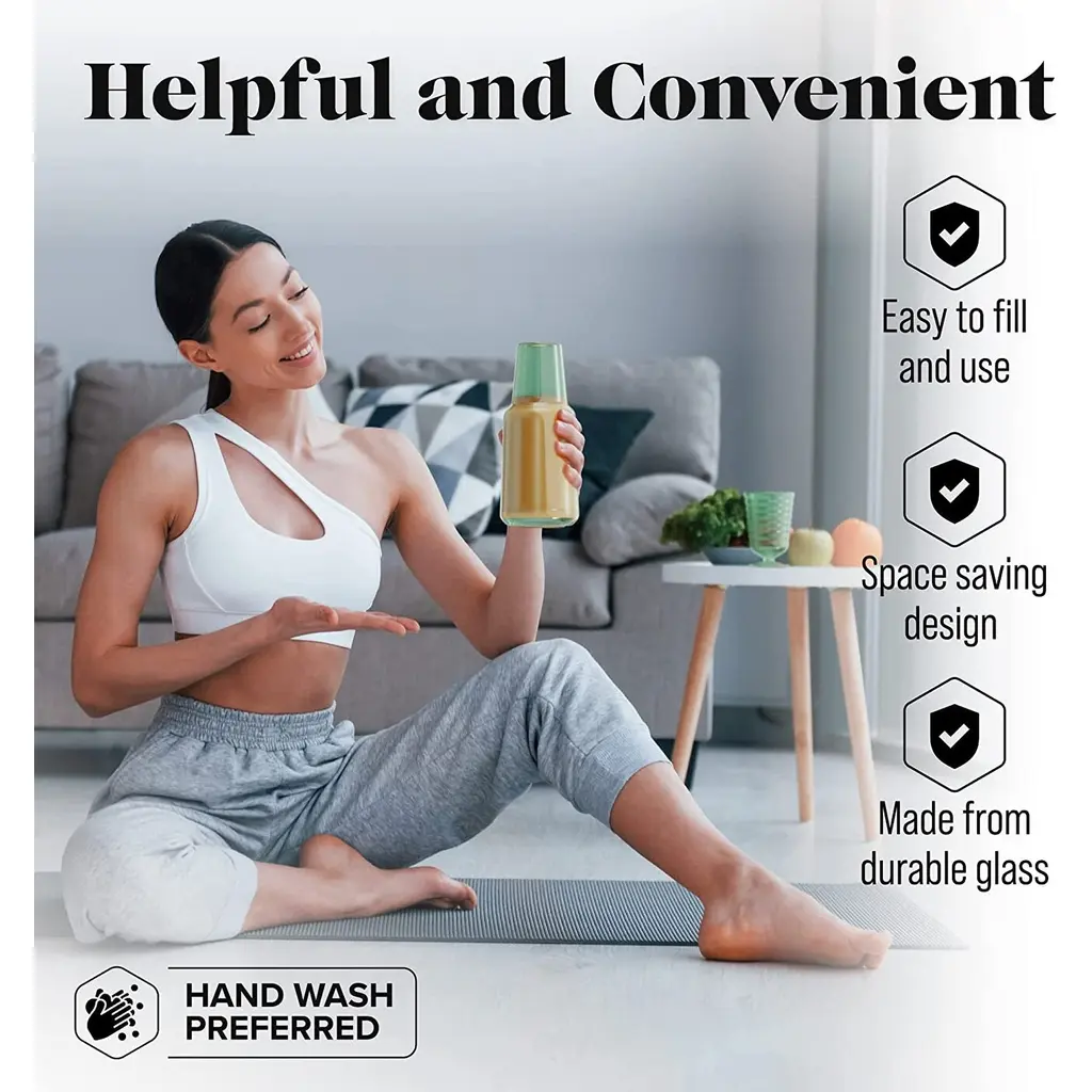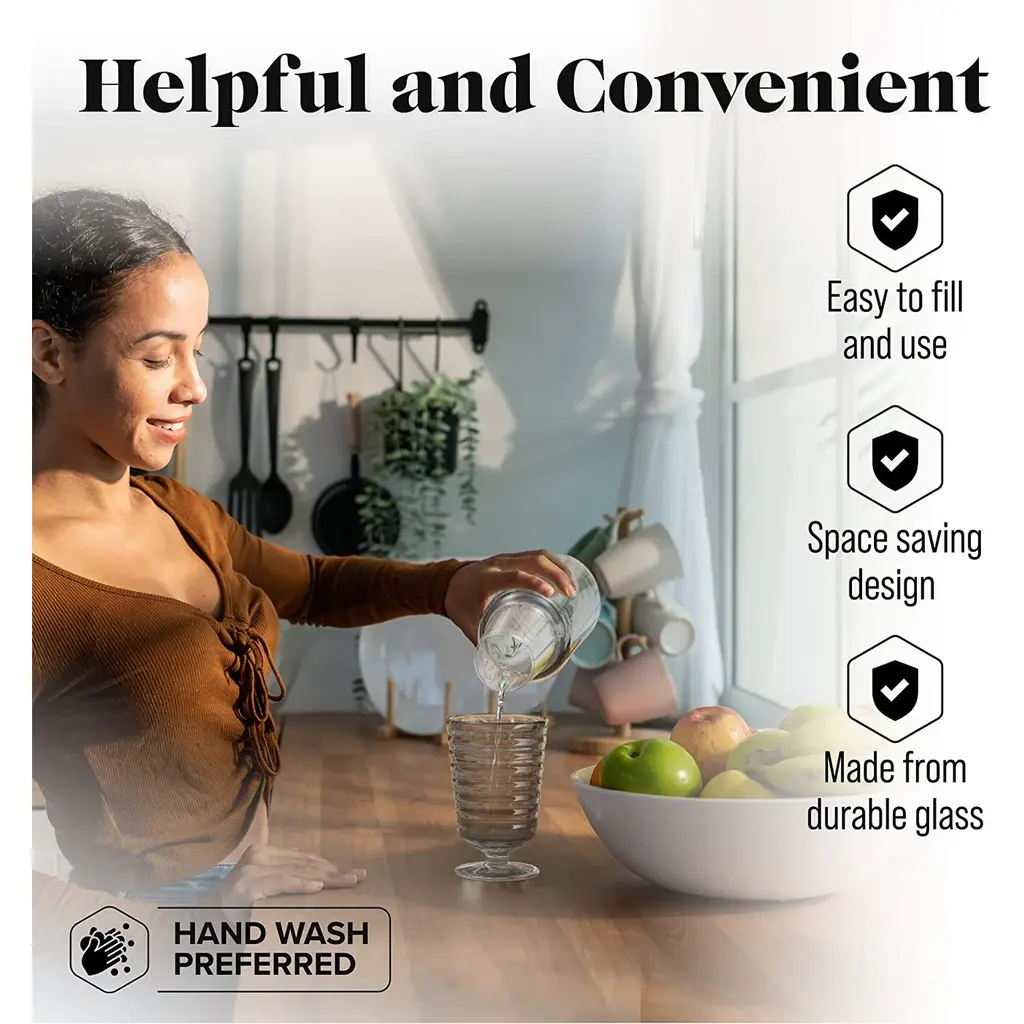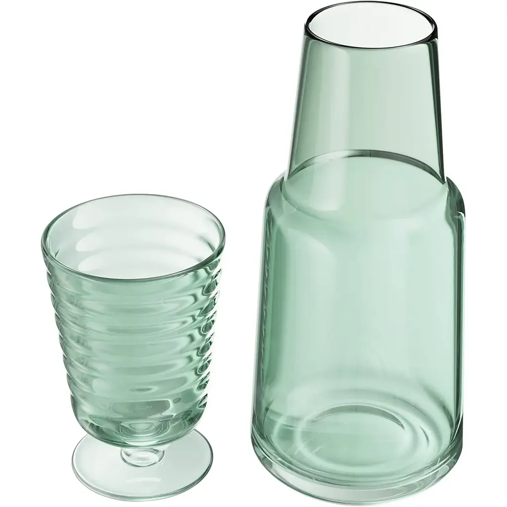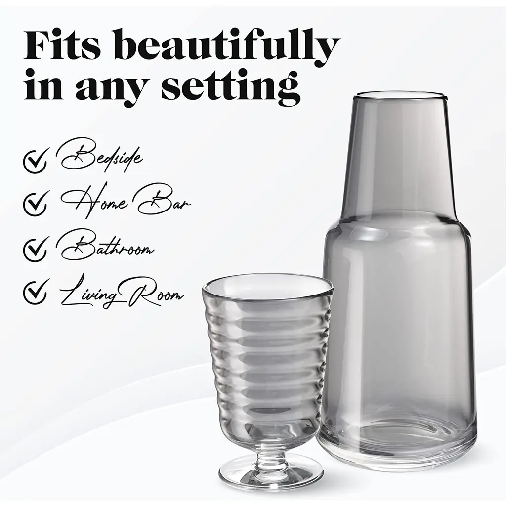 American Atelier Bedside 32 oz Water Carafe with Footed Glass/Lid - NewKeep a drink by your bedside and your nightstand clutter free with the American Atelier 2-piece water Carafe. This convenient, multi-purpose carafe is cleverly designed with a handy drinking glass inverted on top, serving as a lid to keep water clean for drinking while saving precious space. As such, it will make a classy complement to a bedside table, buffet table, on top of the fireplace mantle or on a shelf inside your China closet. This carafe provides sufficient space for storing water and furnishing you with a drink when you need to quench your thirst in the middle of the night. It can also be used to serve other drinks, such as herbal tea, wine or refreshing juice - with any of your meals. Beautifully smooth colored glass decanter, the American Atelier carafe will create increased visual interest and appeal wherever it's displayed. Artistically designed to coordinate beautifully with any interior design, the American Atelier Night Carafe will make a great gift for birthdays, holidays, bridal showers, weddings, and housewarmings. Comes in various colors FEATURES:MATERIAL:WHAT'S IN THE BOX:PACKAGING: Retail Packaging