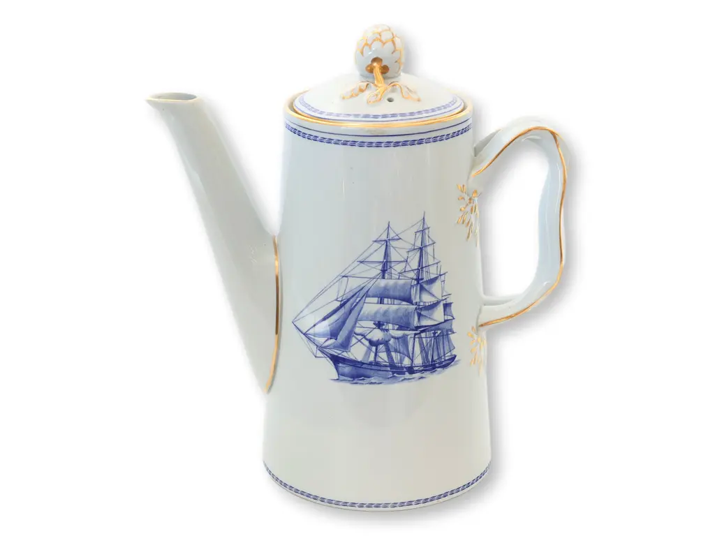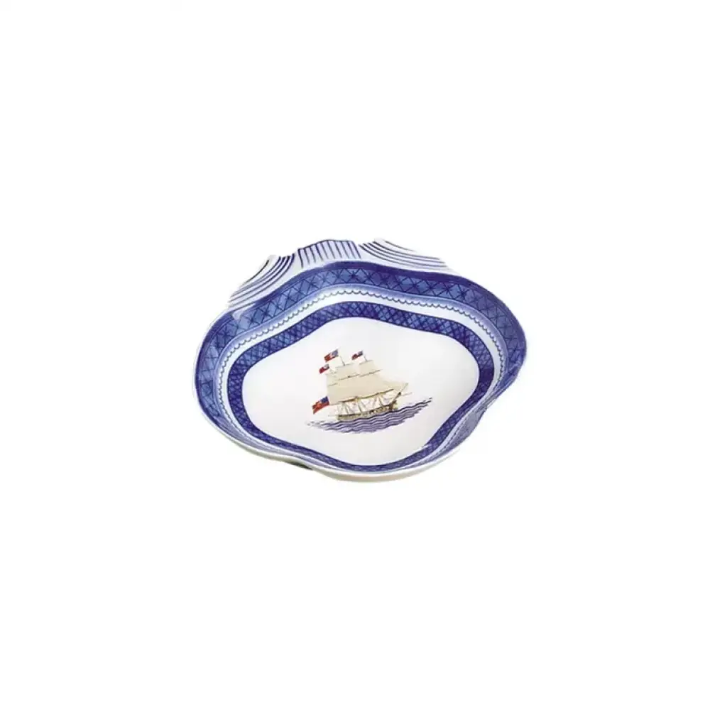 This antique style pitcher features the U.S.S. Constitution sailing ship and patriotic red, white and blue decoration. A favorite with brides, Mottahedeh specializes in luxurious patterns and unique, elegant shapes that are reproduced from china found in museums and historical societies. The patterns feature complex and vibrant colors, and hand-painted gold decoration. The pieces are surprisingly fresh and timely, and look wonderful in both contemporary and traditional dining rooms.