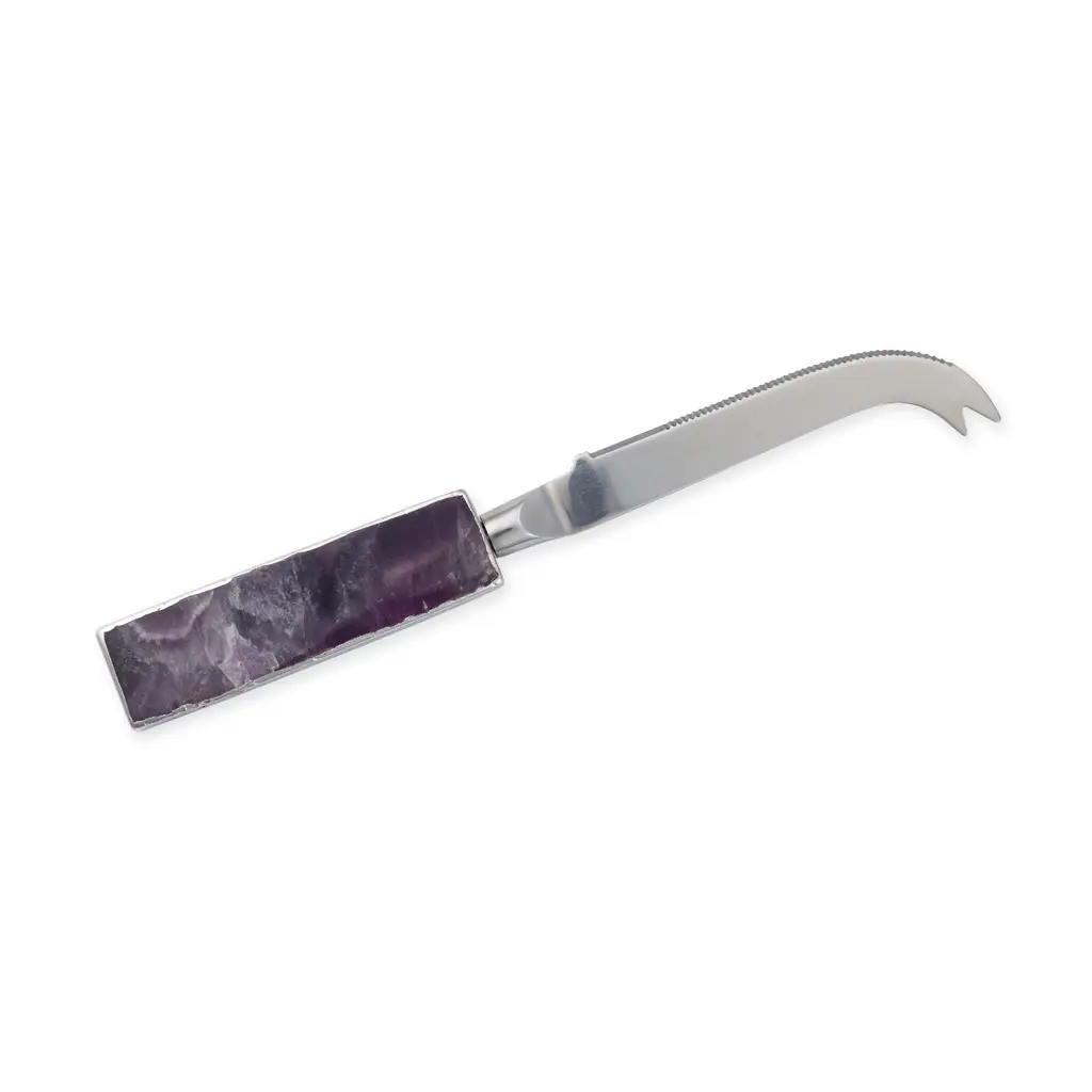 From humble beginnings comes a whole new world of spreader knife pretty. Introducing our latest signature Greatfool crystals joining the fold.Our crystal-handled cheese knives are one-of-a-kind. Complemented by a striking amethyst handle, this silver one is designed to spread all things divine. Think paté, butter, hummus, avo, even honey.Feel calm, restful and contemplative with amethyst's unparalleled ability to heal and protect whenever life throws you a curveball. You’ll elevate your well-being and happy hour with this sexy spreader. Hand-crafted with the cheese eater's peace and happiness in mind.
